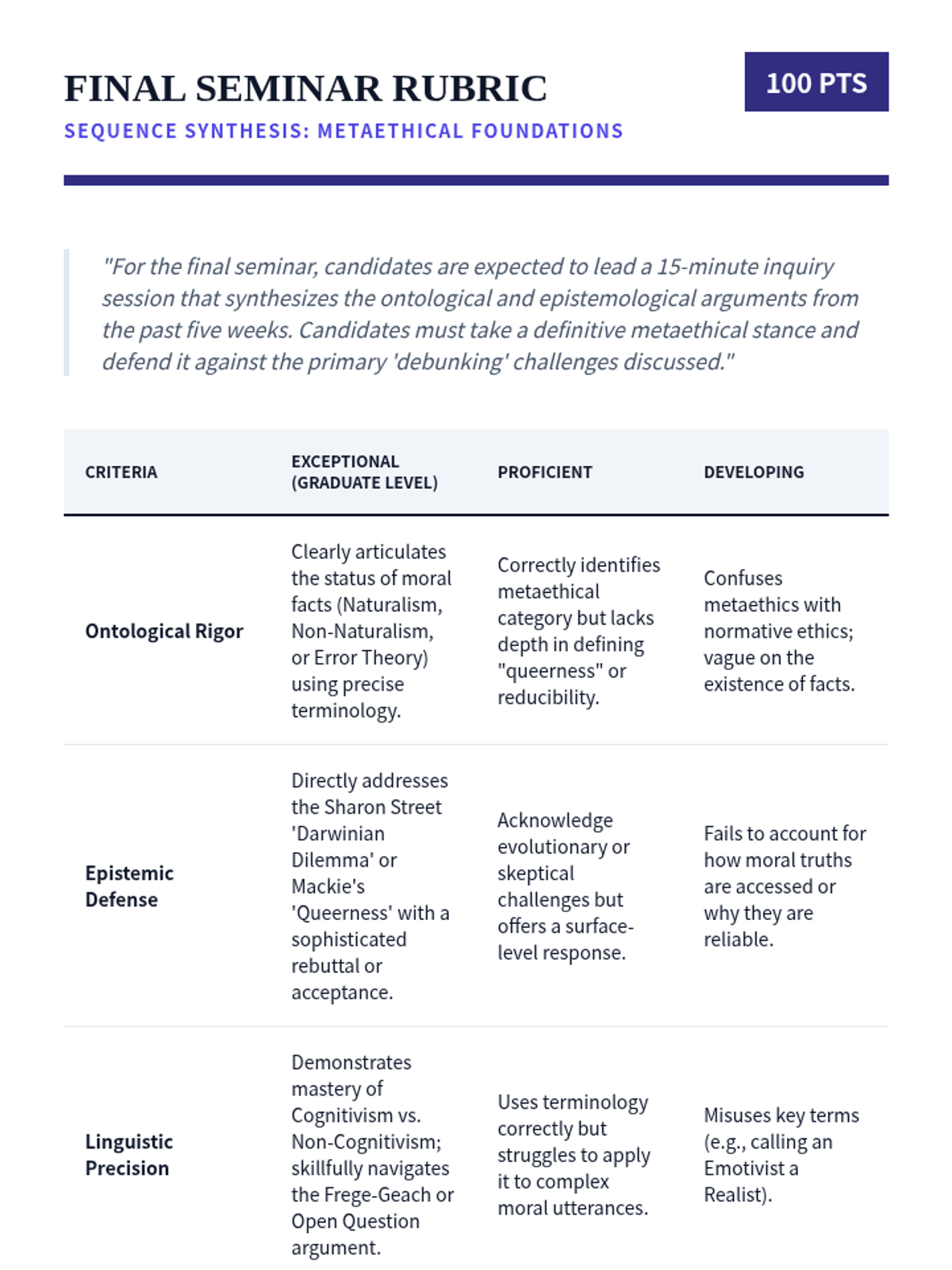 A graduate-level investigation into the metaphysical and epistemic status of moral claims, exploring the tension between moral realism, anti-realism, and the challenges of relativism and evolution.
