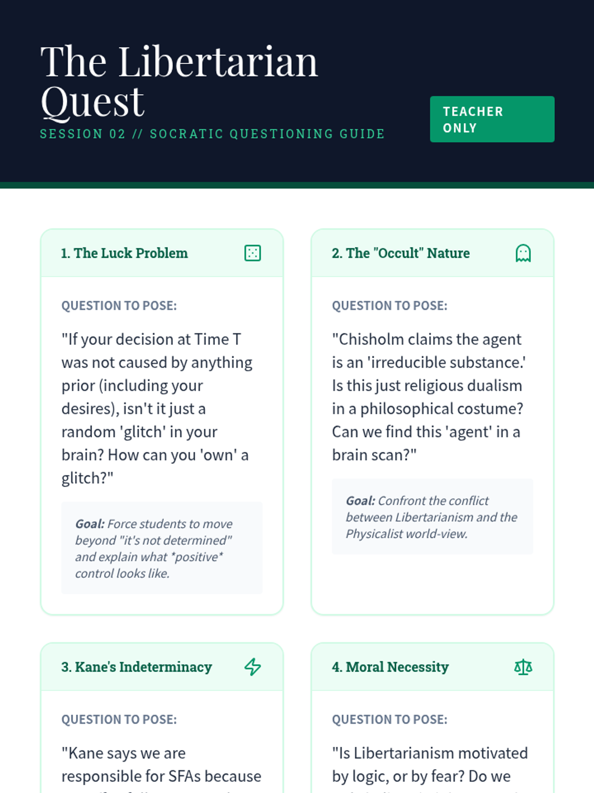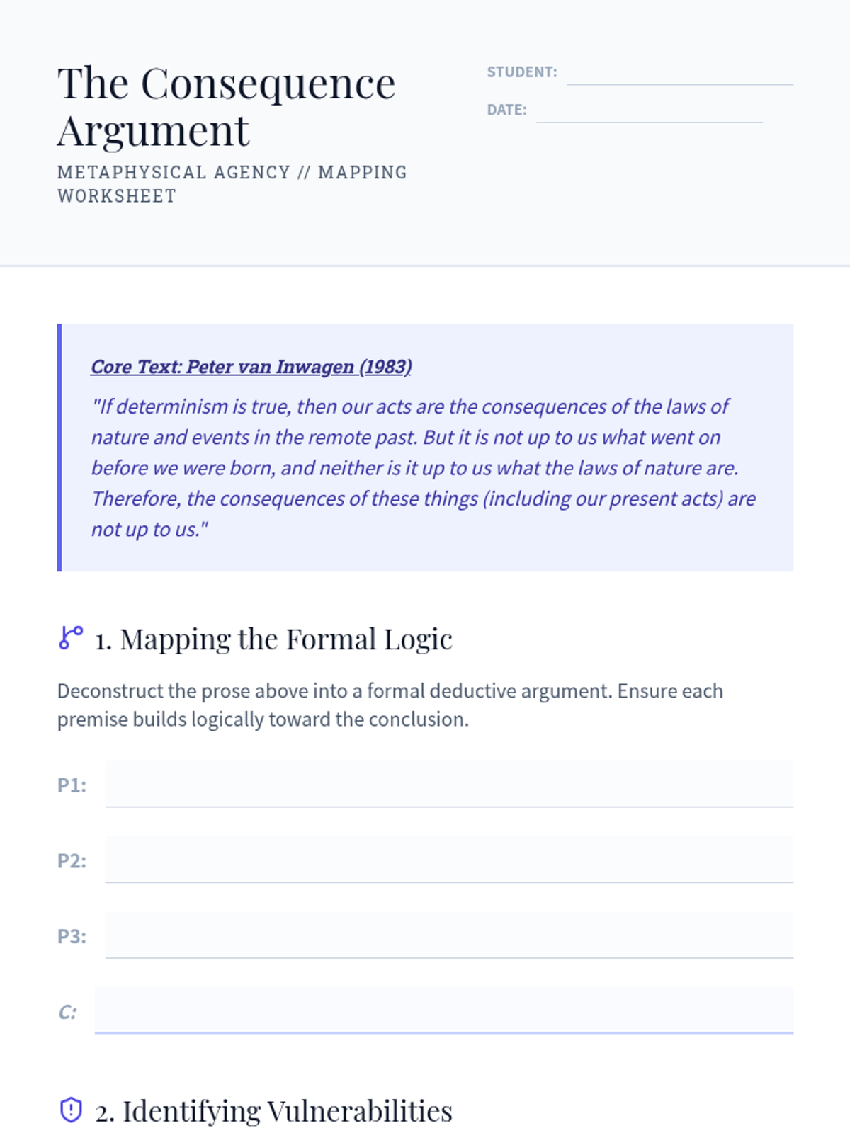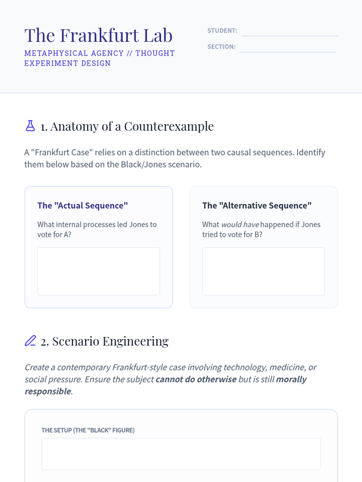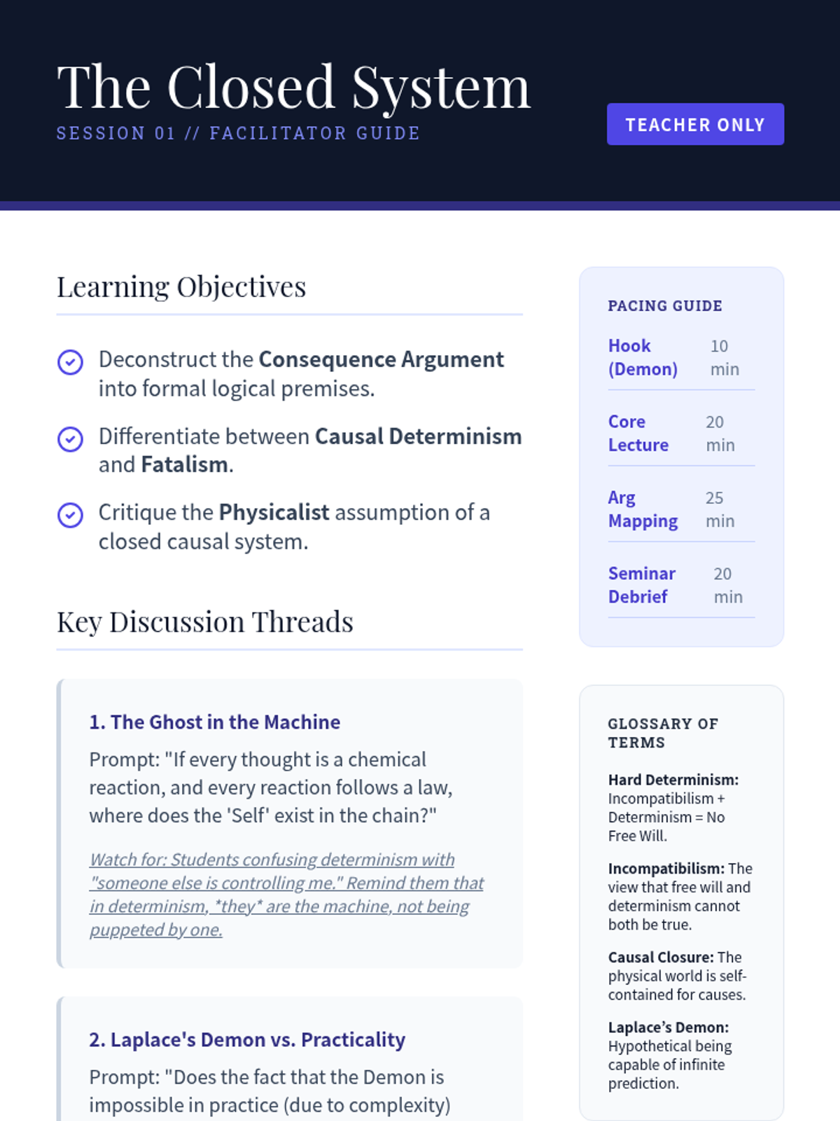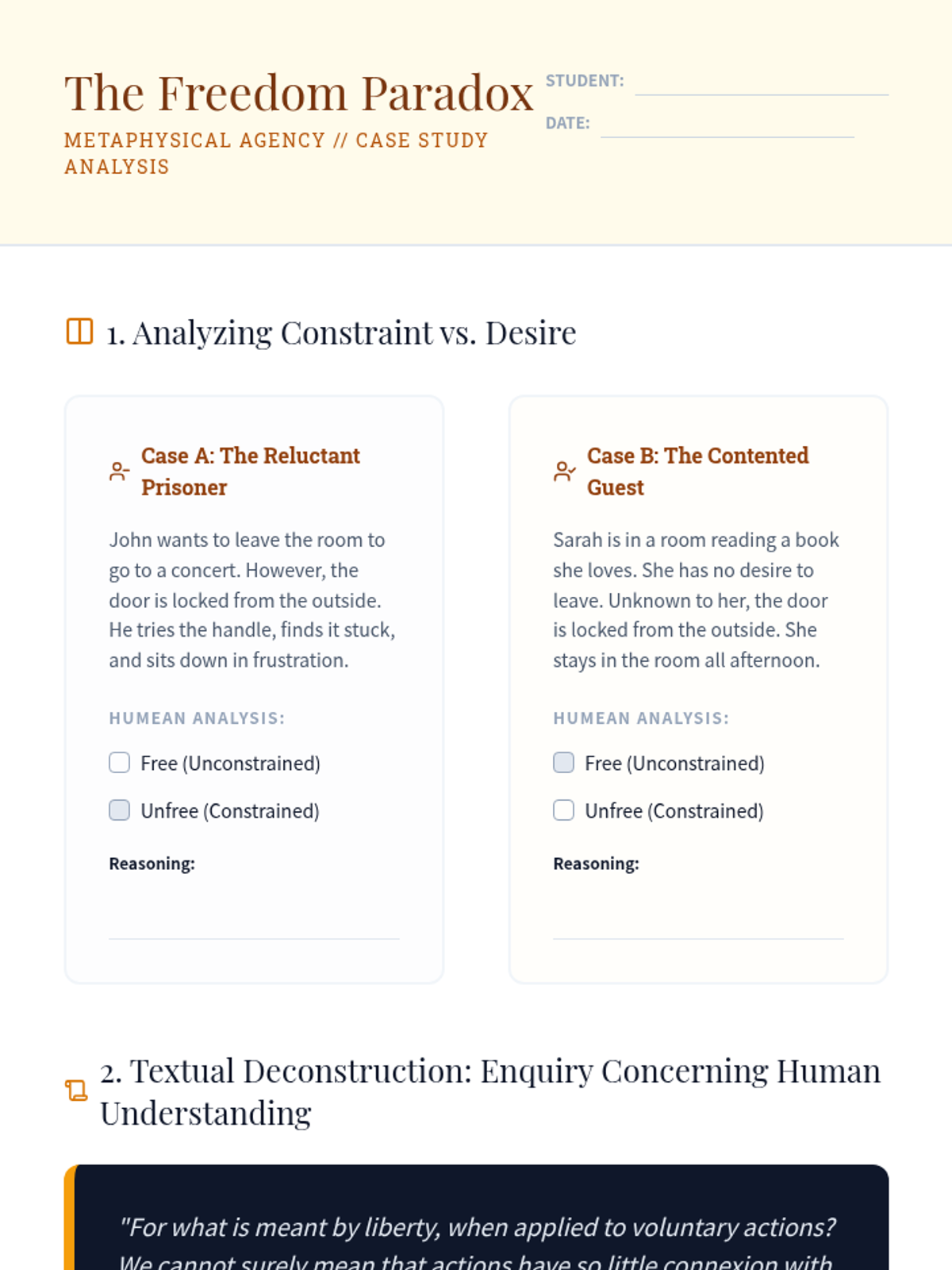 An advanced undergraduate exploration of the metaphysical tension between physical determinism and human agency. Students deconstruct classical and contemporary arguments, from hard determinism and libertarianism to compatibilist solutions and Frankfurt-style counterexamples.