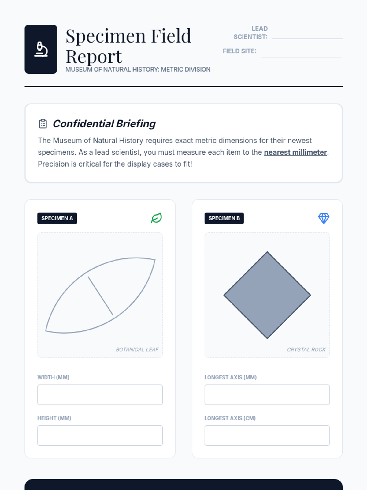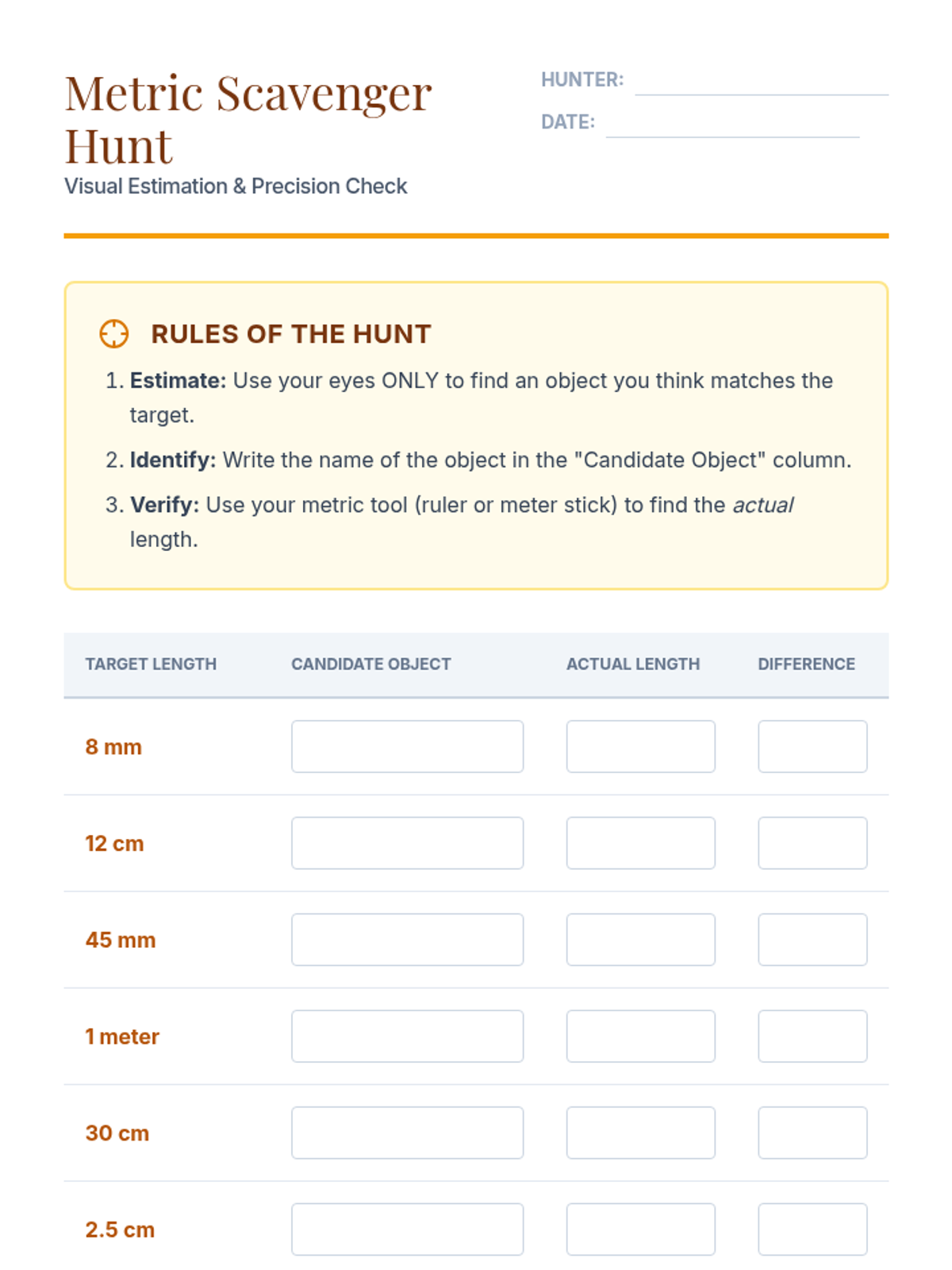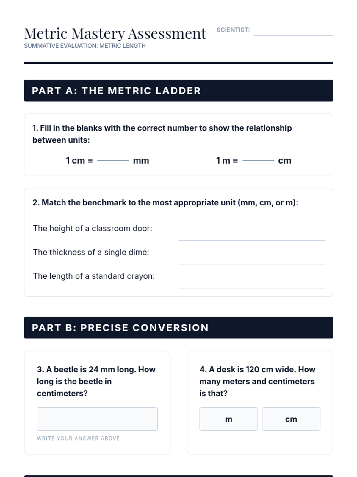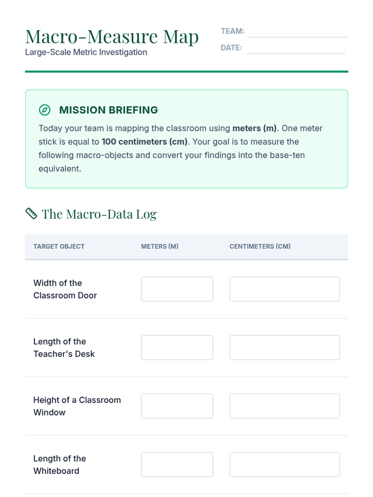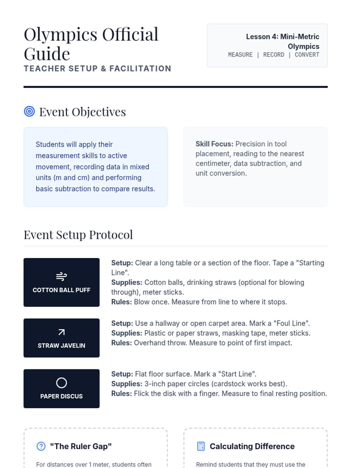A comprehensive 5-lesson unit for 4th graders to master metric length measurement (mm, cm, m). Students transition from investigating micro-units on a ruler to measuring classroom-scale distances and conducting a 'Metric Olympics' to solidify their understanding of the base-ten measurement system.