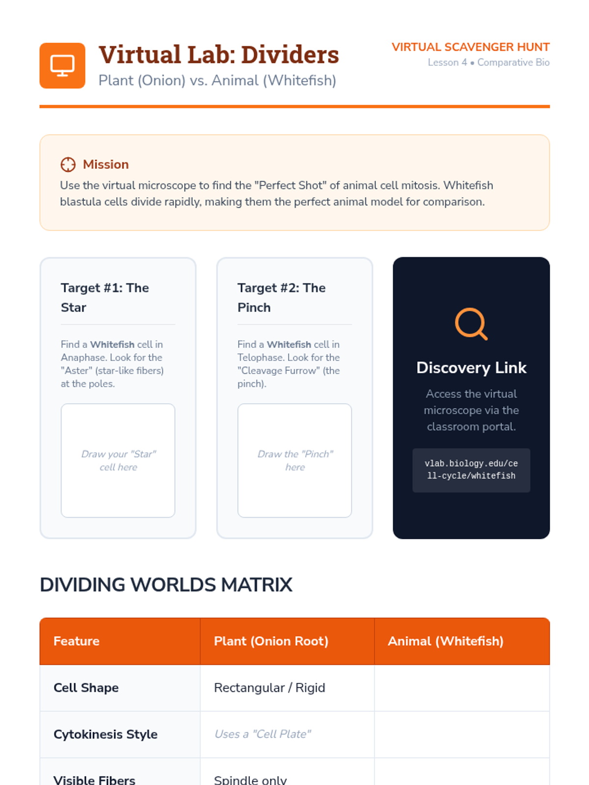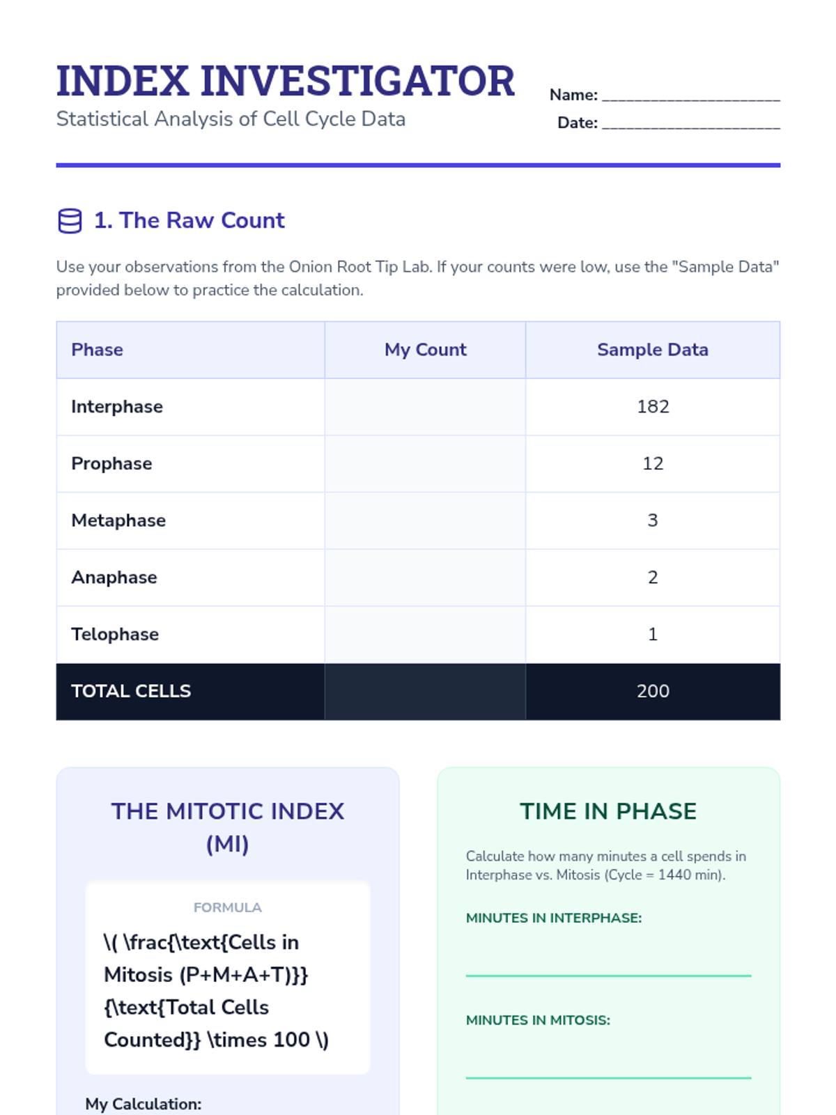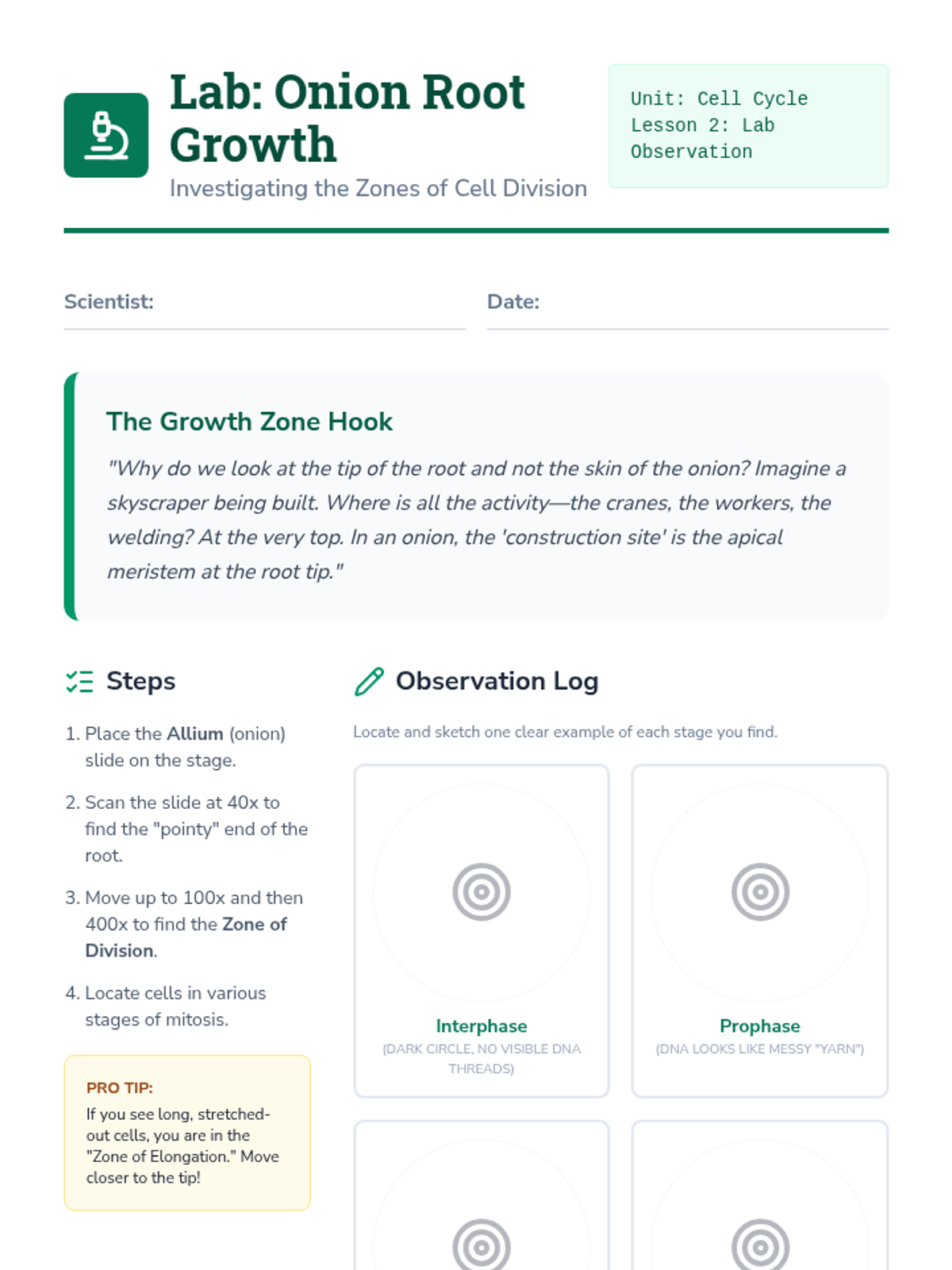 A hands-on, observational sequence where students apply their knowledge to identify cell division in actual specimens using microscopy. Students collect data on cells in various stages and calculate the frequency of mitosis, culminating in a formal lab report.