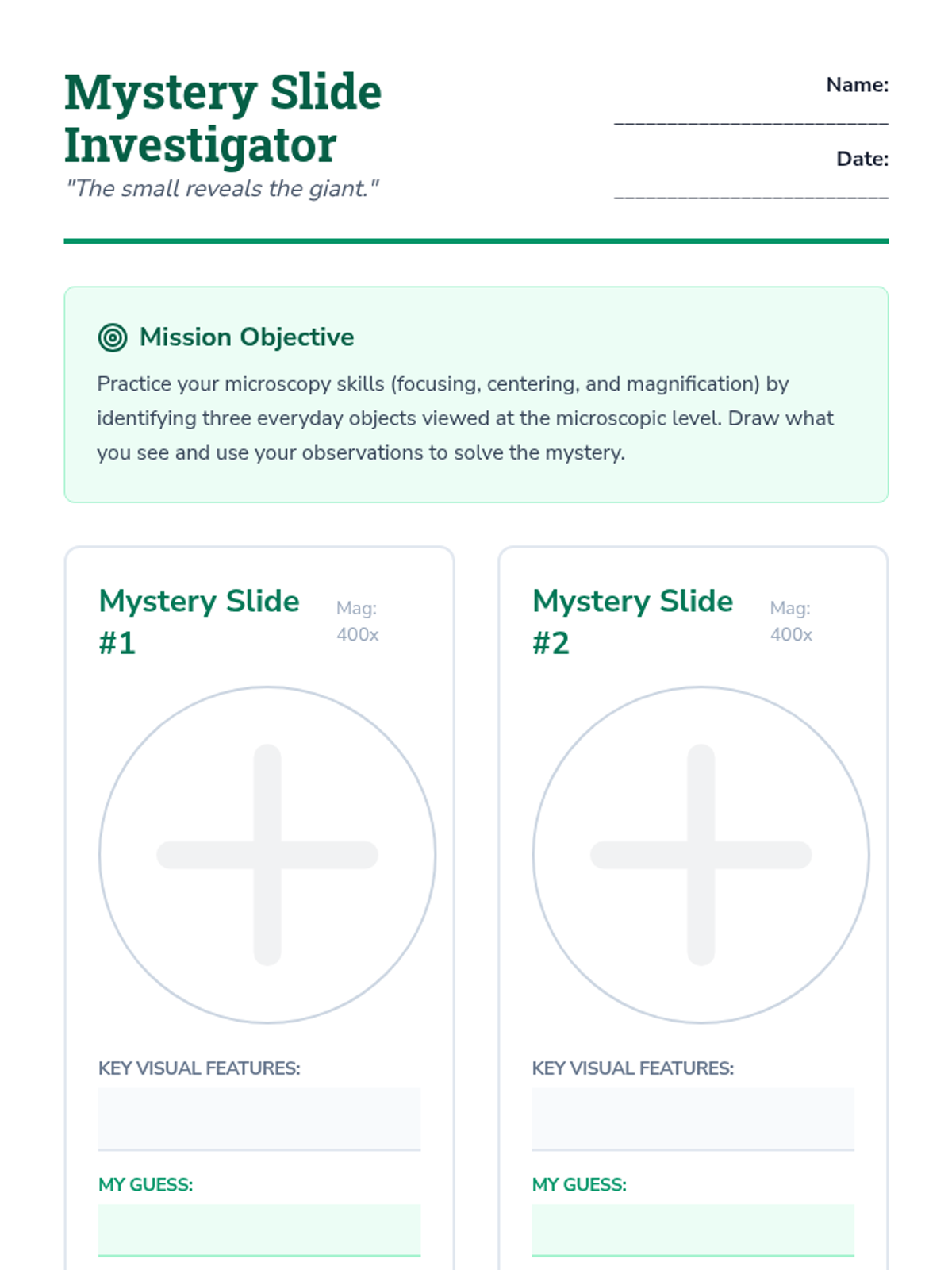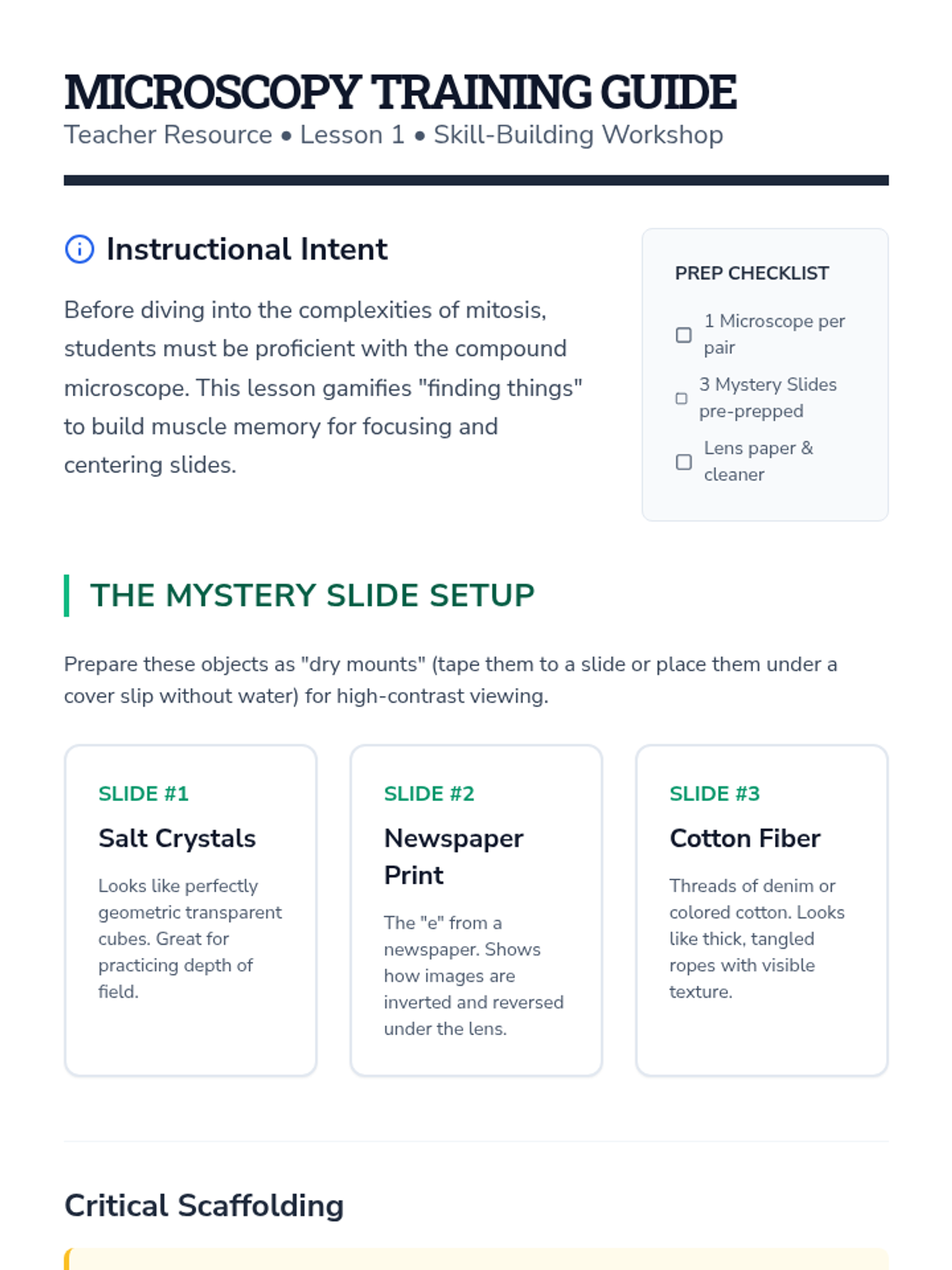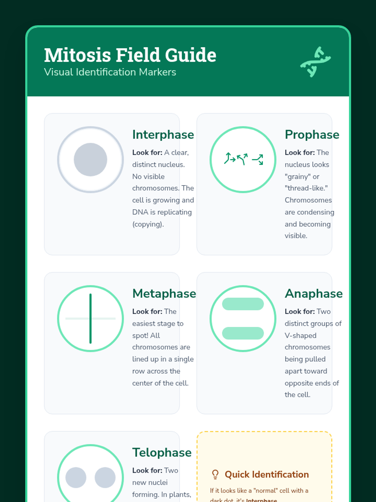 A hands-on, observational sequence where students apply their knowledge to identify cell division in actual specimens using microscopy. Students collect data on cells in various stages and calculate the frequency of mitosis, culminating in a formal lab report.