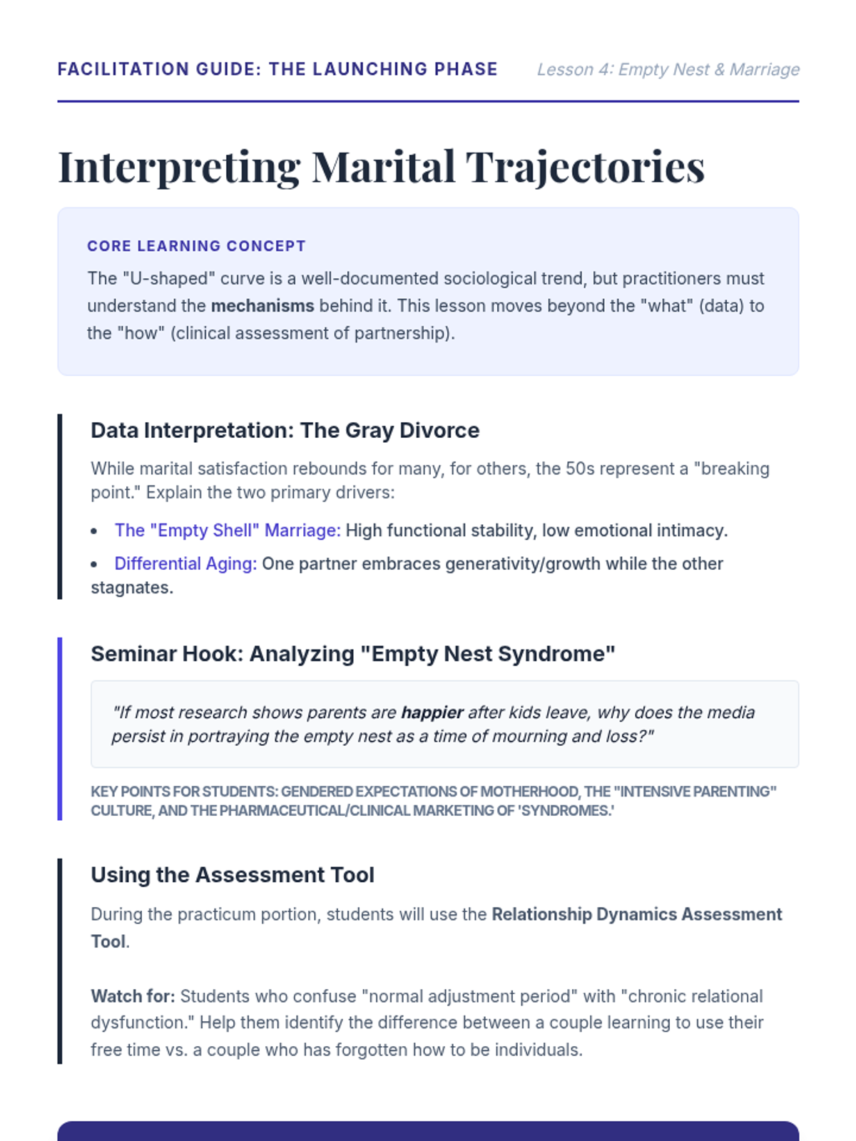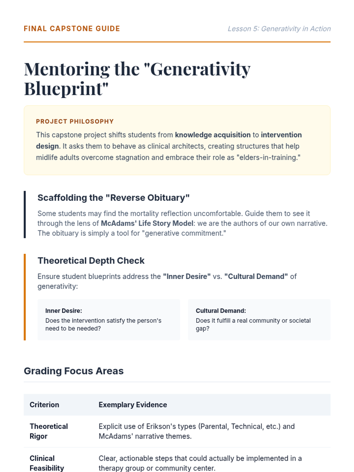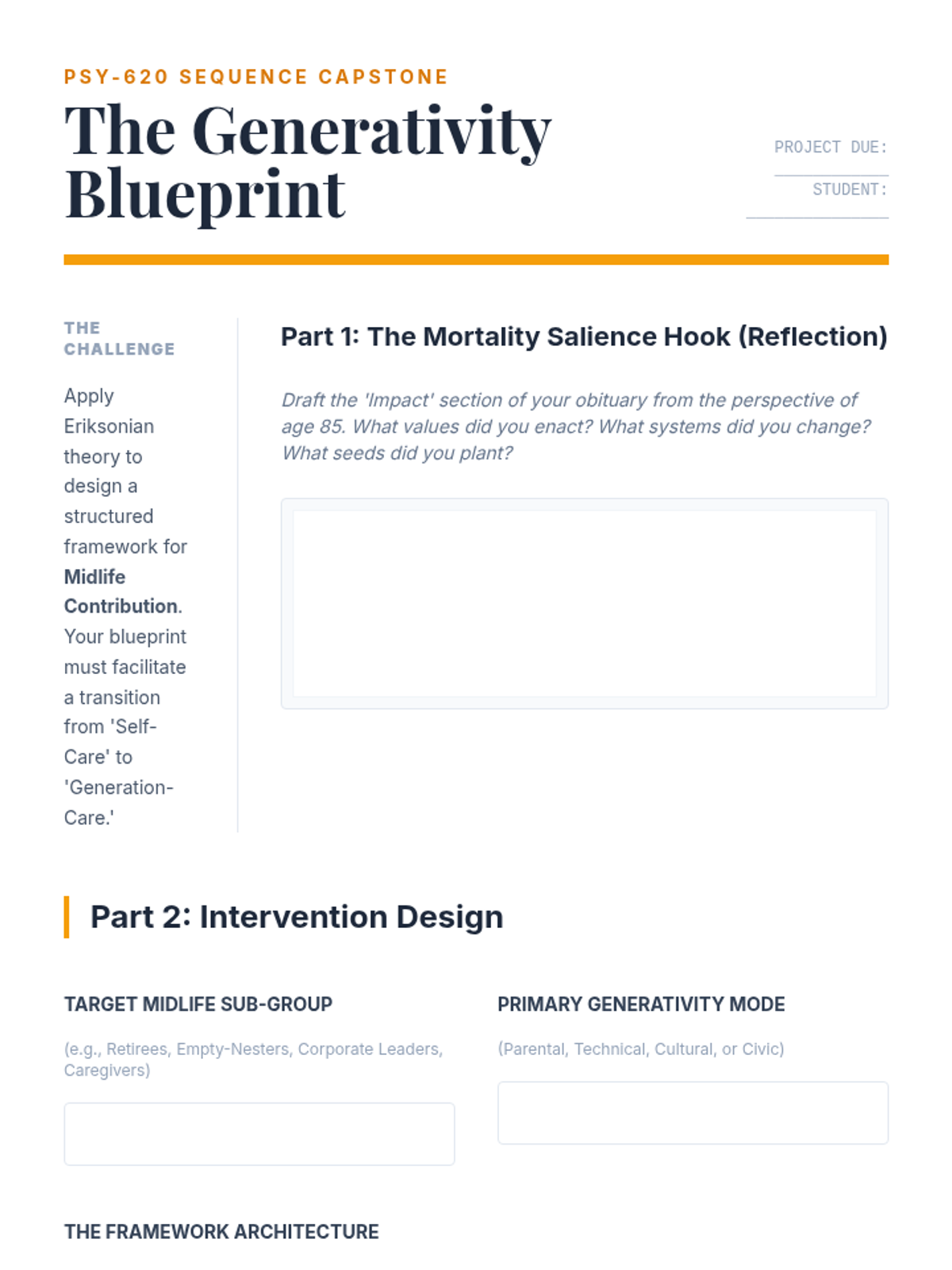 This graduate-level sequence examines the psychological and sociological shifts of midlife. Students explore role transitions including the 'Sandwich Generation,' career plateaus, and identity renegotiation, applying developmental theories to clinical and systemic contexts.