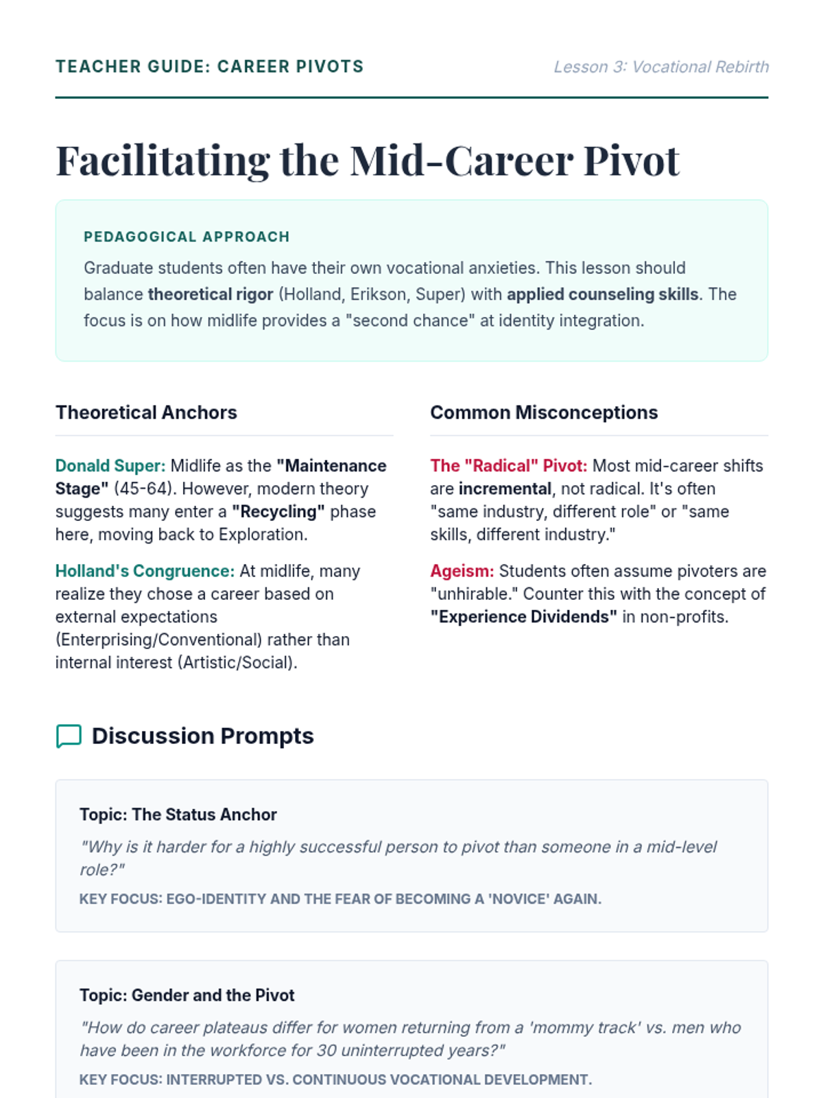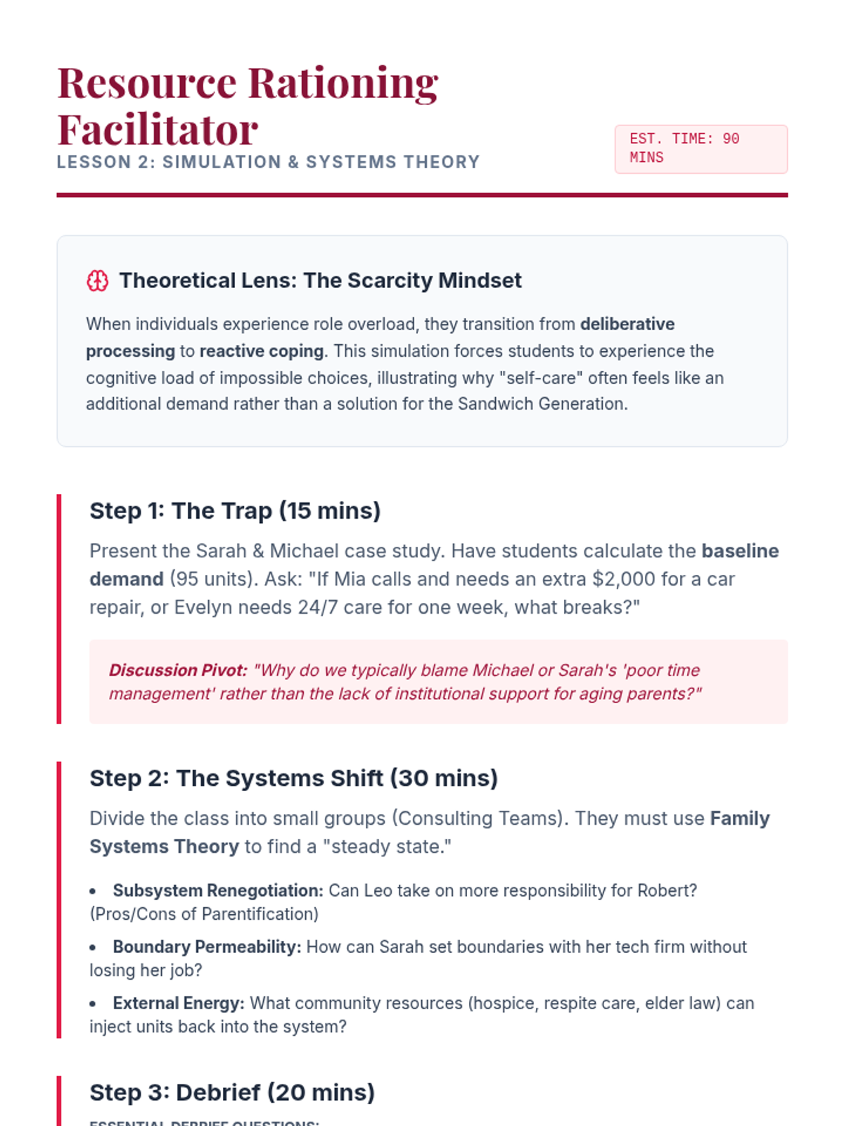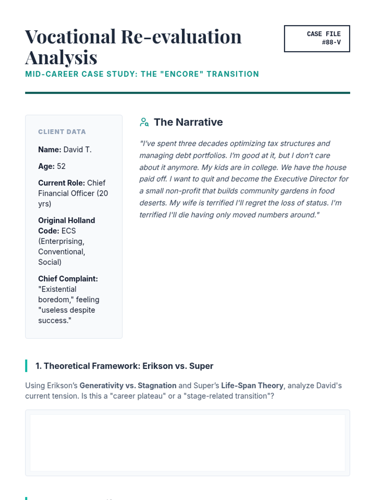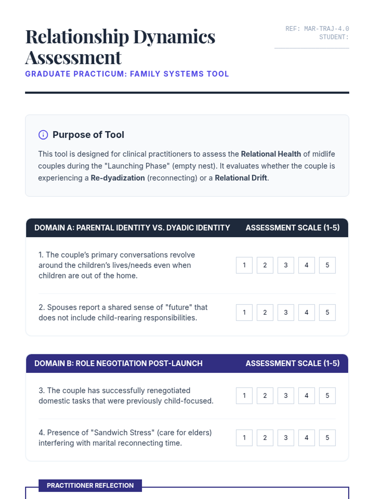 This graduate-level sequence examines the psychological and sociological shifts of midlife. Students explore role transitions including the 'Sandwich Generation,' career plateaus, and identity renegotiation, applying developmental theories to clinical and systemic contexts.