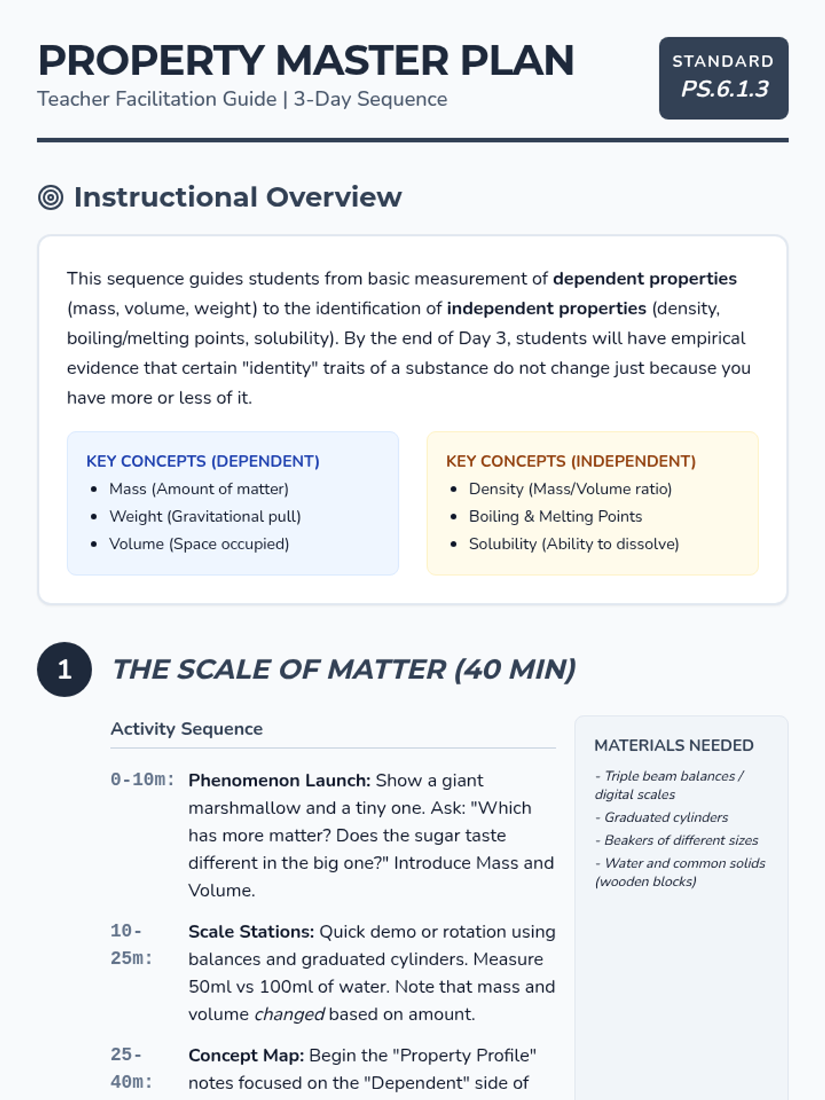A comprehensive 3-day sequence focused on distinguishing between physical properties of matter that are independent of amount (density, solubility, melting/boiling points) and those that are dependent (mass, volume, weight). Students act as 'Substance Sleuths' to investigate these properties through hands-on labs and visual note-taking.