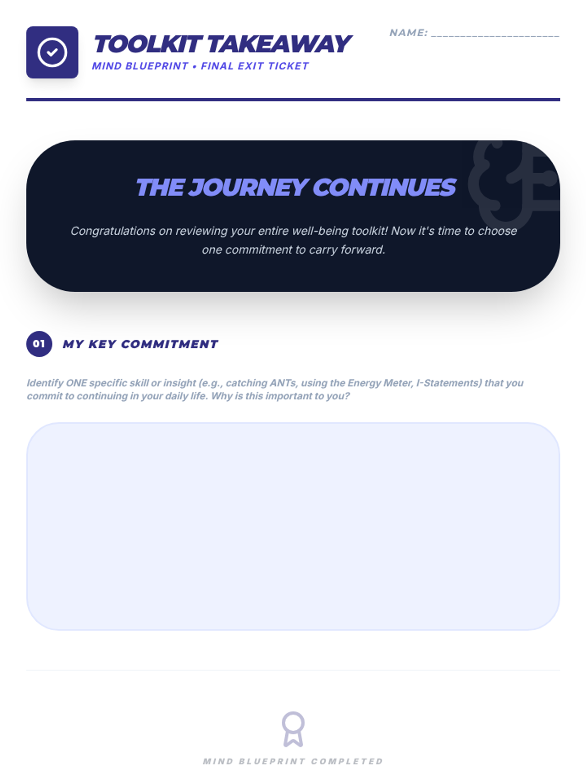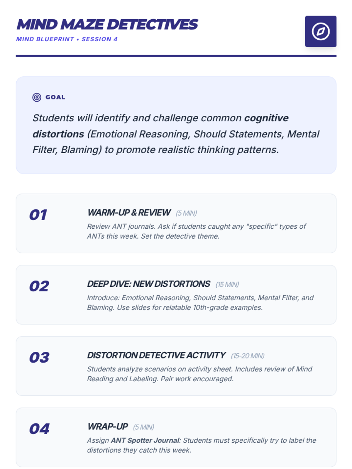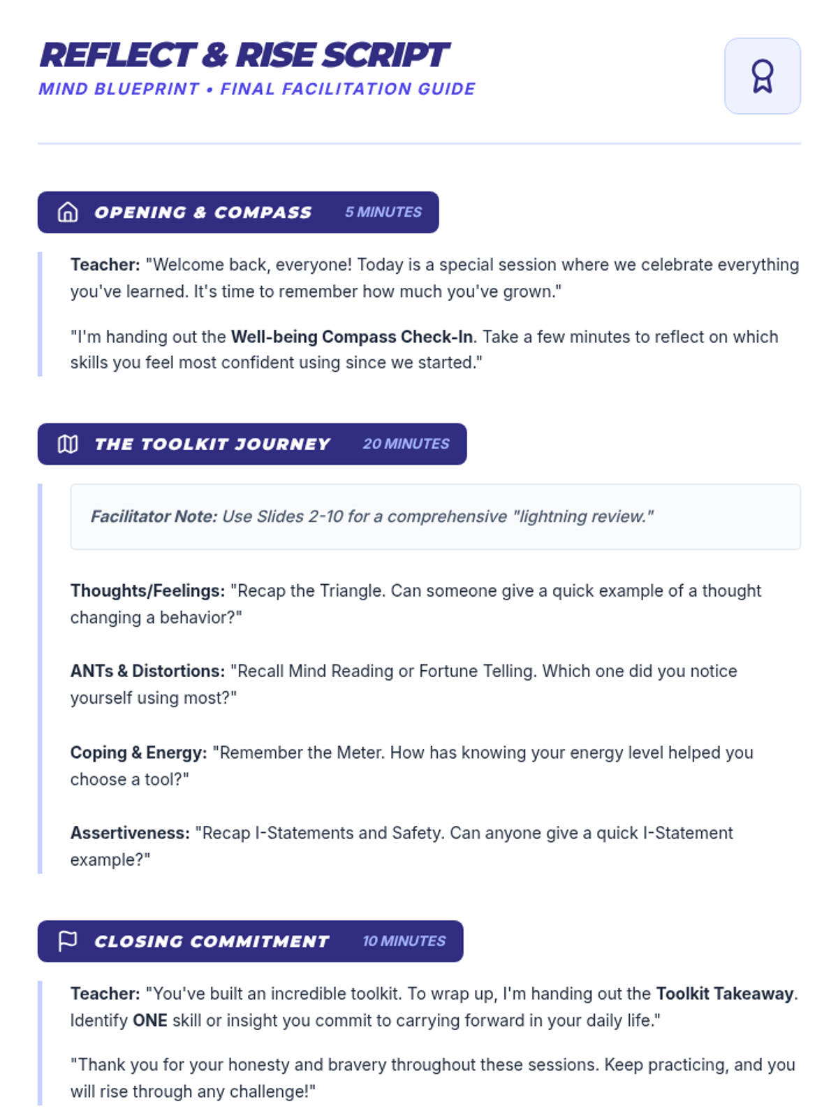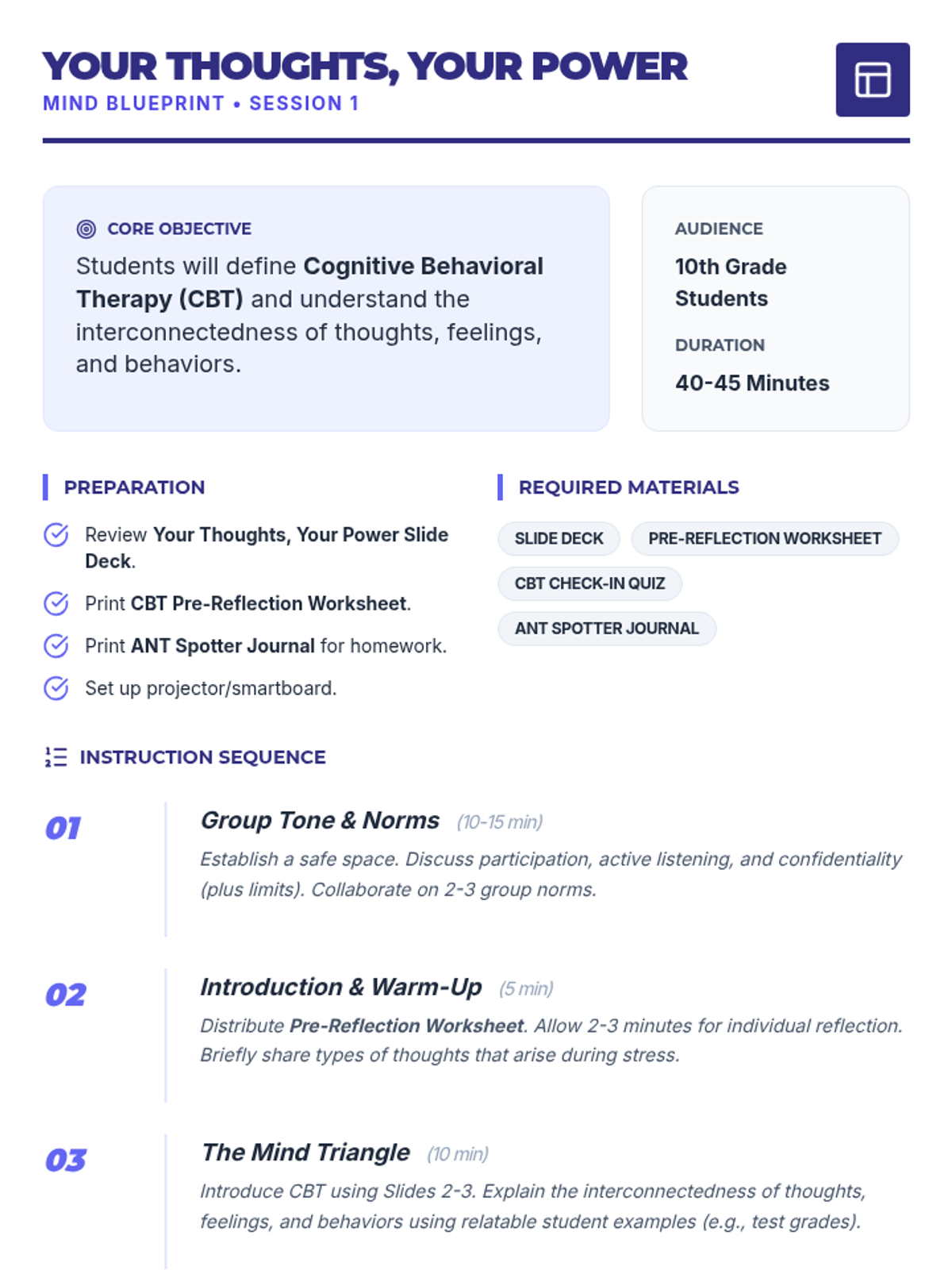 A comprehensive 9-session Tier 2 small group intervention for 10th-grade students, focusing on Cognitive Behavioral Therapy (CBT) principles, emotional regulation, coping strategies, and assertive communication. Students build a "Well-being Toolkit" to navigate life's challenges with resilience.