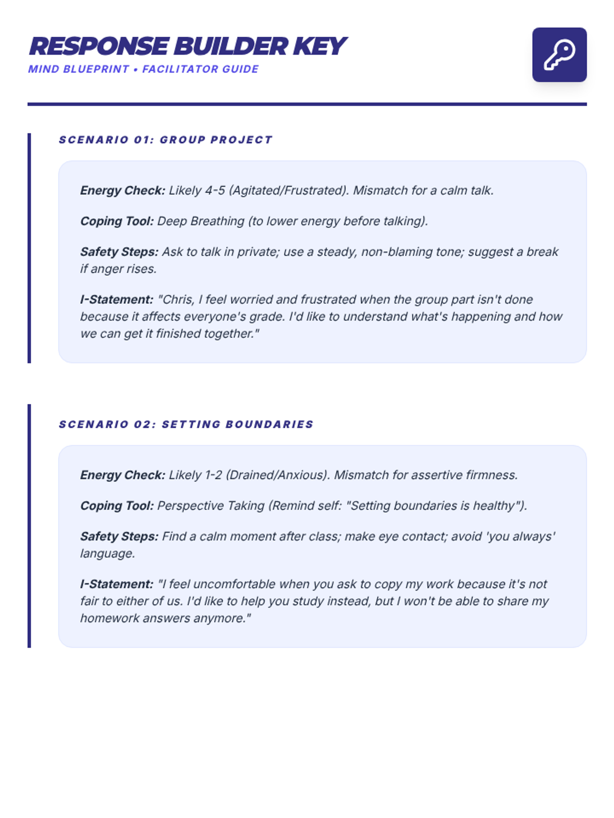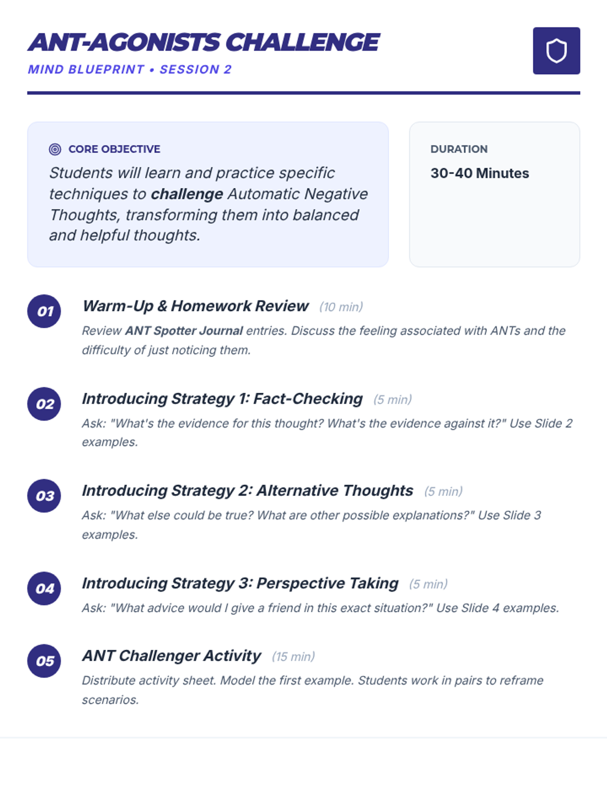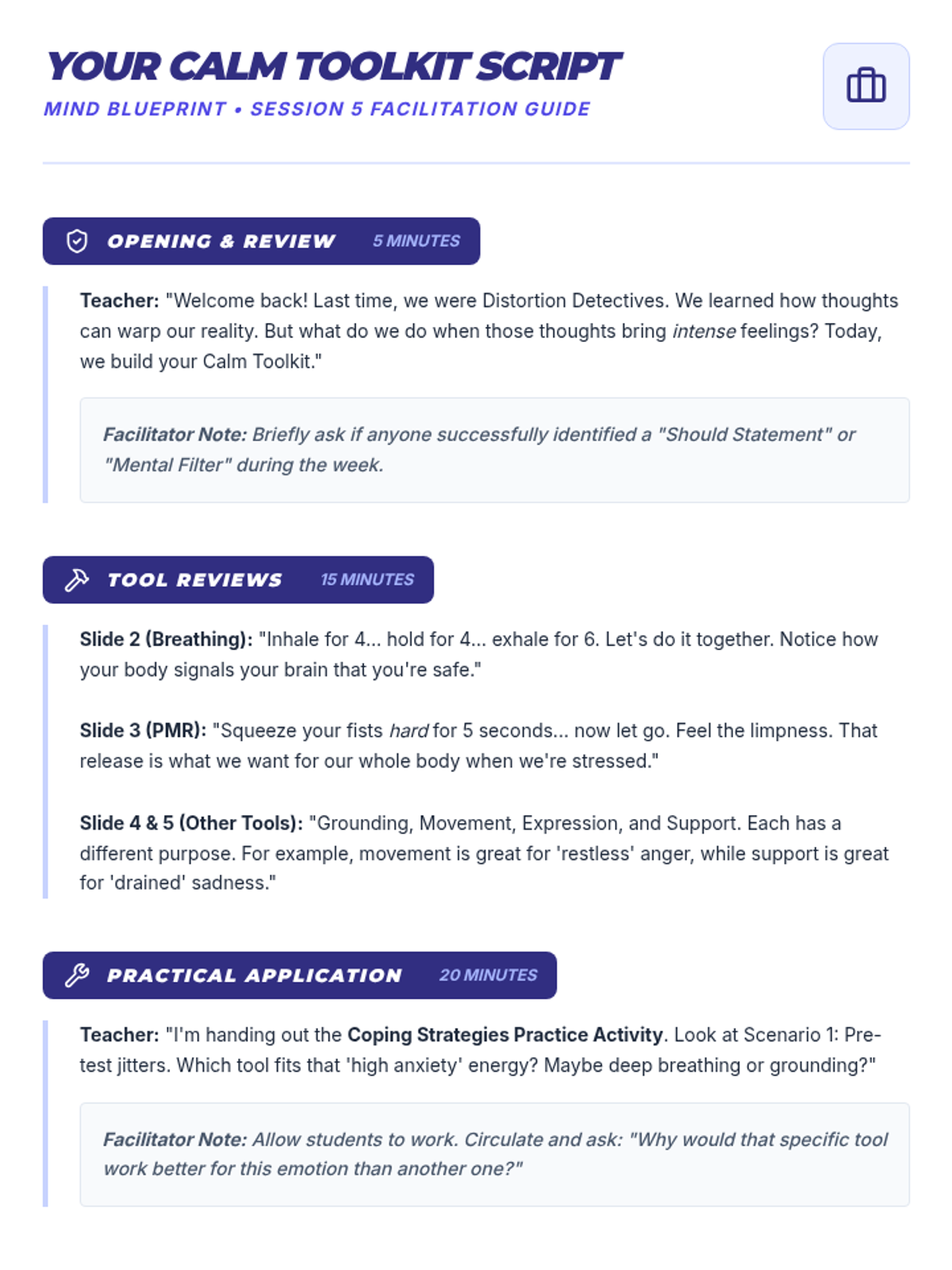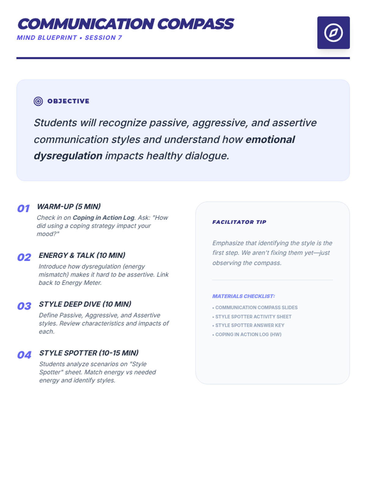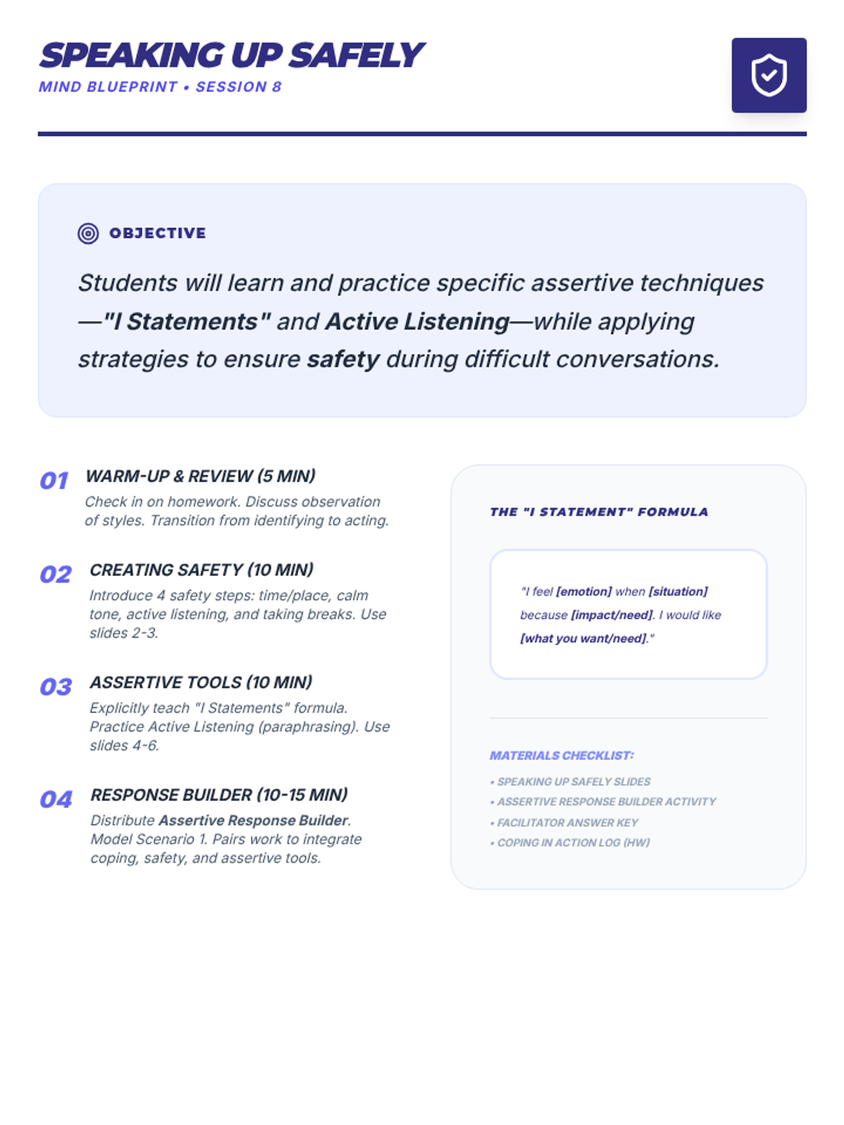 A comprehensive 9-session Tier 2 small group intervention for 10th-grade students, focusing on Cognitive Behavioral Therapy (CBT) principles, emotional regulation, coping strategies, and assertive communication. Students build a "Well-being Toolkit" to navigate life's challenges with resilience.