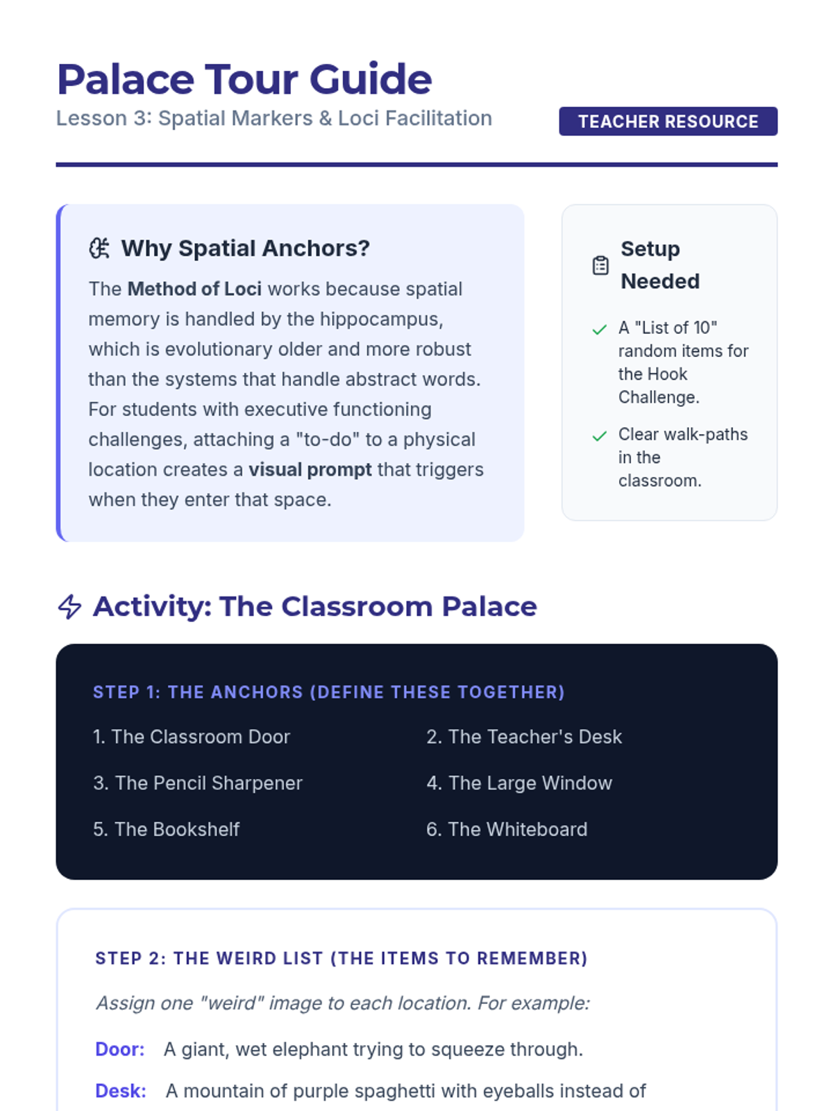 A series of mini-lessons designed to help students understand and optimize their working memory through environmental organization and cognitive strategies.