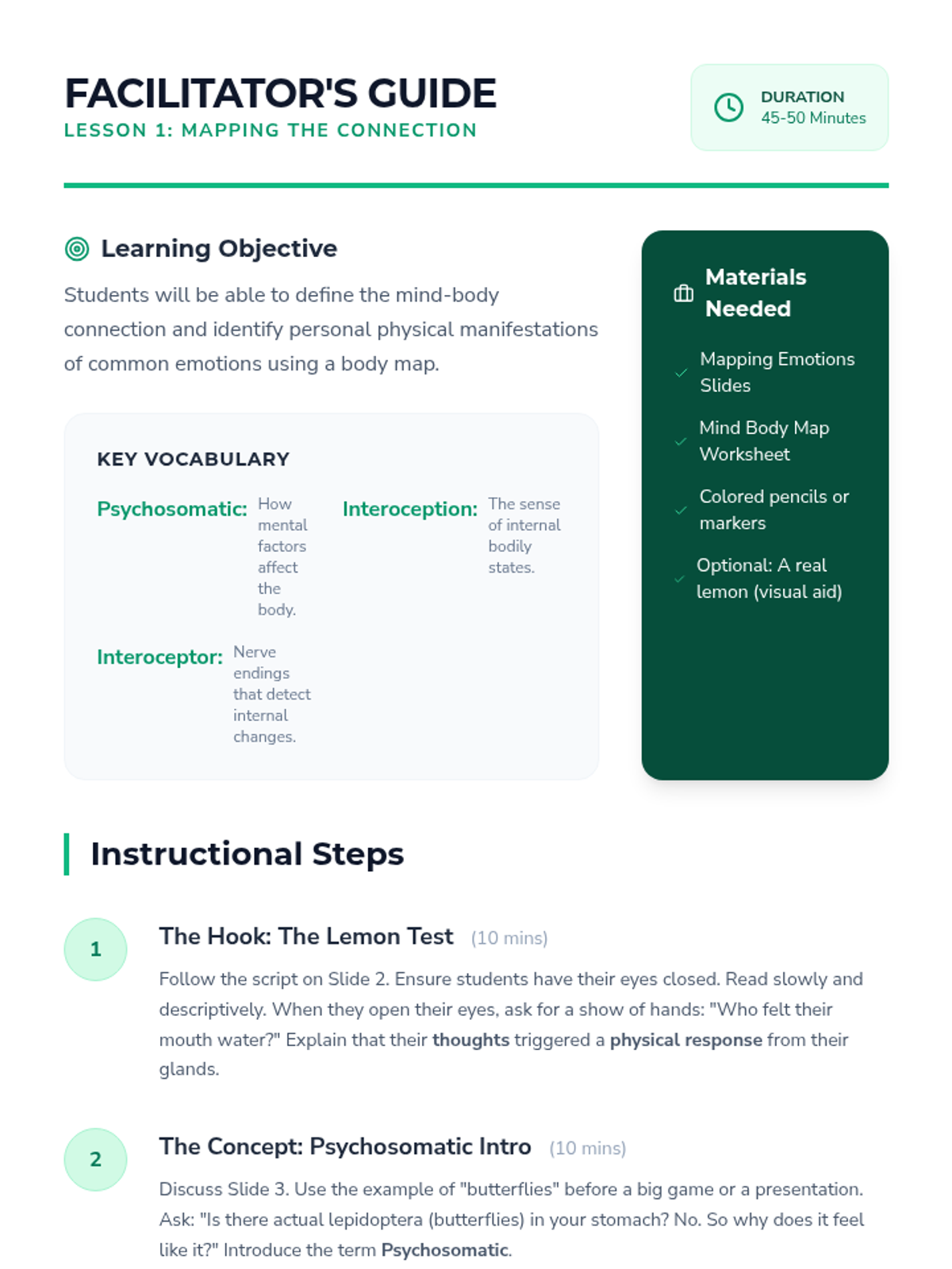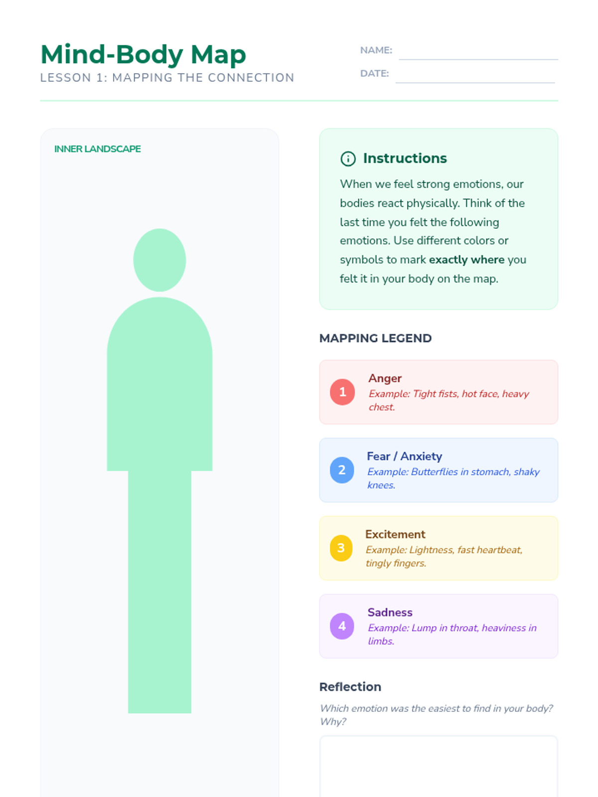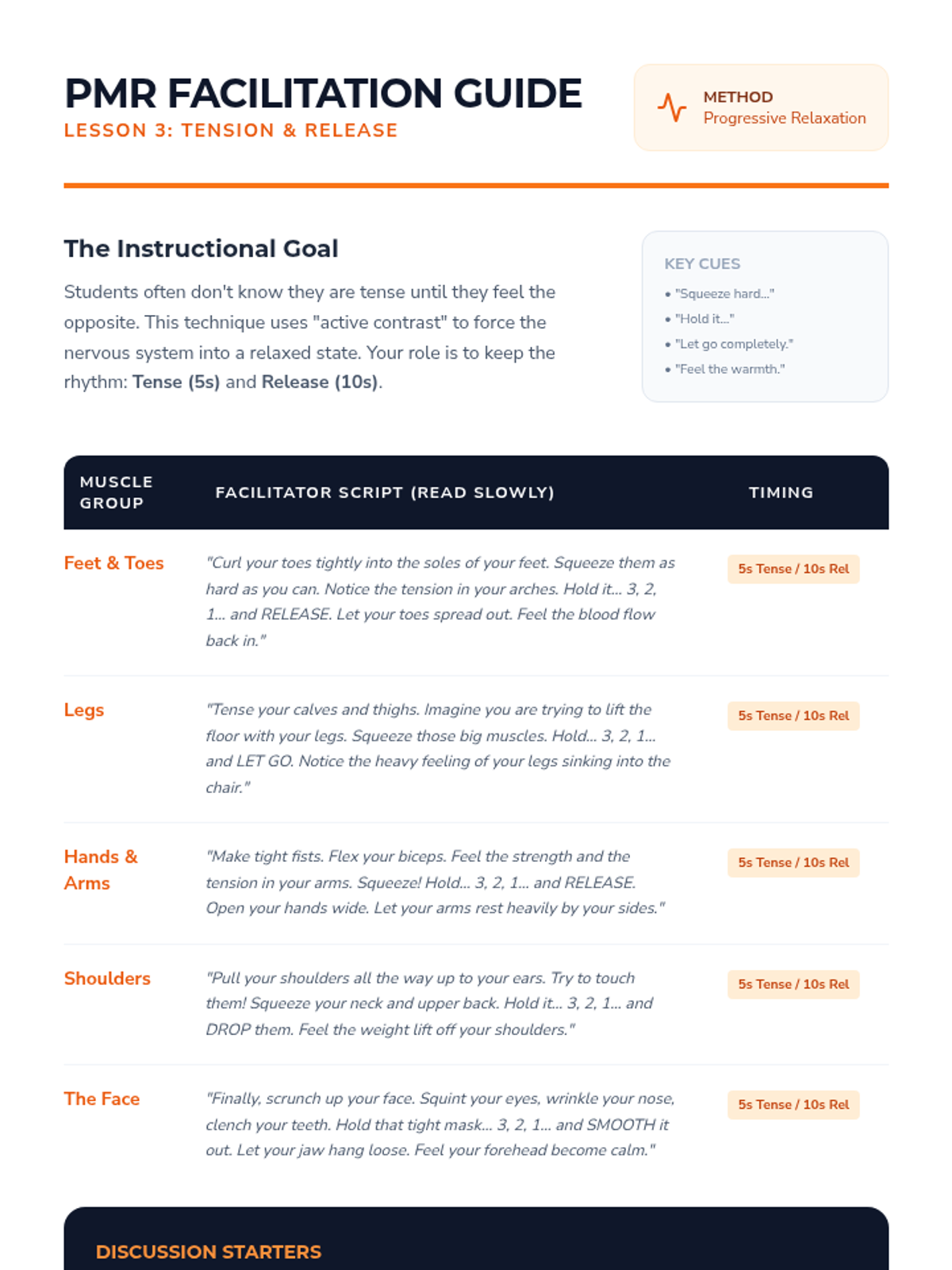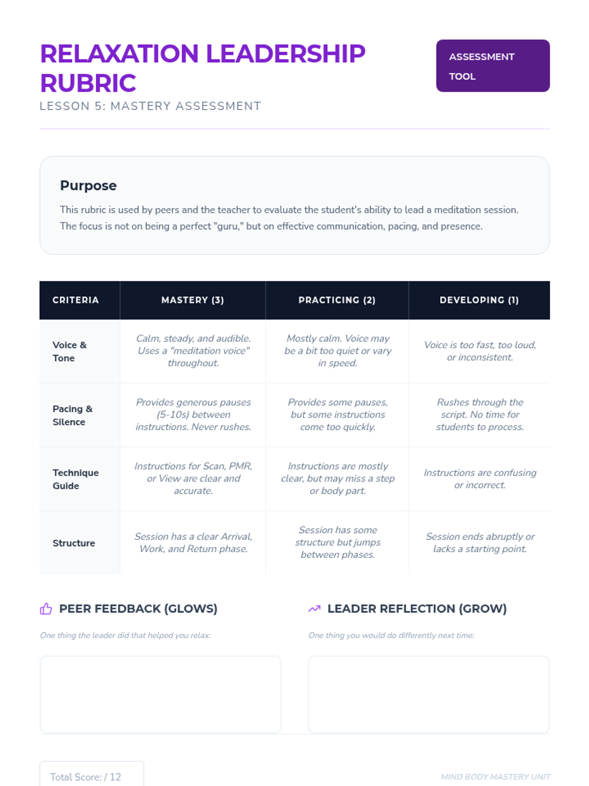This sequence teaches 6th-grade students to master the mind-body connection through systematic meditation techniques. Students progress from identifying physical manifestations of emotion to practicing passive body scanning, active progressive muscle relaxation, and visualization, culminating in leading their own relaxation sessions.