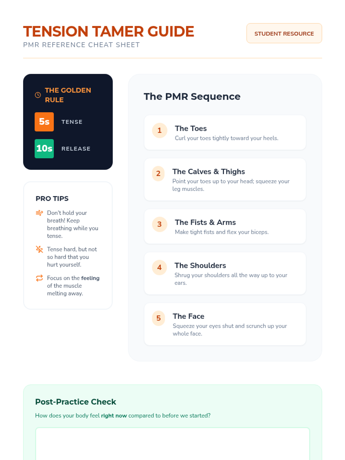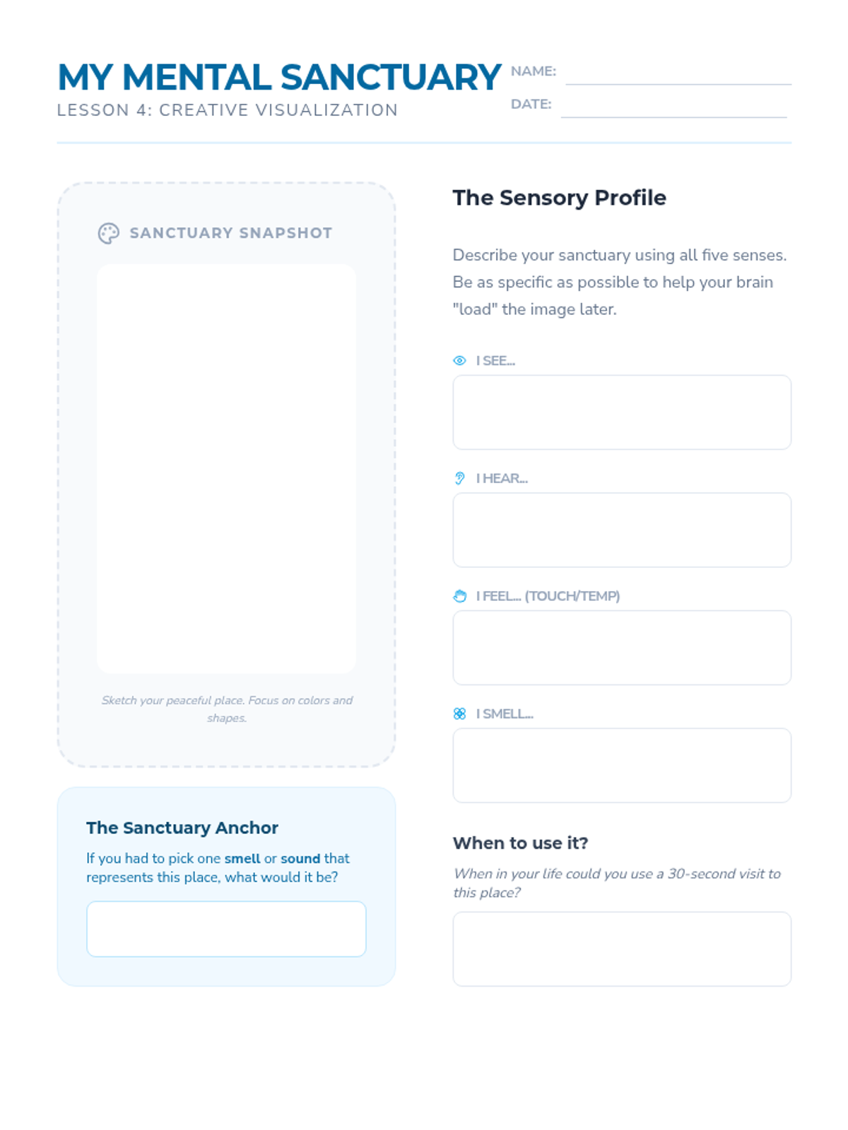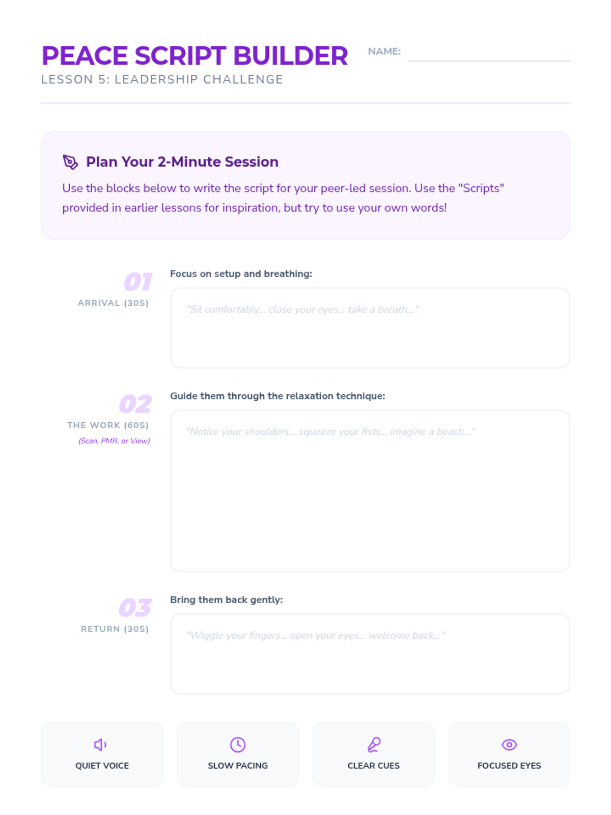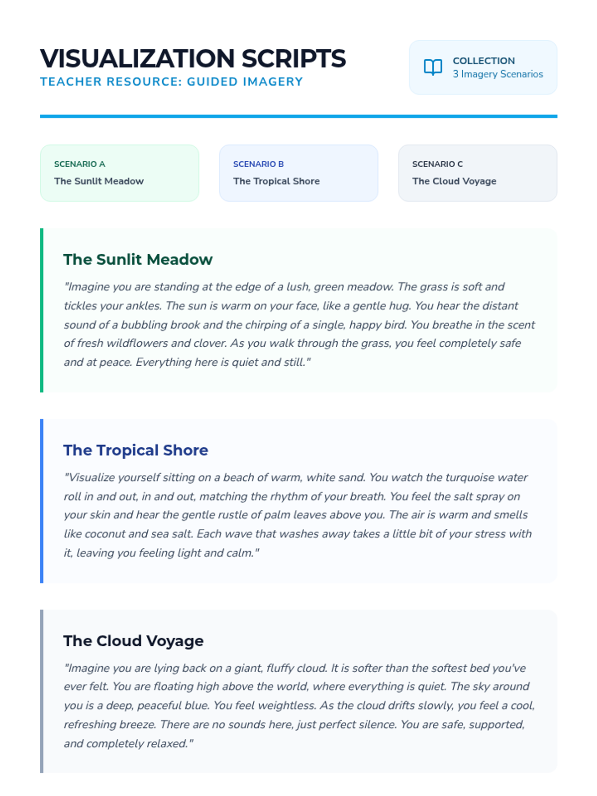 This sequence teaches 6th-grade students to master the mind-body connection through systematic meditation techniques. Students progress from identifying physical manifestations of emotion to practicing passive body scanning, active progressive muscle relaxation, and visualization, culminating in leading their own relaxation sessions.
