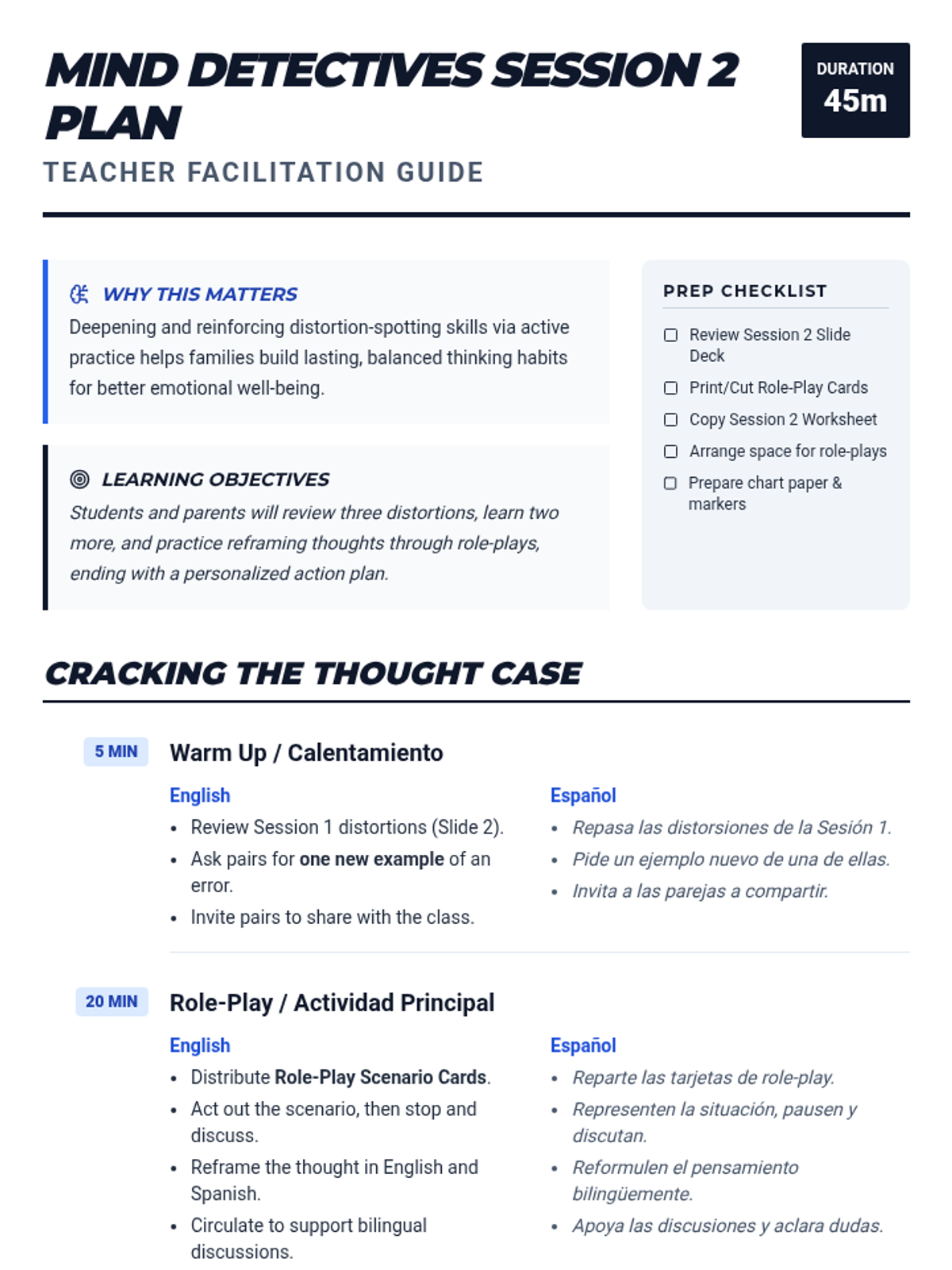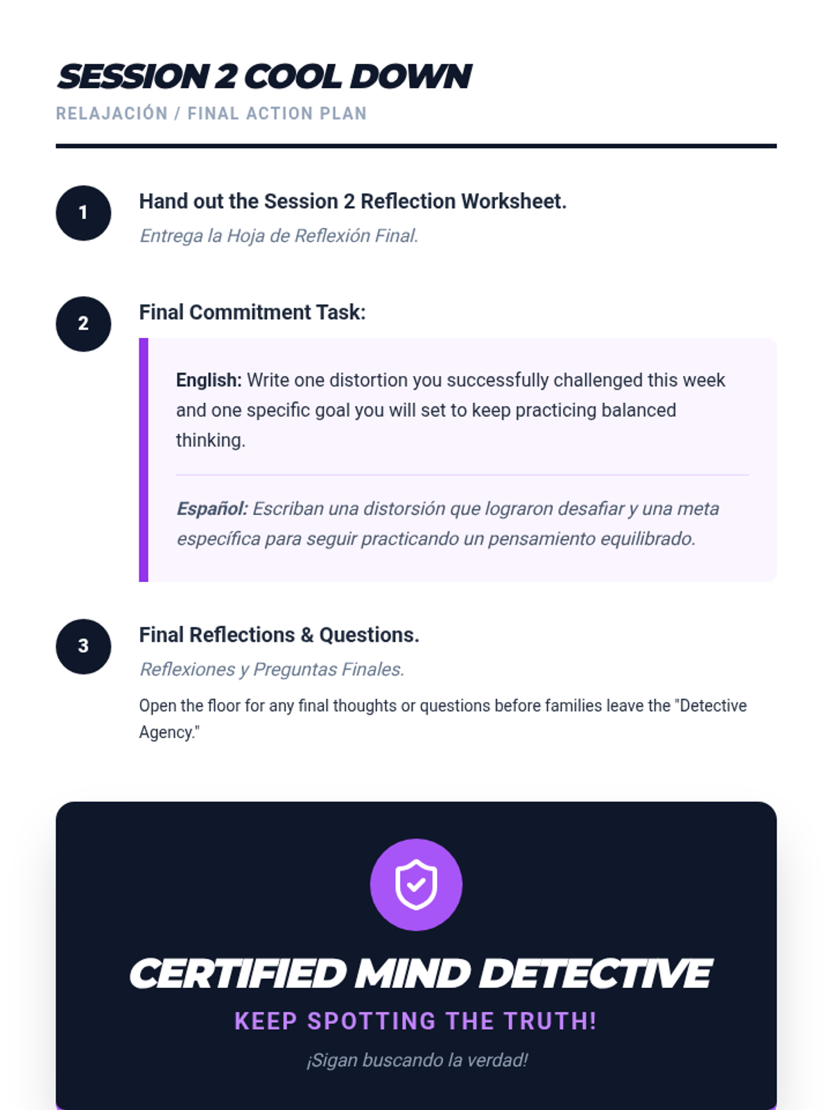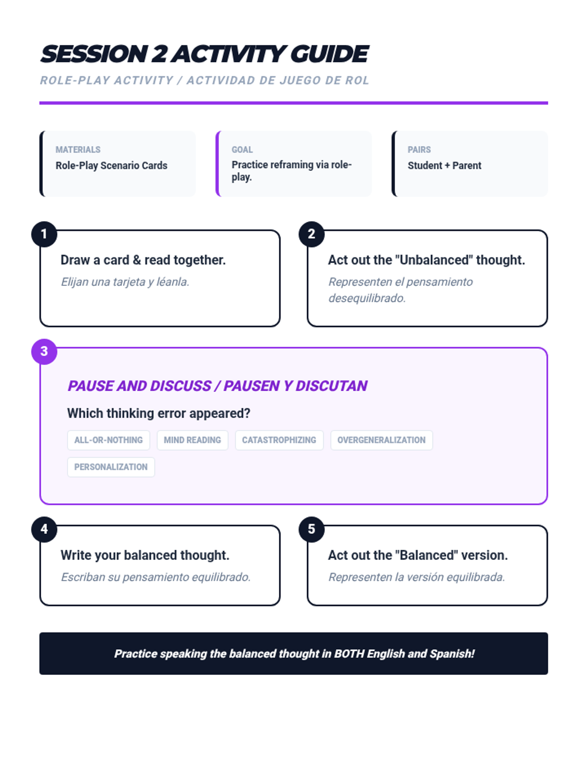A two-session bilingual program for students and parents to identify and challenge cognitive distortions, improving emotional wellbeing and family communication.