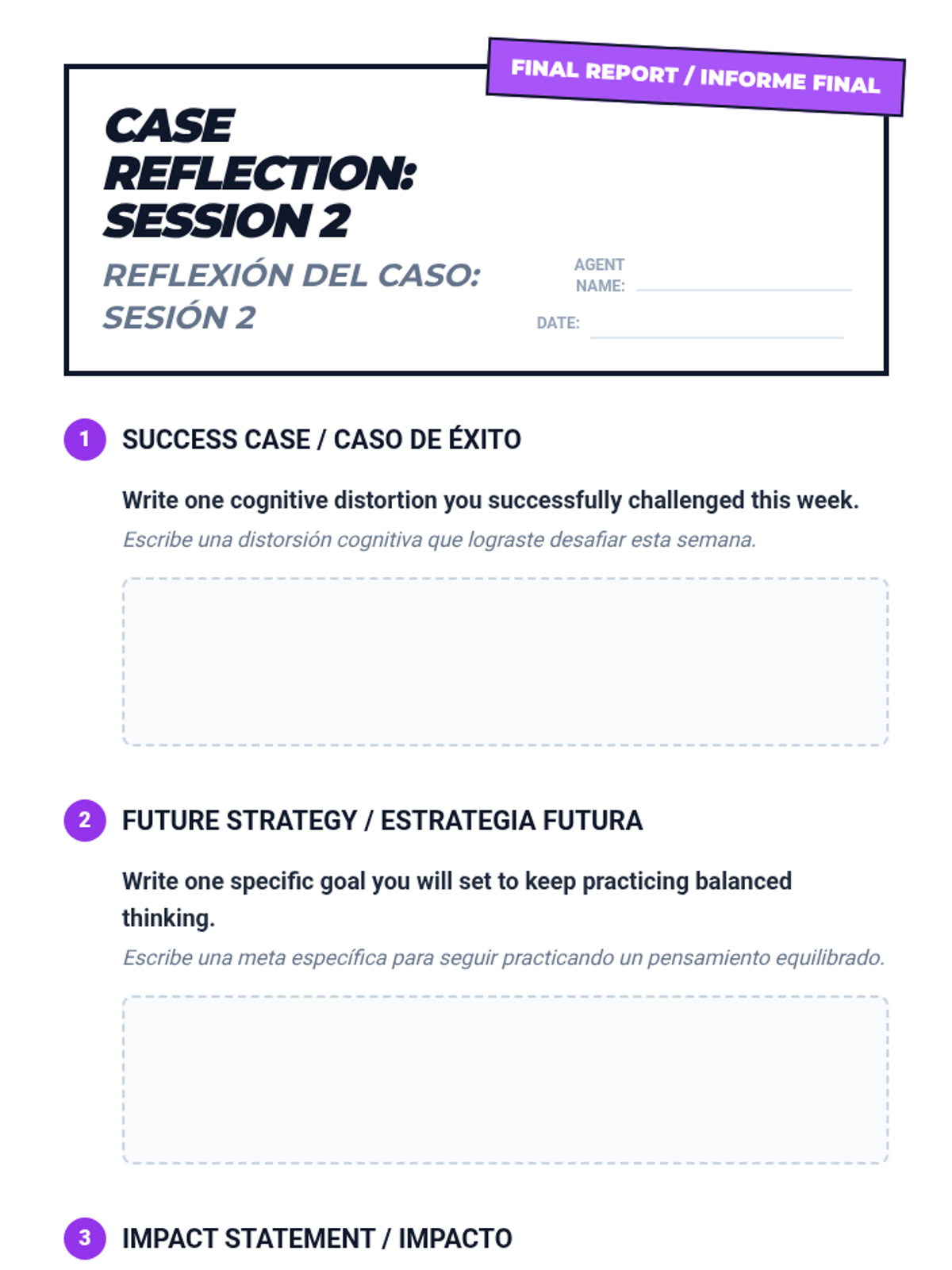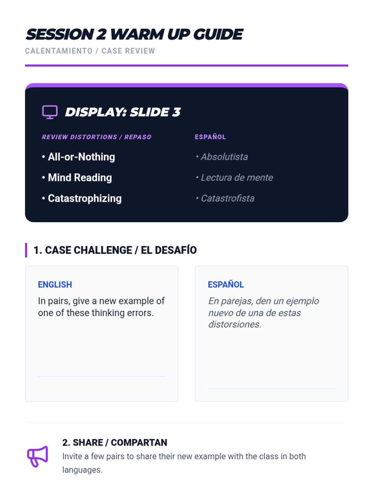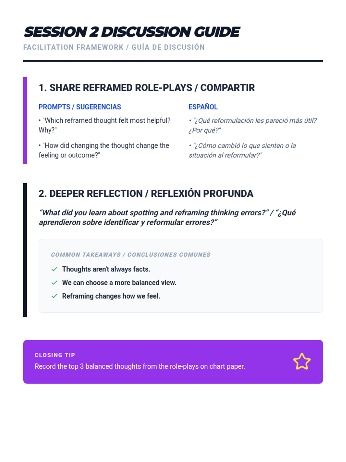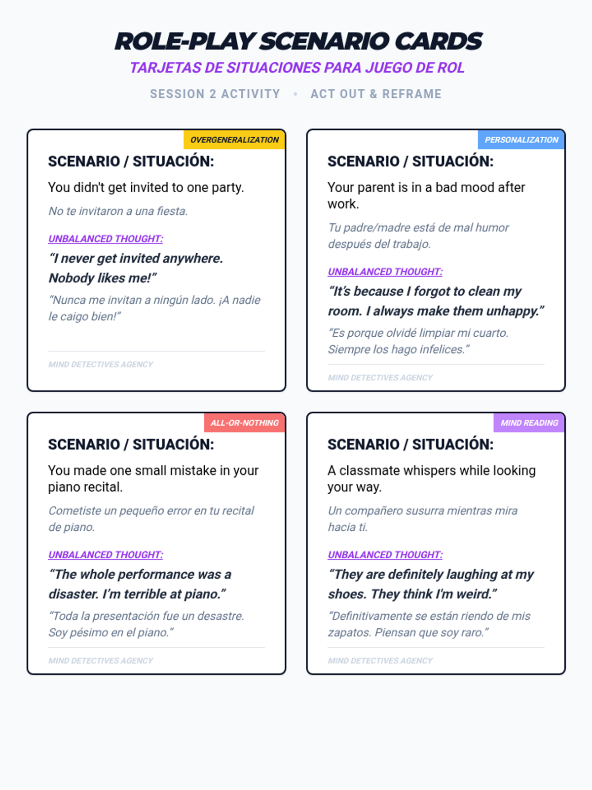 A two-session bilingual program for students and parents to identify and challenge cognitive distortions, improving emotional wellbeing and family communication.