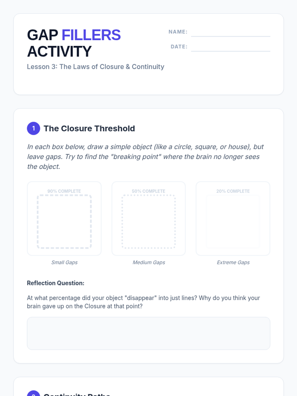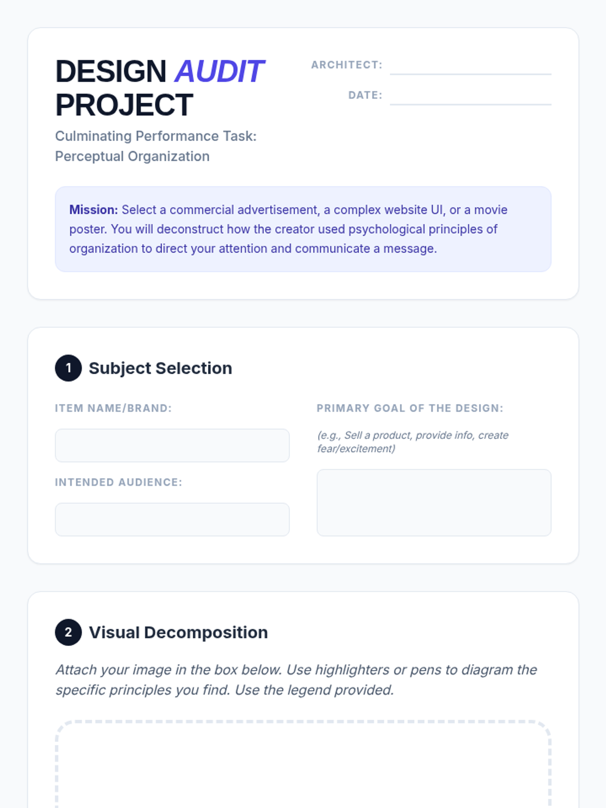 A comprehensive psychology unit for 10th-grade students exploring how the brain organizes sensory information into meaningful perceptions. The sequence covers figure-ground relationships, Gestalt principles of grouping, closure, continuity, and depth perception, culminating in a visual design analysis project.