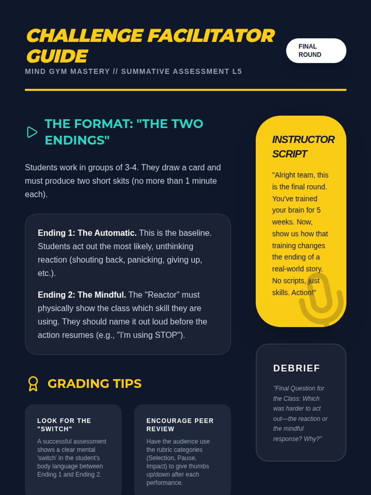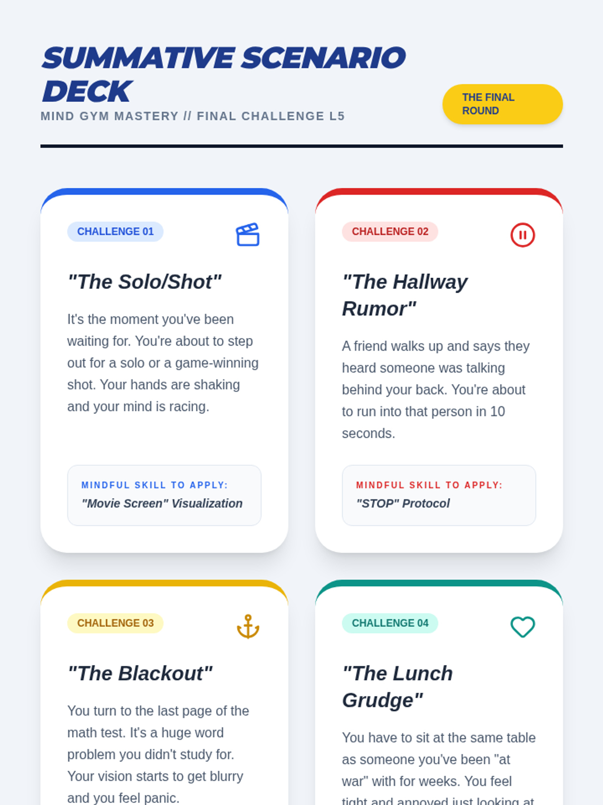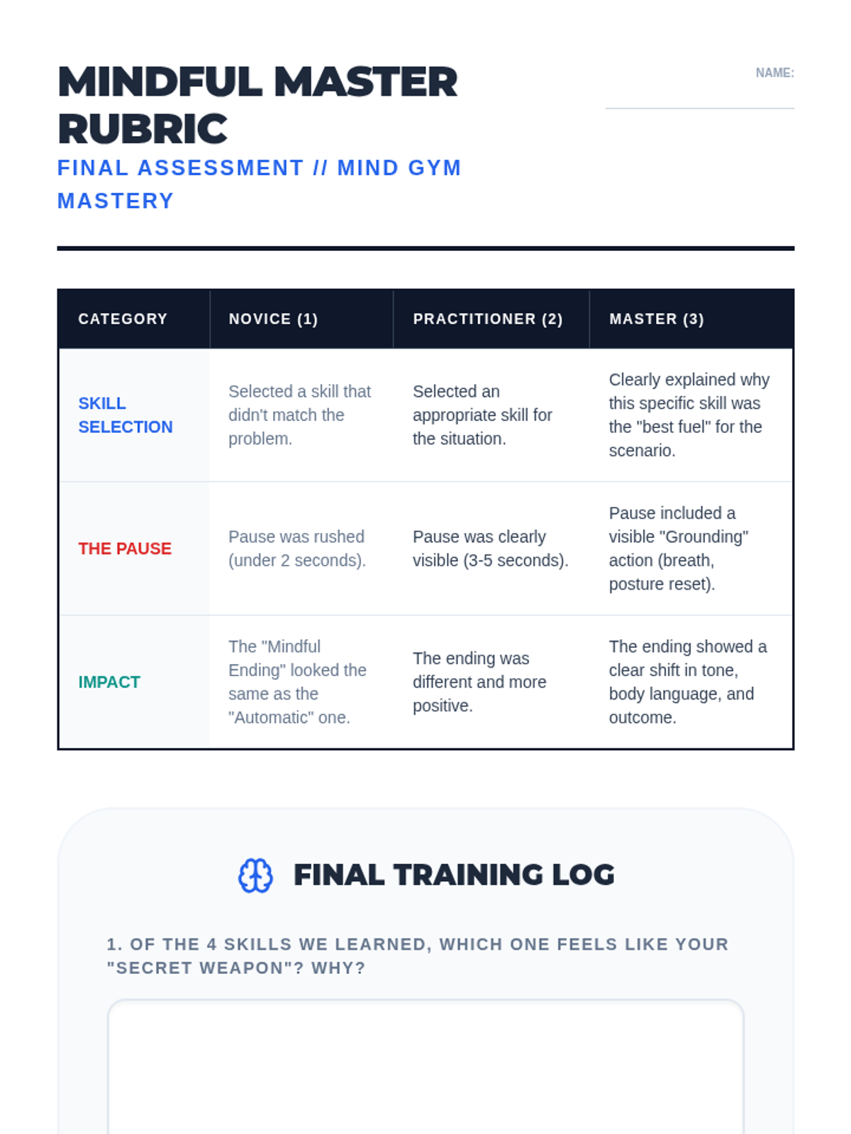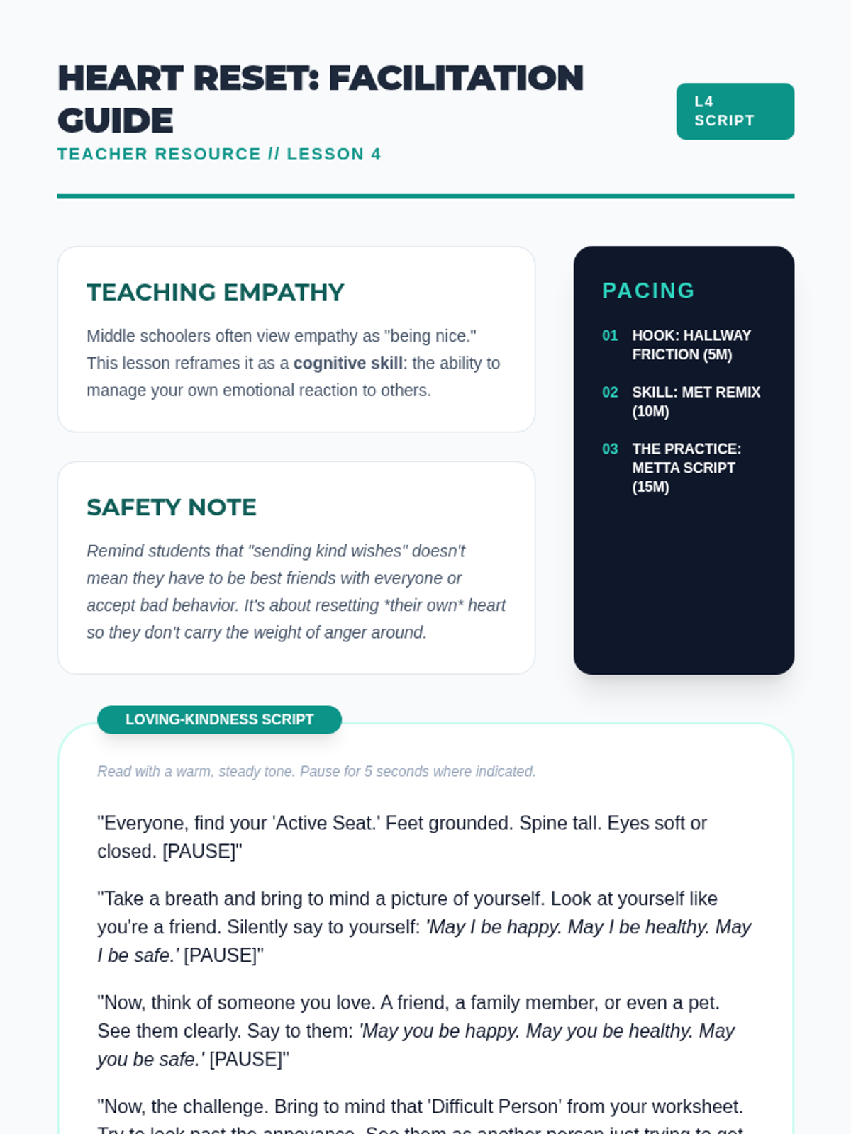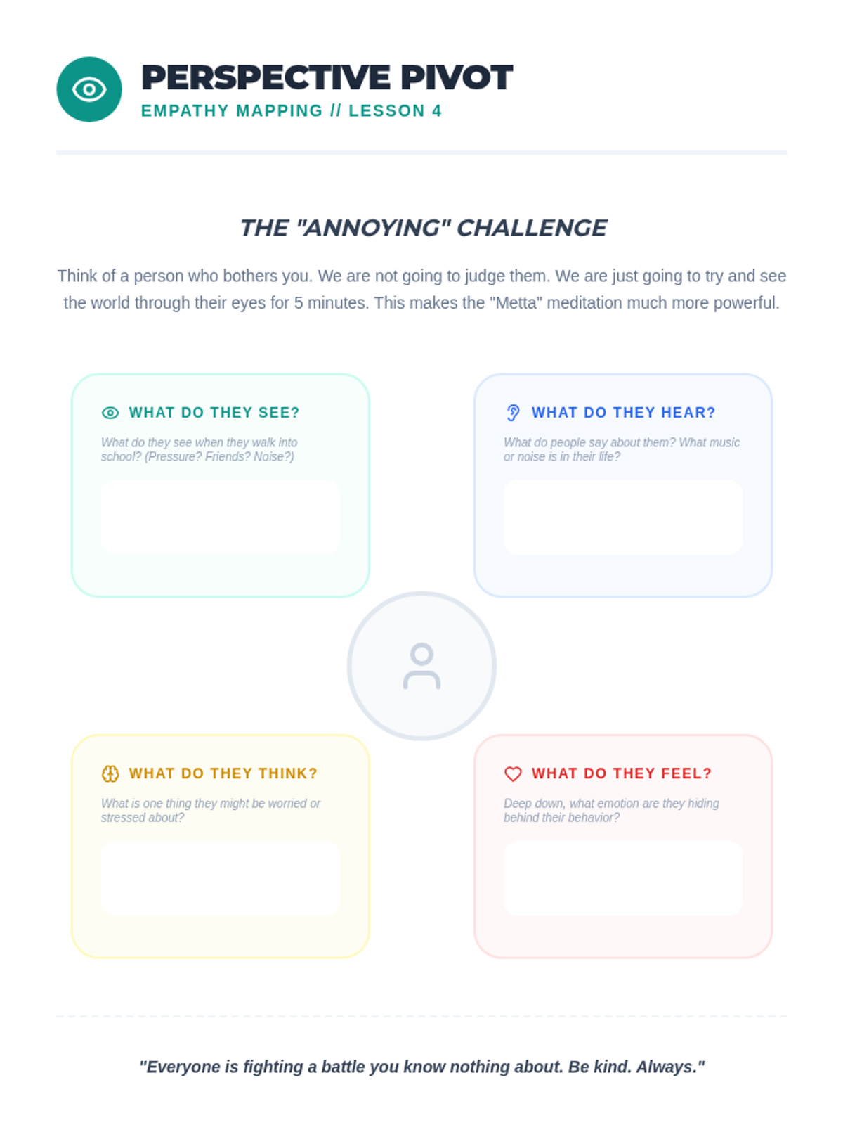This middle school sequence reframes meditation as a 'performance tool' for academic and social success. Students explore case studies of peak performers, learn the STOP technique for impulse control, develop grounding strategies for test anxiety, and practice empathy through Loving-Kindness meditation, culminating in a real-world scenario challenge.