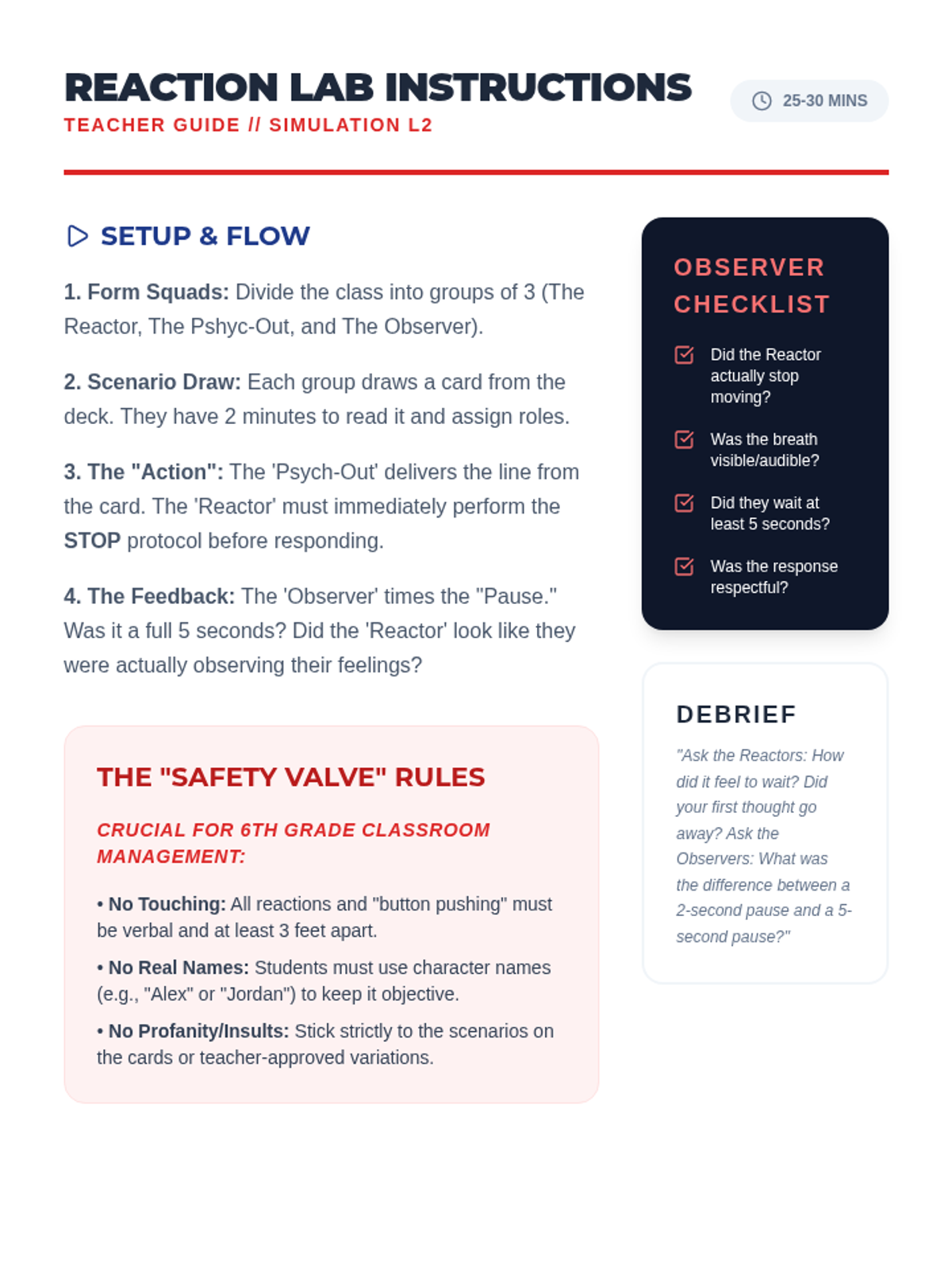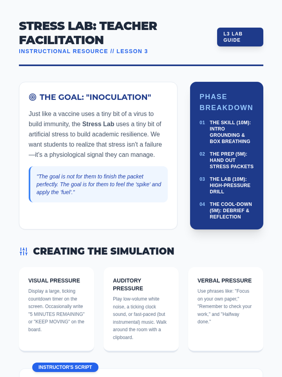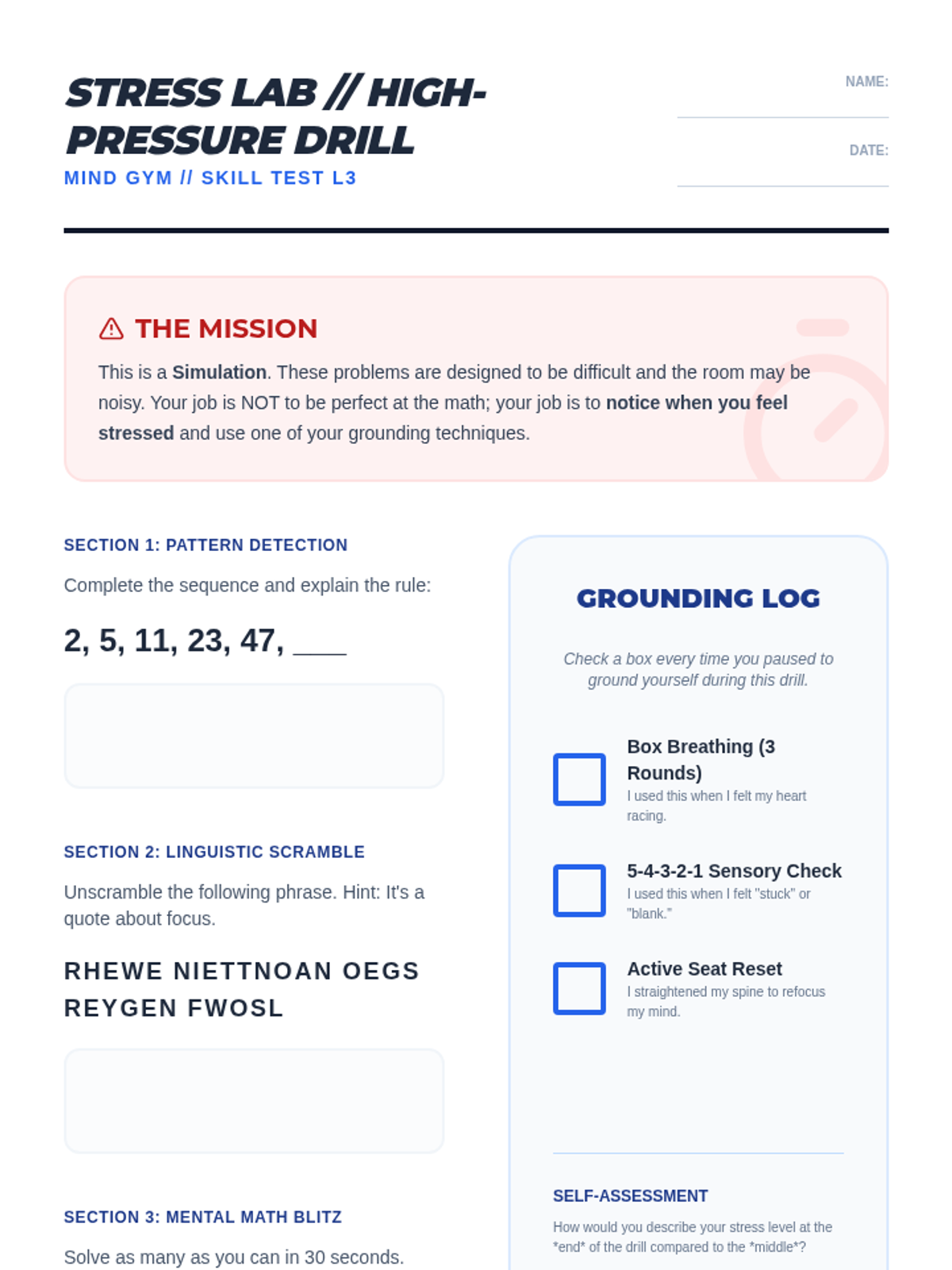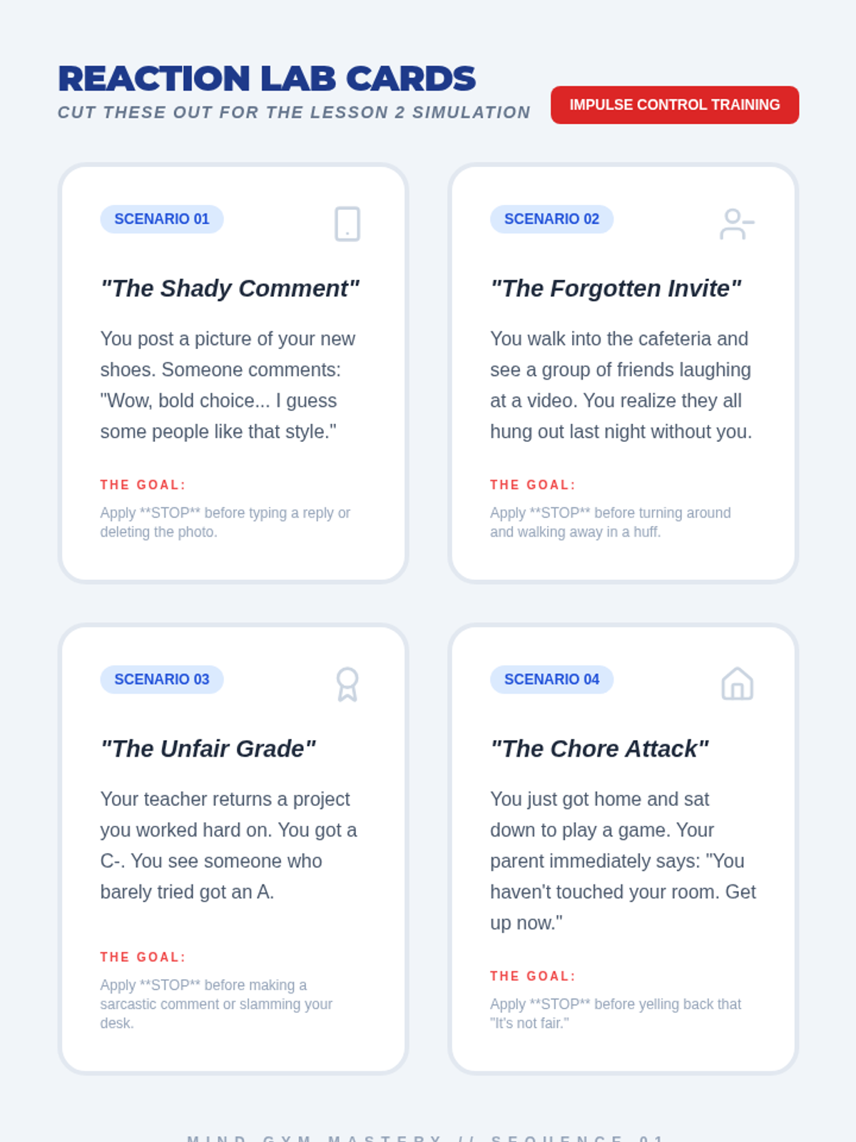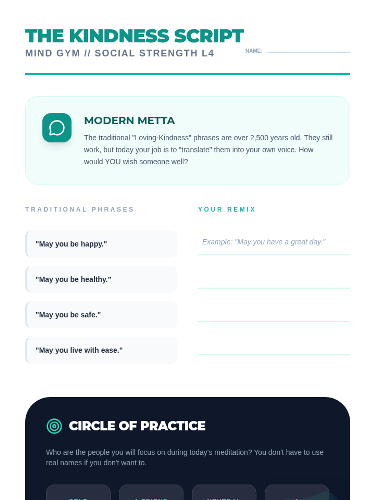 This middle school sequence reframes meditation as a 'performance tool' for academic and social success. Students explore case studies of peak performers, learn the STOP technique for impulse control, develop grounding strategies for test anxiety, and practice empathy through Loving-Kindness meditation, culminating in a real-world scenario challenge.