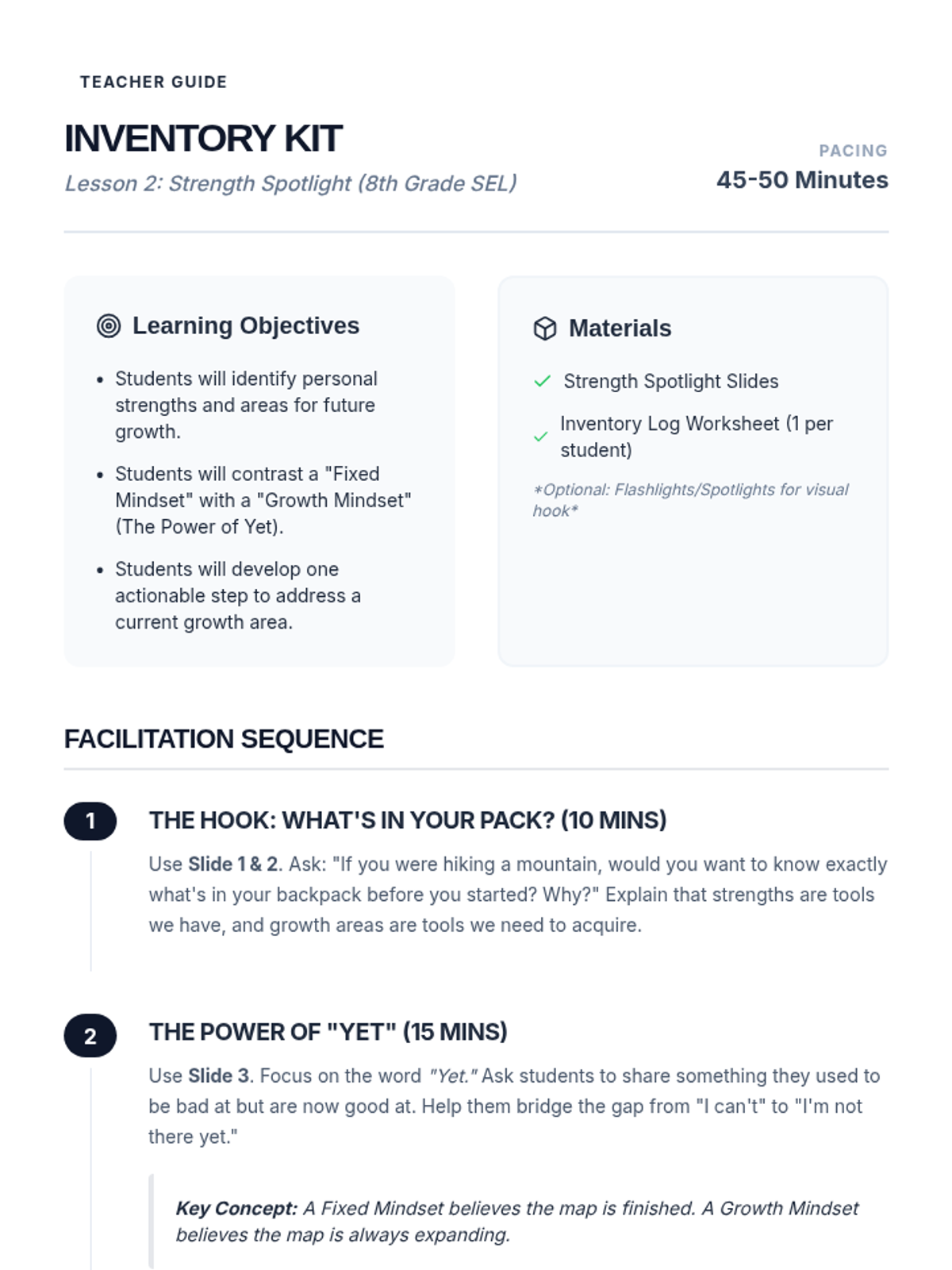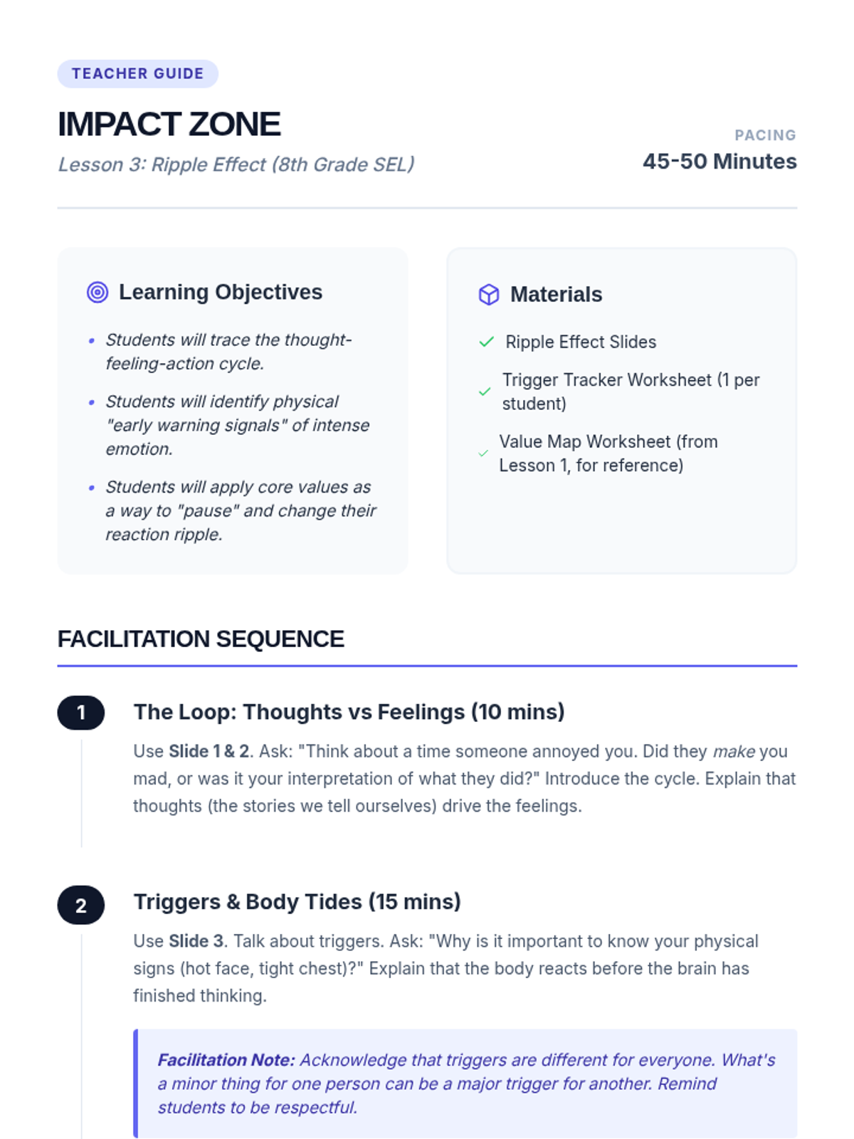 A comprehensive social-emotional learning sequence for middle schoolers, focusing on managing anxiety, reading social cues, developing a growth mindset, and resolving conflicts through de-escalation.