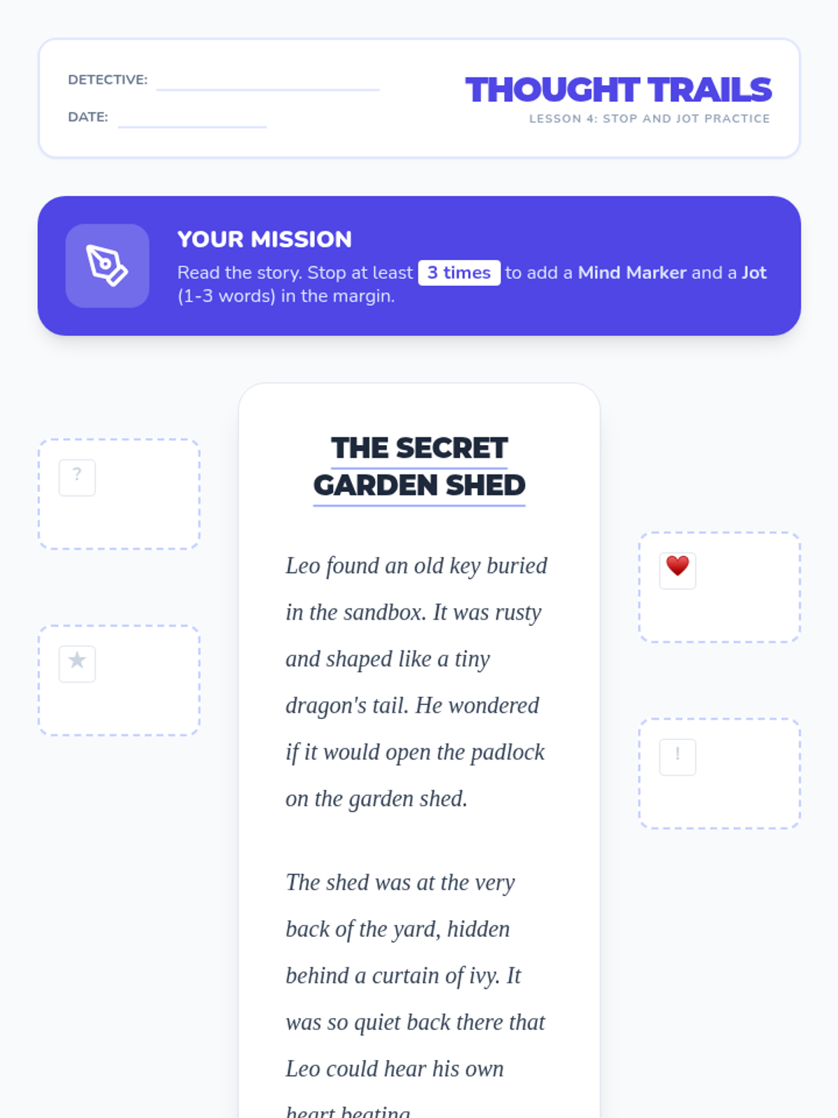 A three-lesson unit focused on identifying central ideas in short stories by distinguishing them from supporting details. Students will use the 'Plot Pathfinders' adventure theme to navigate narratives and uncover the core messages of texts.