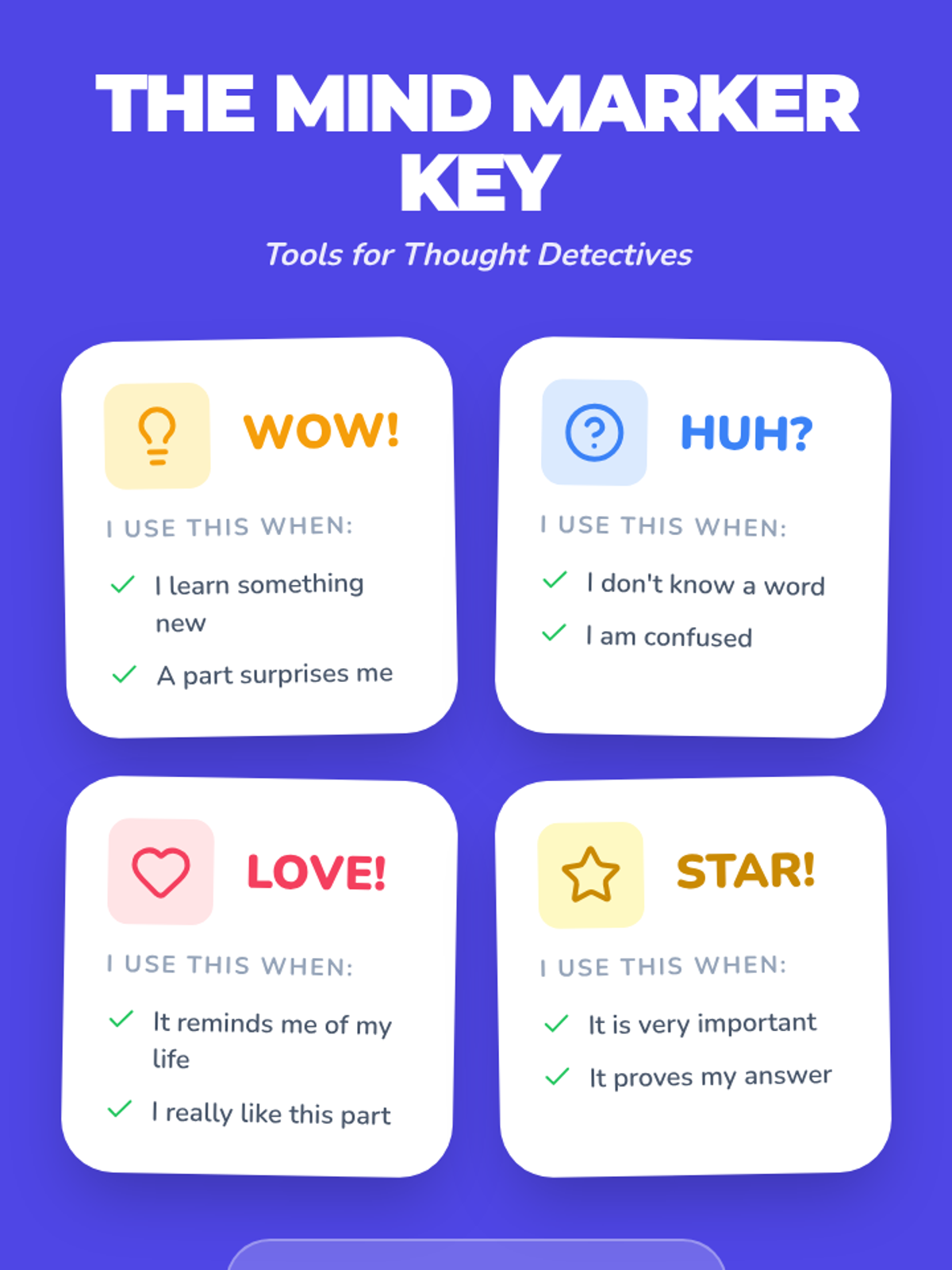 A 3rd-grade academic support sequence focused on metacognitive markers. Students learn to use symbols to track their thinking, identify confusion, and engage in evidence-based discussions.