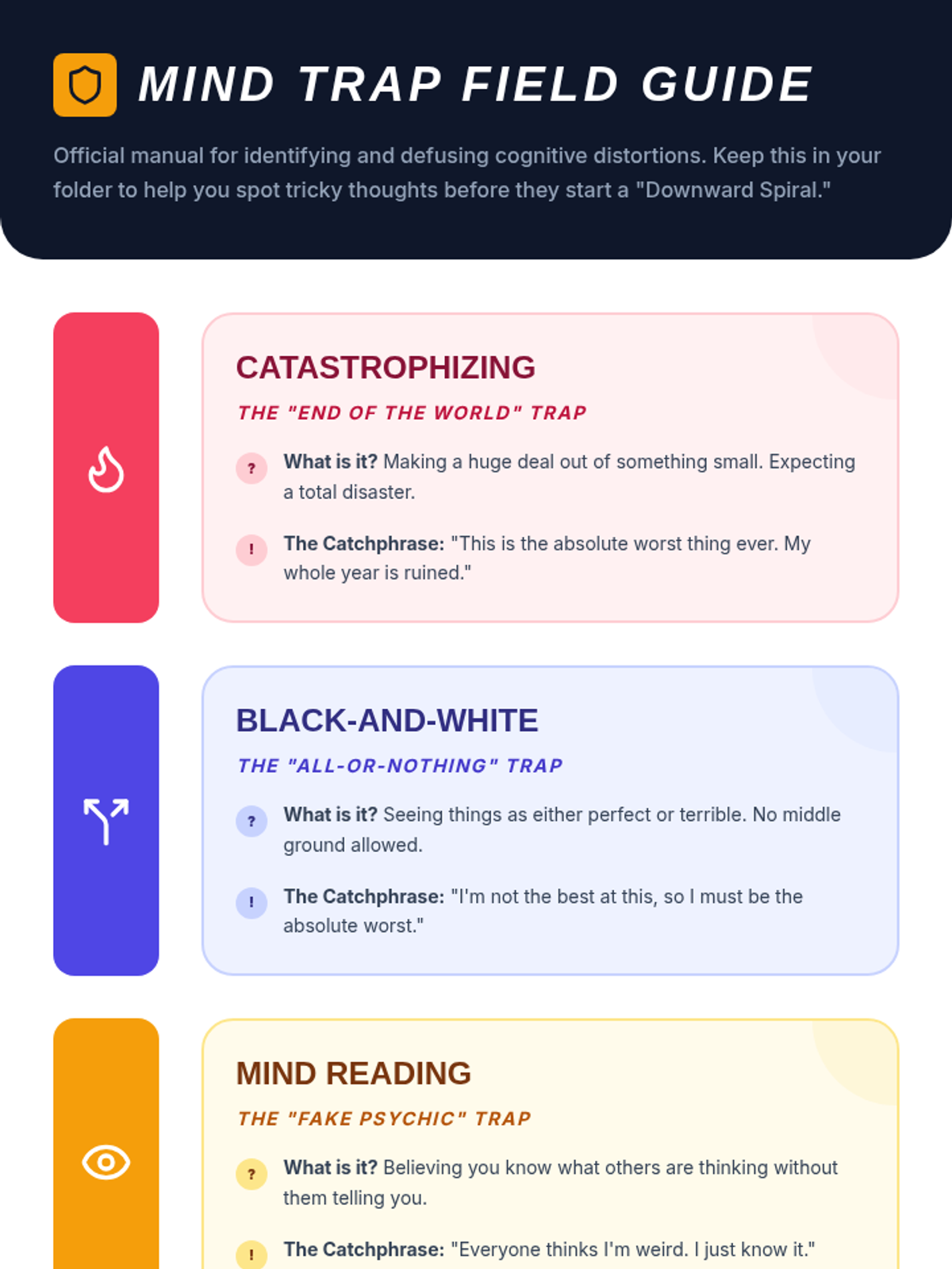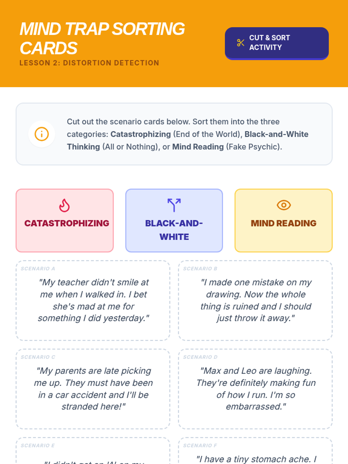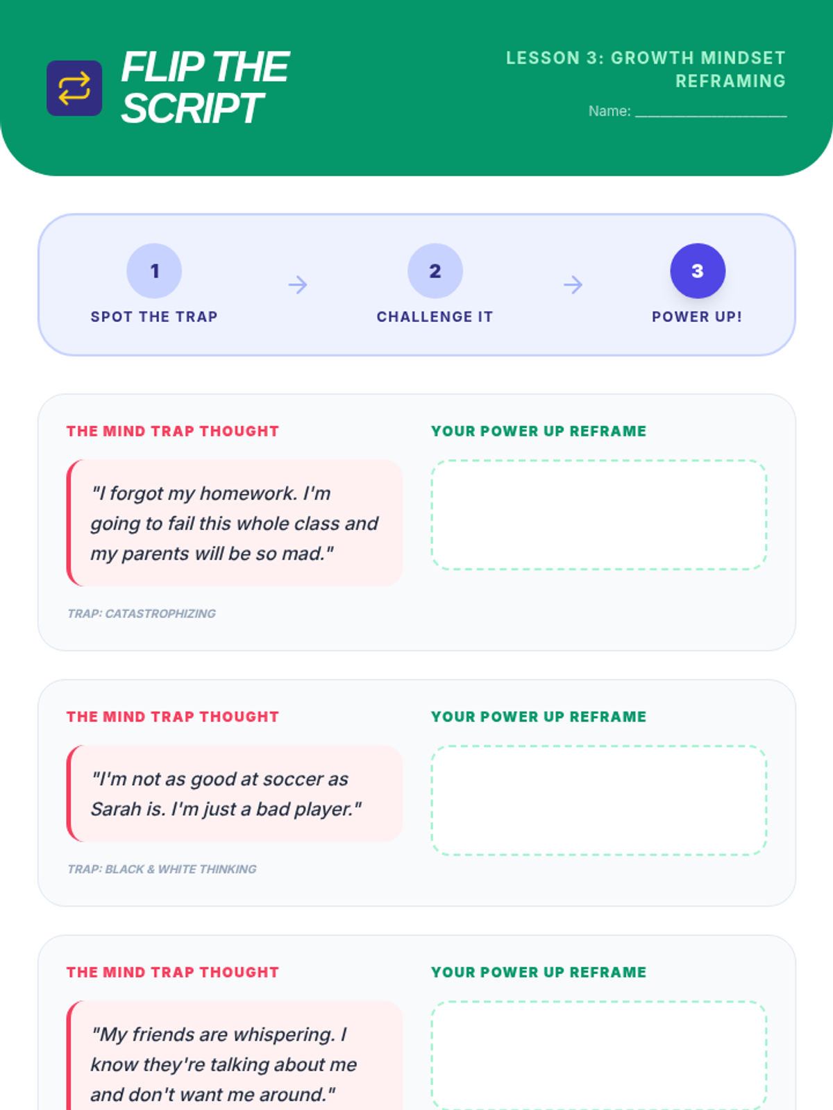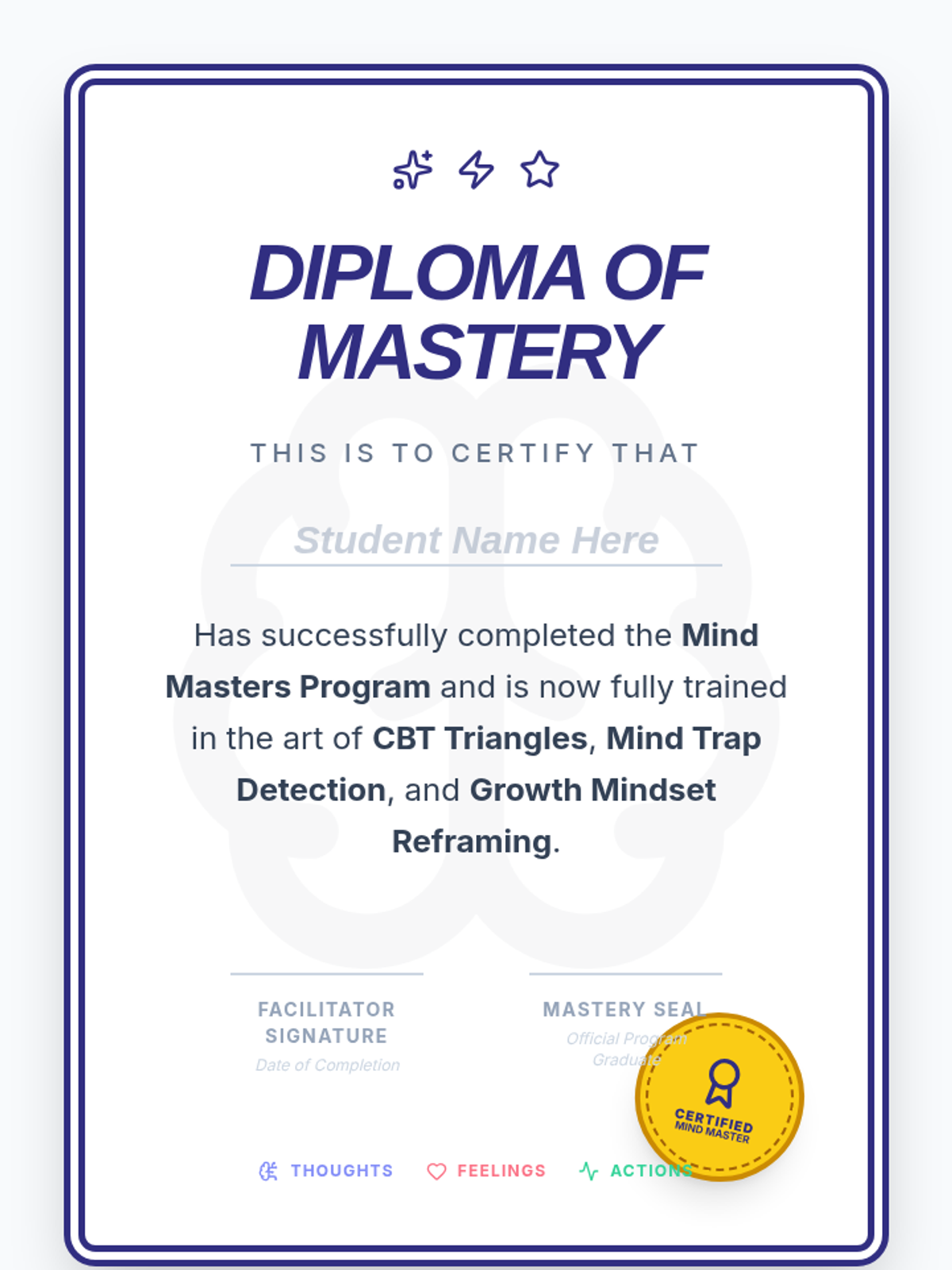 A comprehensive small-group program teaching students to identify negative thought patterns, understand the CBT triangle, and utilize growth mindset reframing to improve emotional well-being.