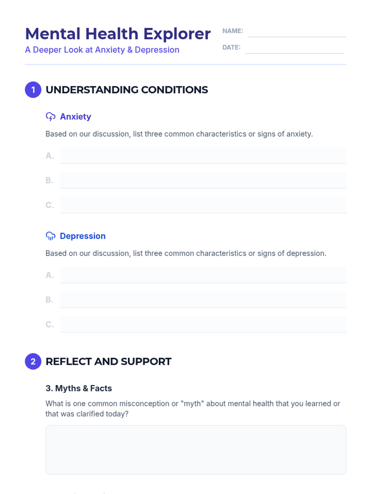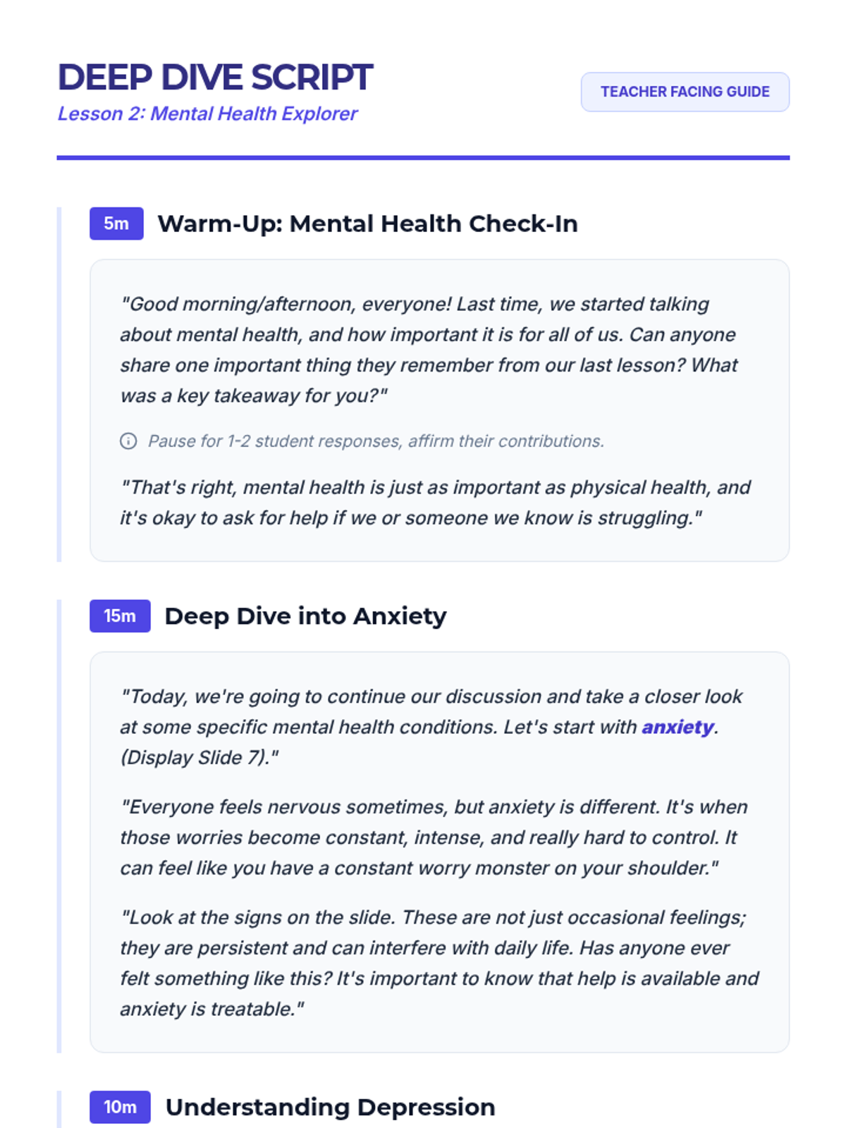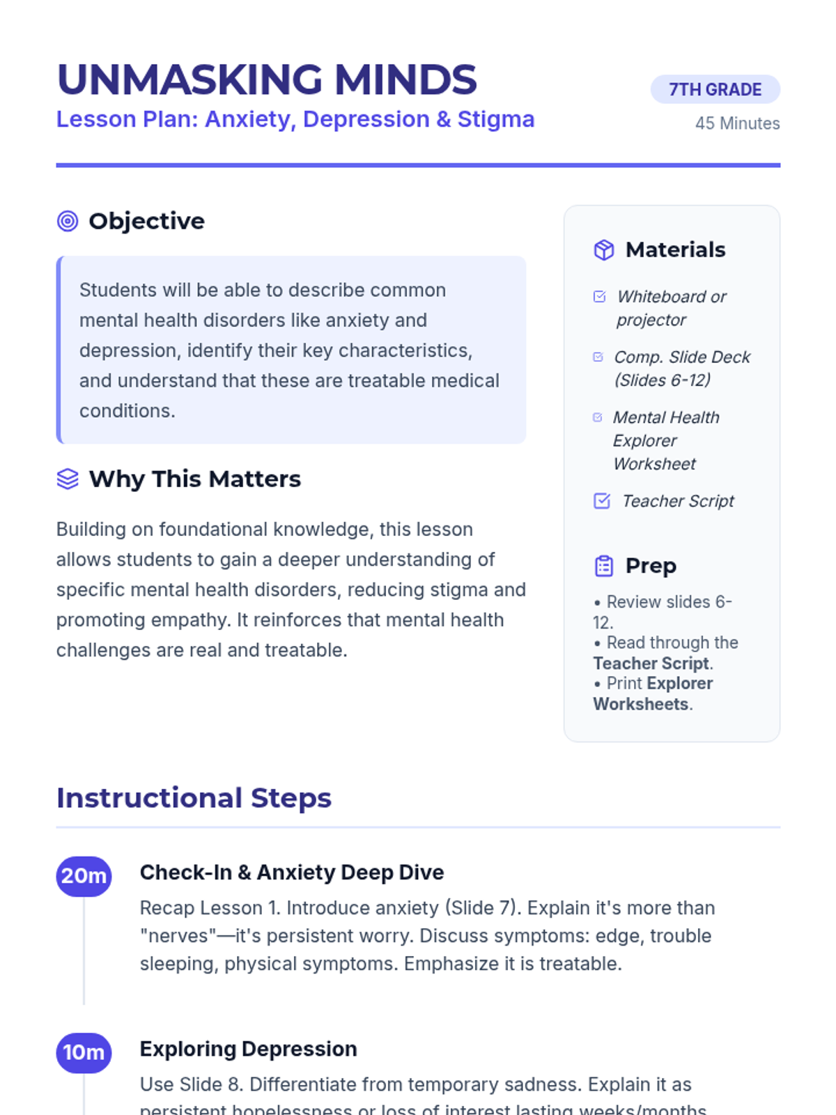 A two-part lesson sequence for 7th-grade students covering the fundamentals of mental health, recognizing warning signs of suicide, understanding anxiety and depression, and debunking common myths to reduce stigma.