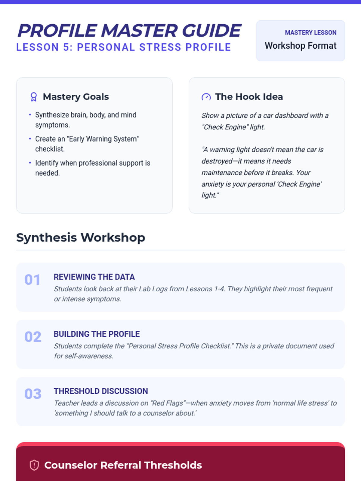 A series of three interactive counseling sessions for middle and high school students, focusing on self-discovery, emotional regulation, and future planning. Using a 'Blueprint' aesthetic, students engage in hands-on activities to map out their internal identities, manage external stressors, and construct actionable goals.
