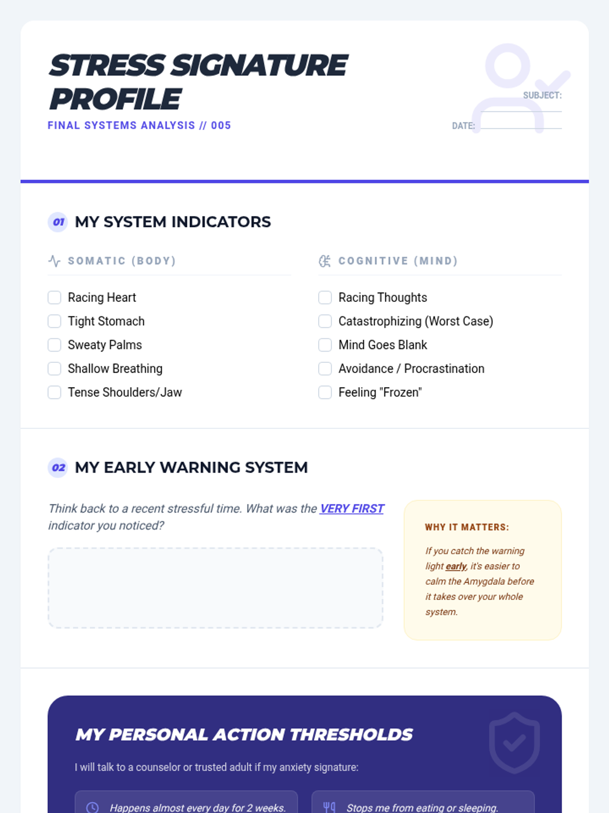 A scientific and self-reflective exploration of the 'fight, flight, or freeze' response, helping 7th-grade students identify their unique physiological and cognitive responses to stress and anxiety.