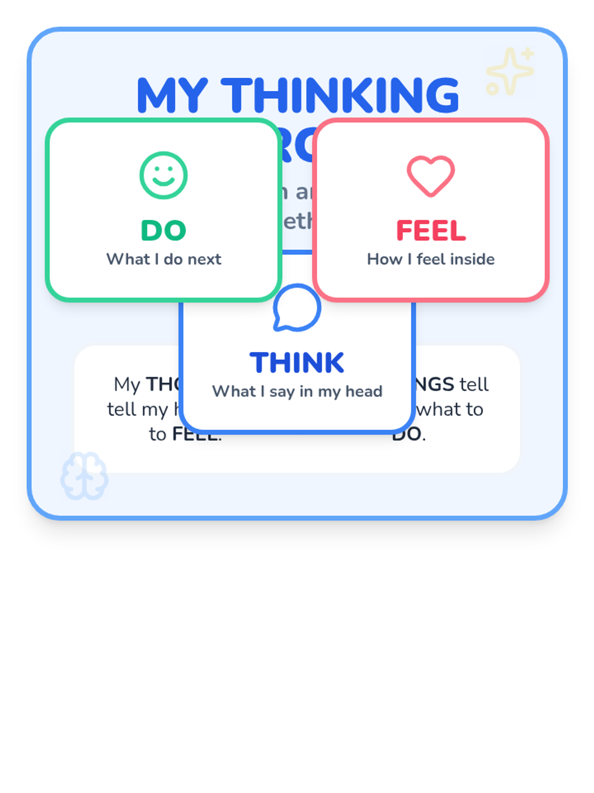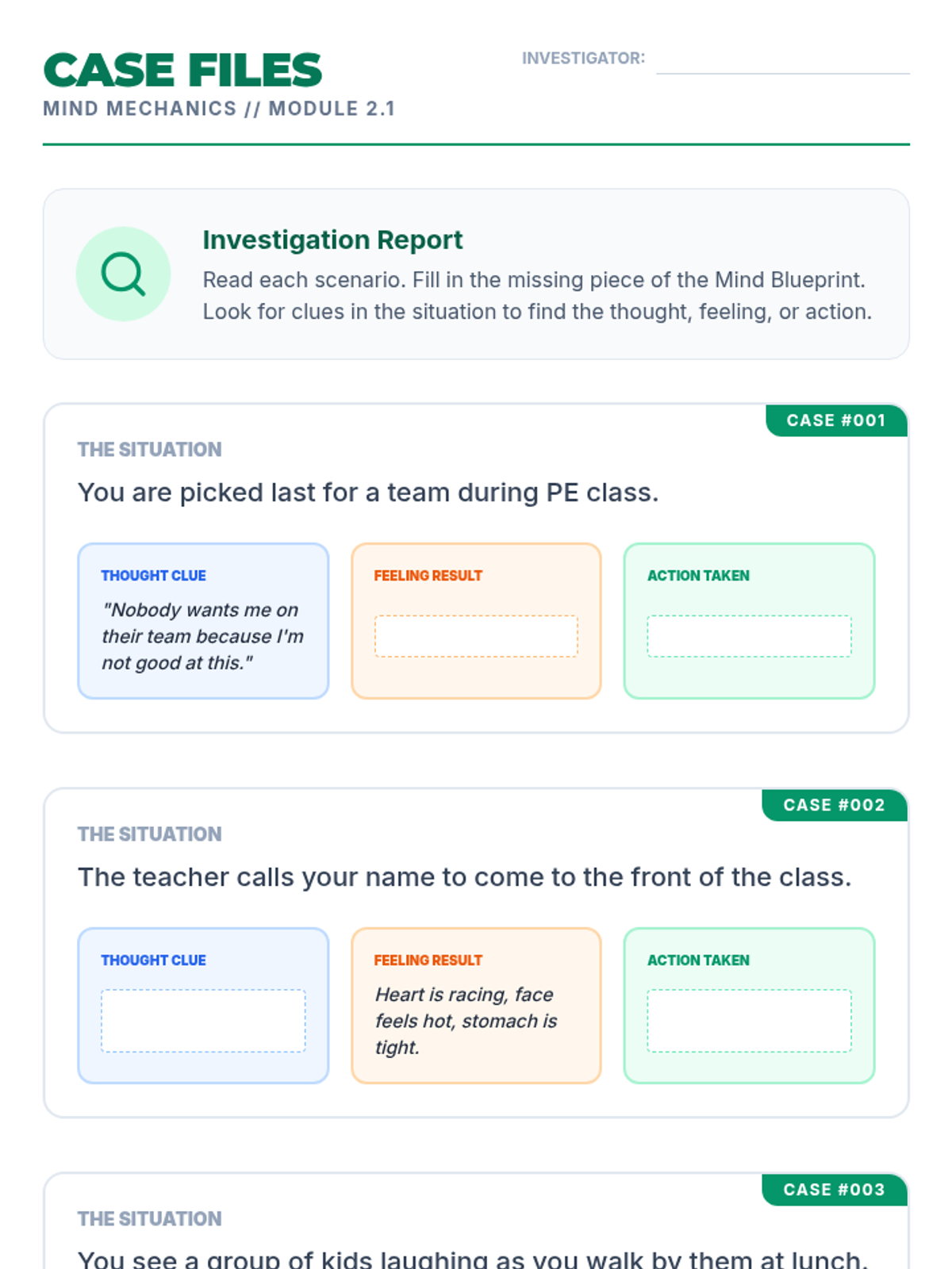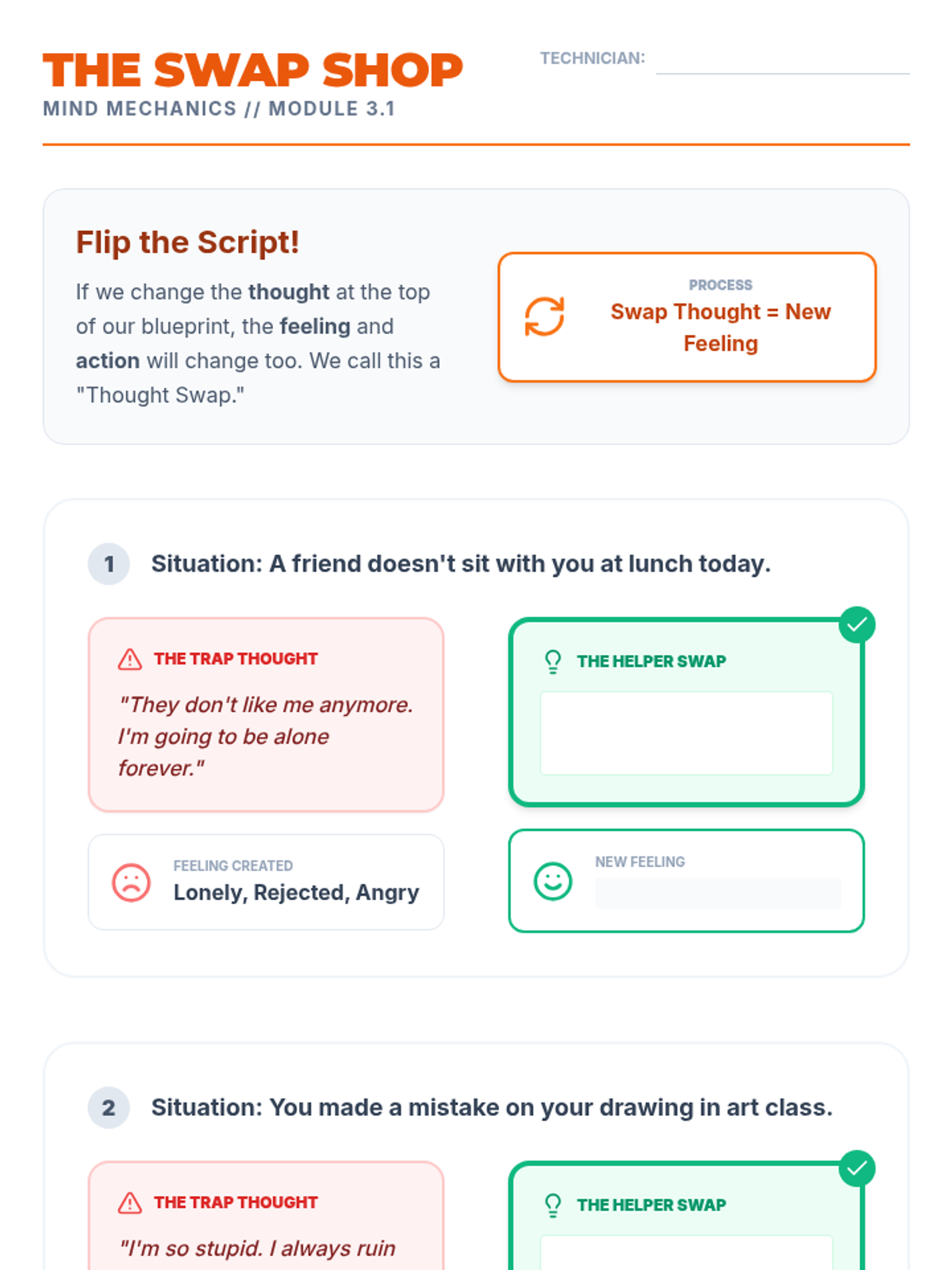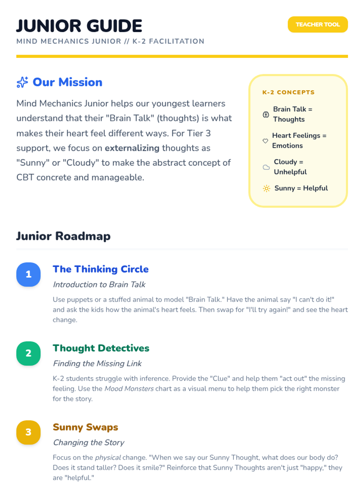 A Tier 3 CBT intervention sequence focusing on the cognitive triangle: how thoughts lead to feelings, which drive behaviors. Designed for intensive, small-group or individual support.