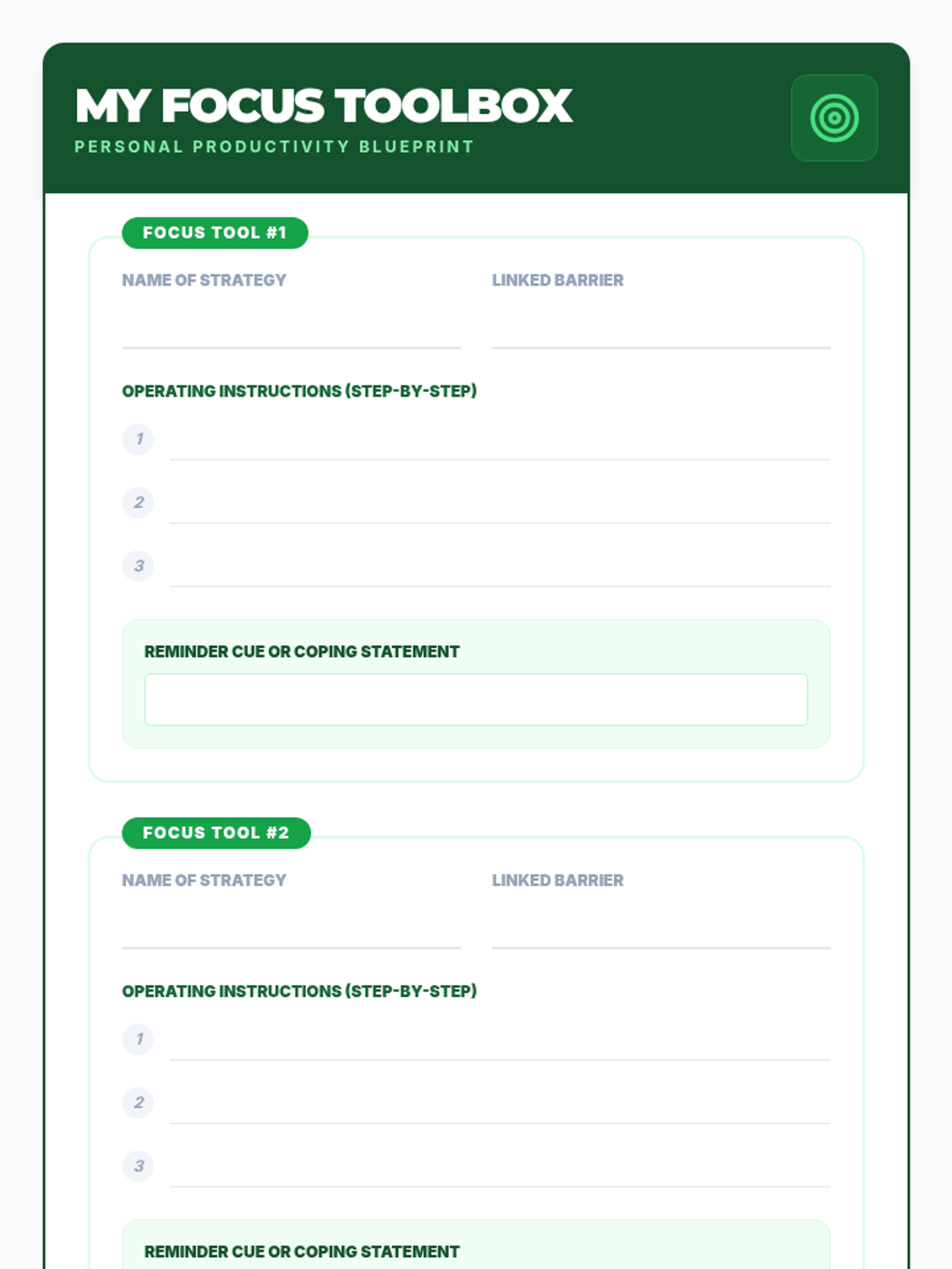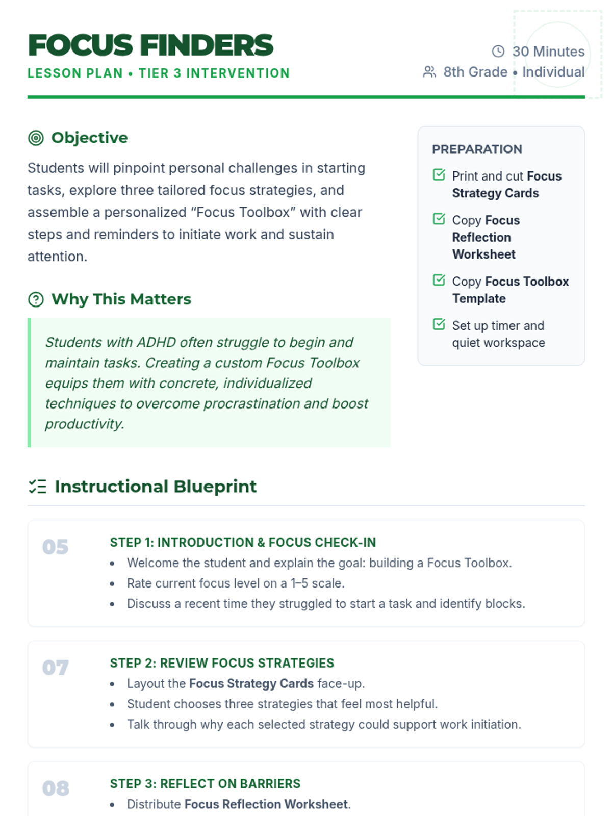 A Tier 3 intervention series for 8th graders to build personalized self-regulation and focus skills. Students identify triggers, explore evidence-based strategies, and assemble custom toolboxes for emotional control and task management.