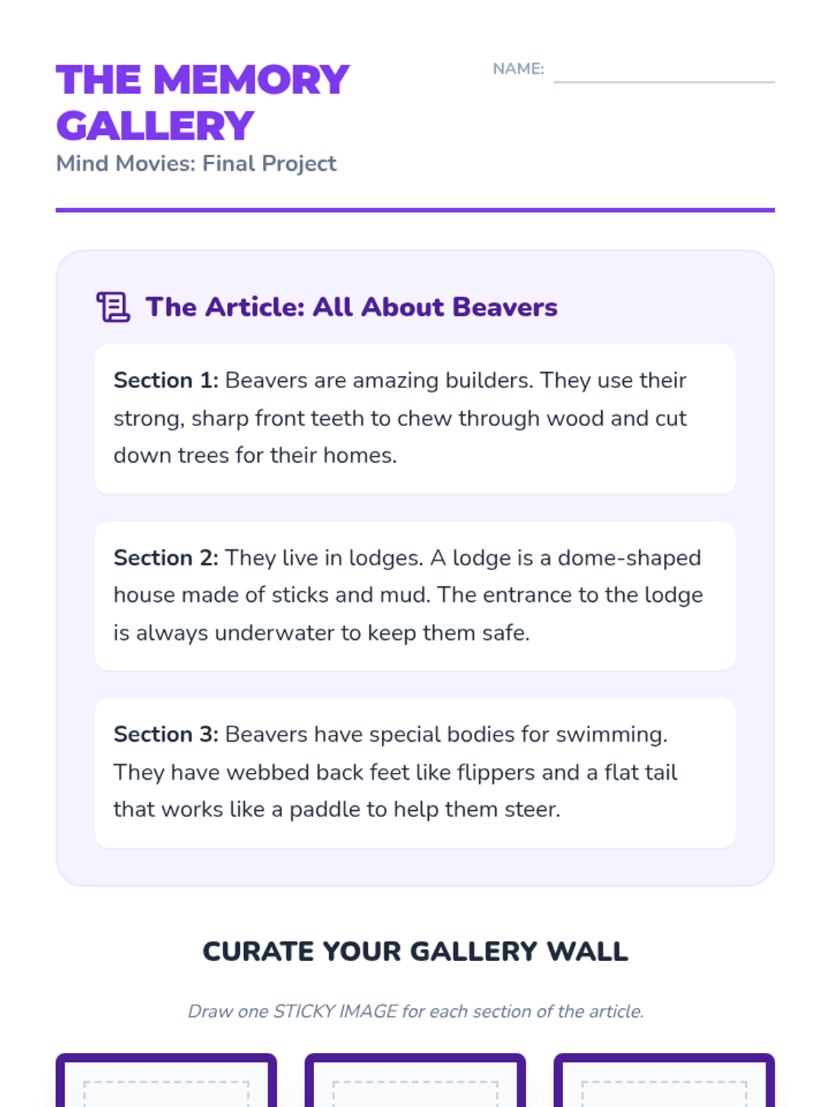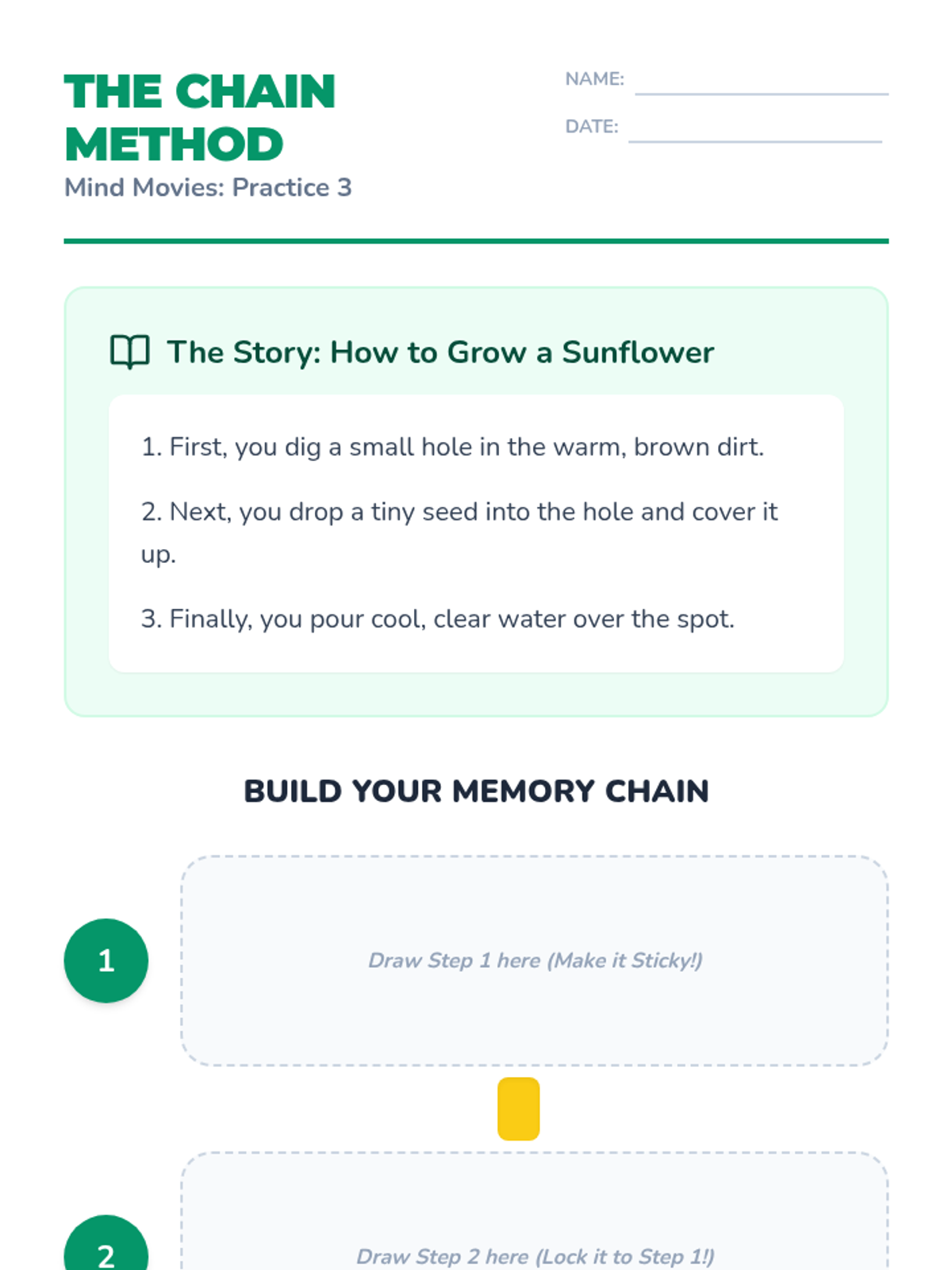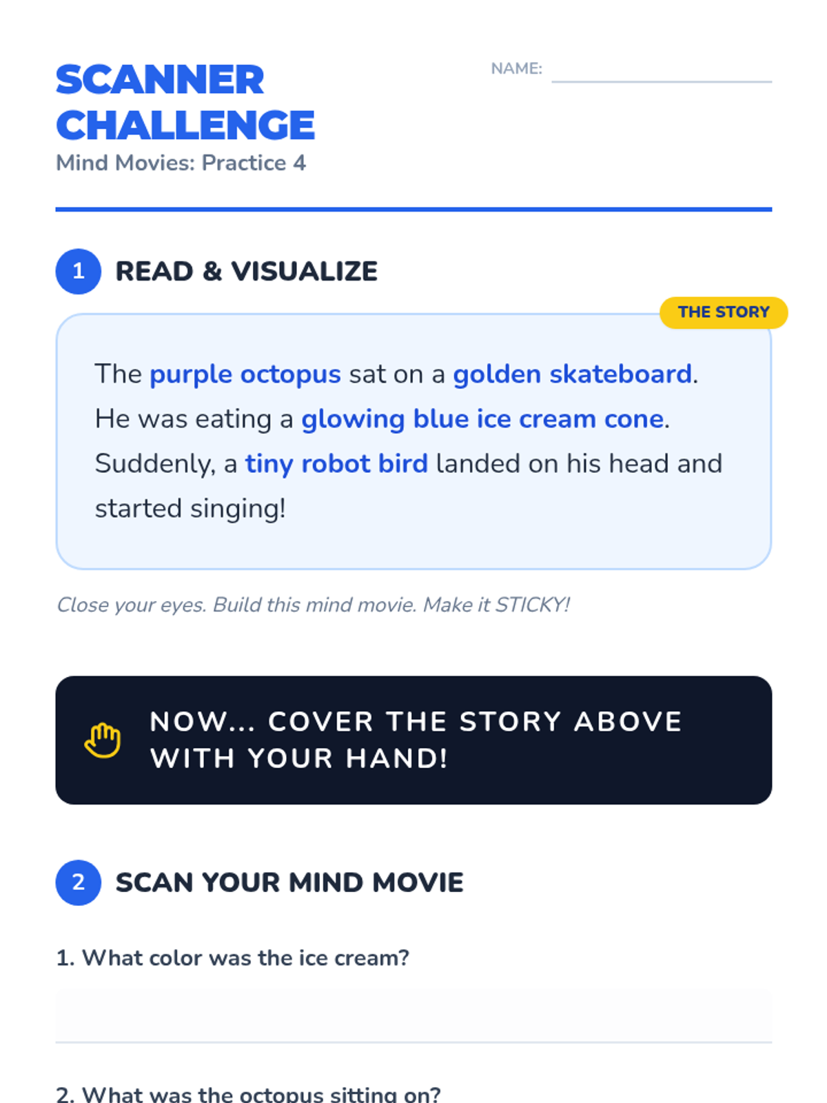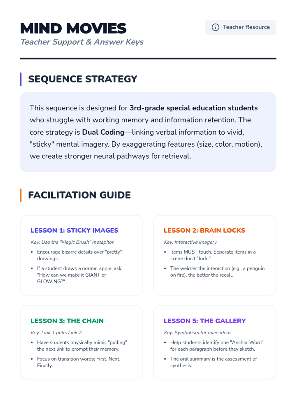 A sequence for 3rd-grade special education students focusing on visualization strategies to improve memory retention and recall. Students learn to create 'sticky' mental images, link concepts, and sequence information using mental imagery.
