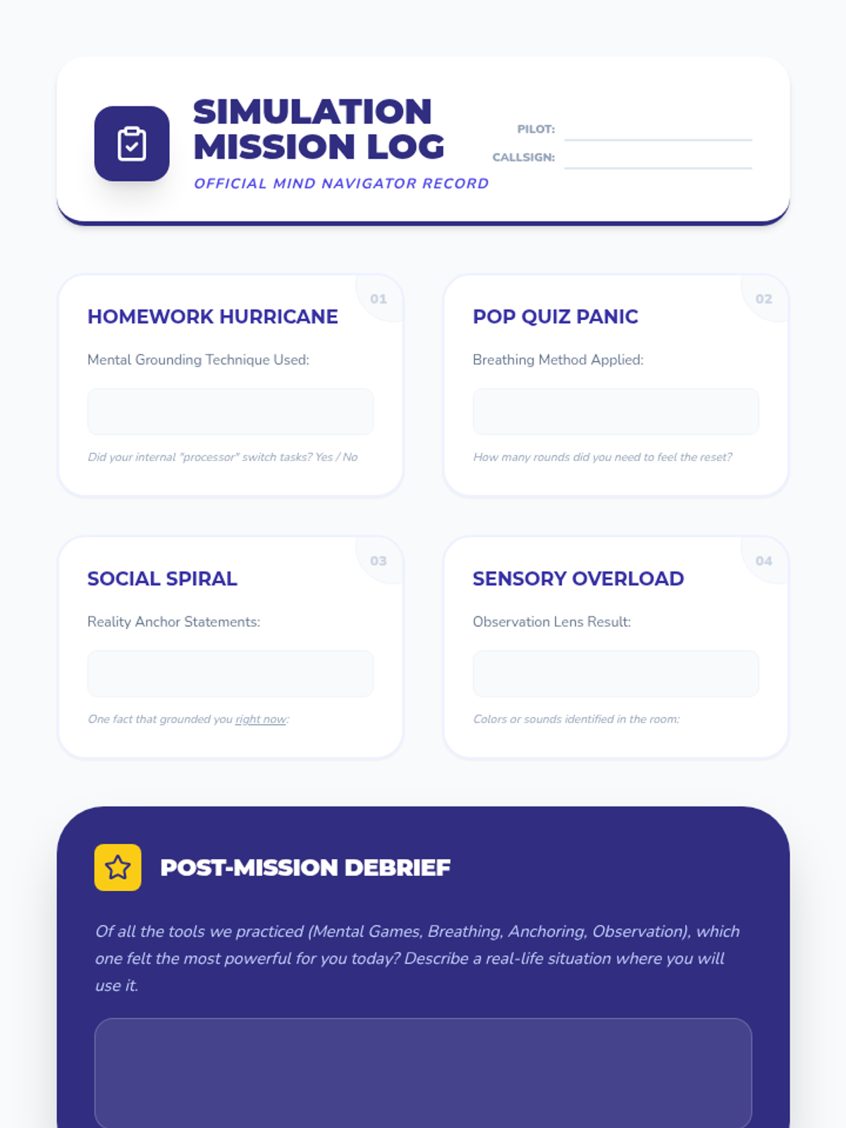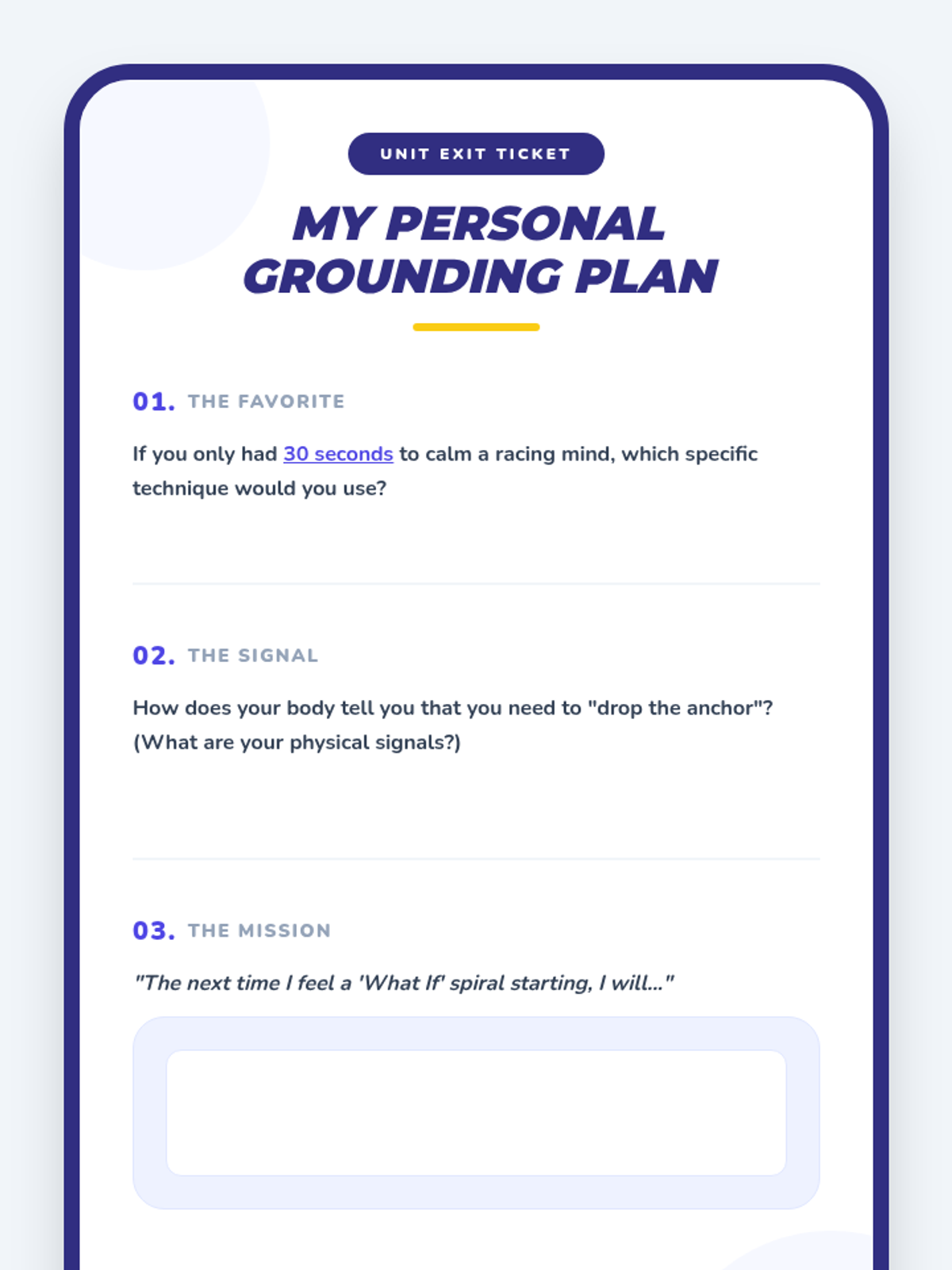 A series of three interactive counseling sessions for middle and high school students, focusing on self-discovery, emotional regulation, and future planning. Using a 'Blueprint' aesthetic, students engage in hands-on activities to map out their internal identities, manage external stressors, and construct actionable goals.