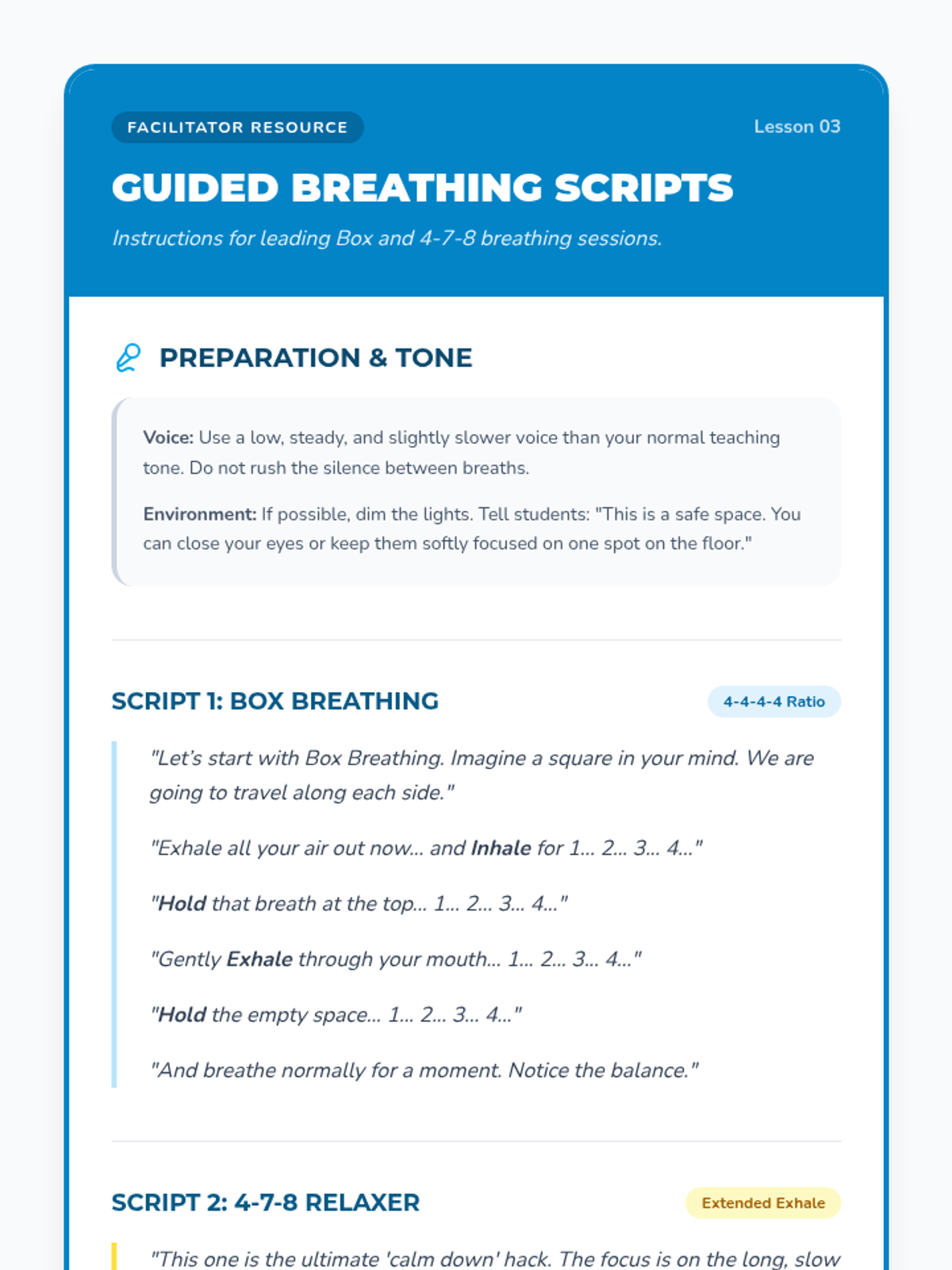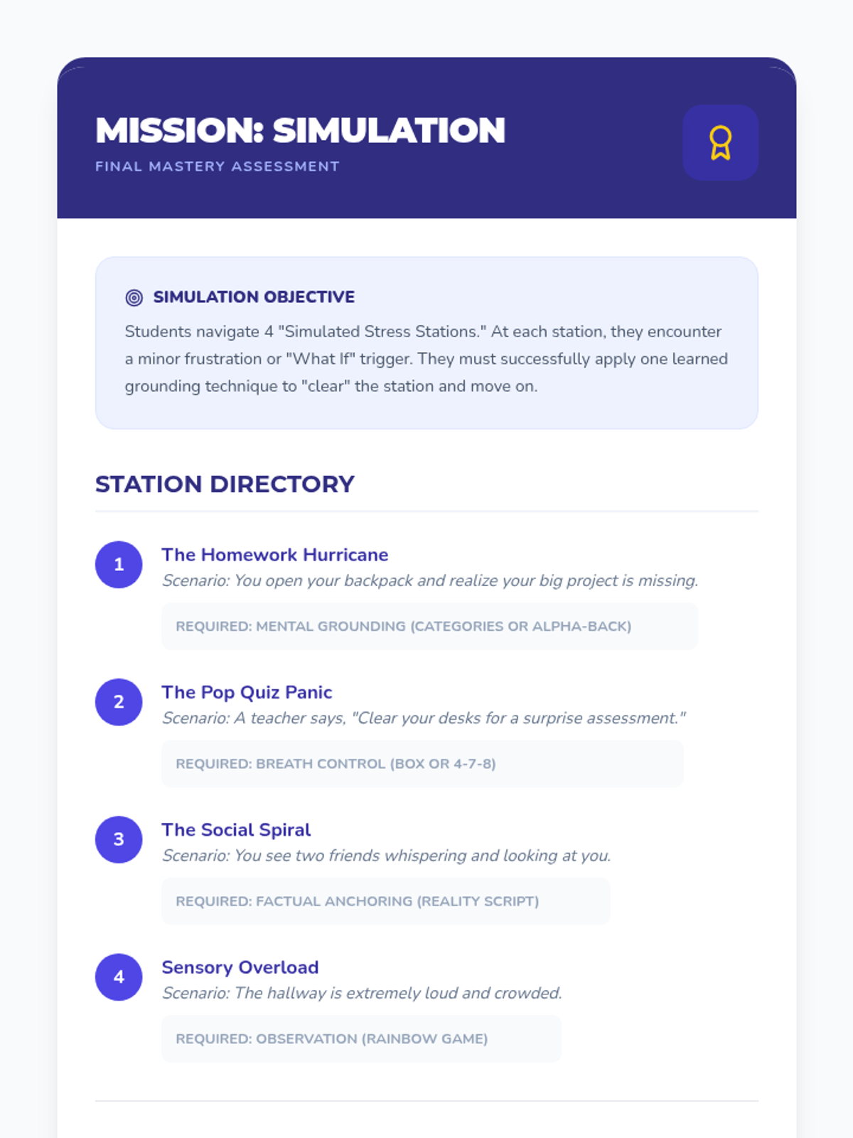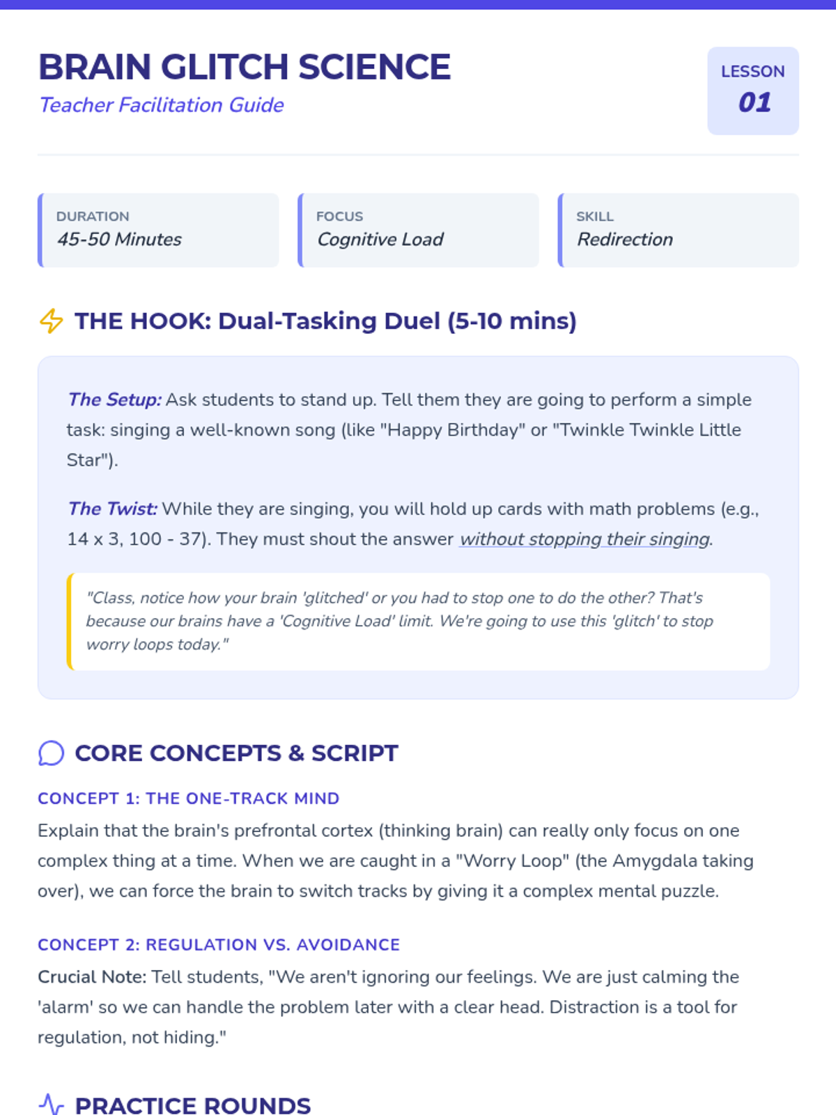 A comprehensive sequence for 6th graders on cognitive distraction and breathing techniques. Students learn how to interrupt anxiety loops using mental games, categorization, physiological regulation, and factual anchoring.