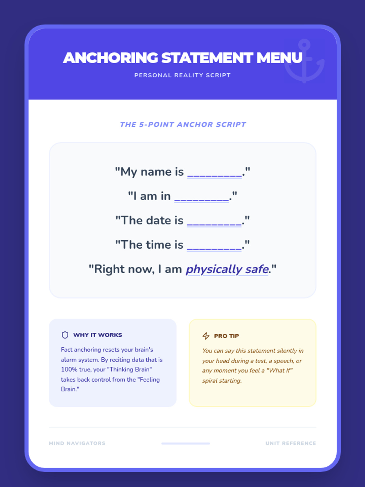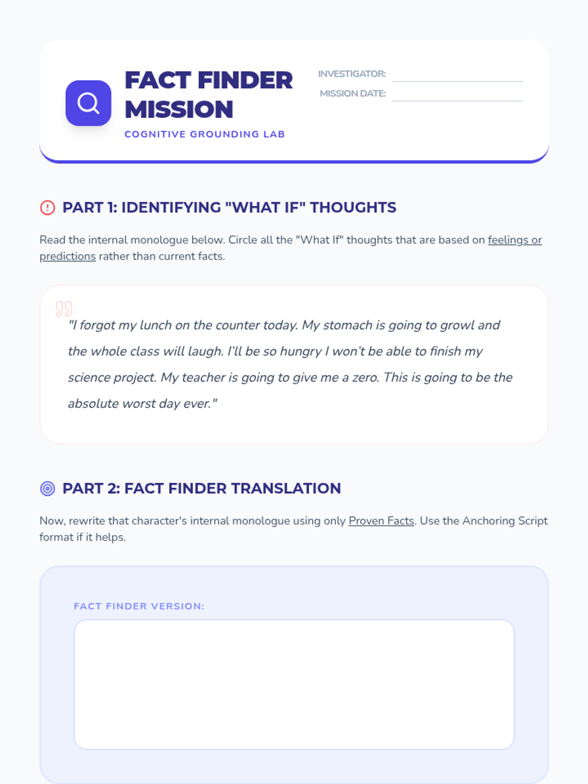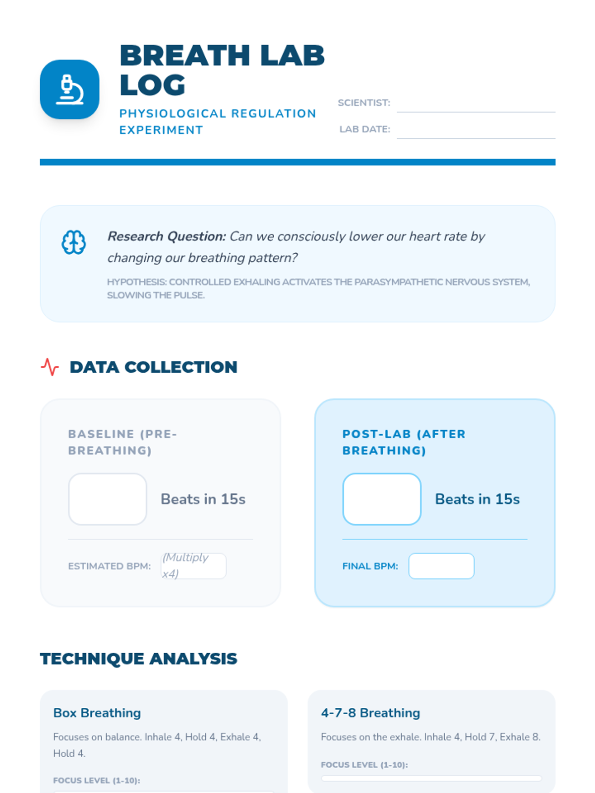 A comprehensive sequence for 6th graders on cognitive distraction and breathing techniques. Students learn how to interrupt anxiety loops using mental games, categorization, physiological regulation, and factual anchoring.