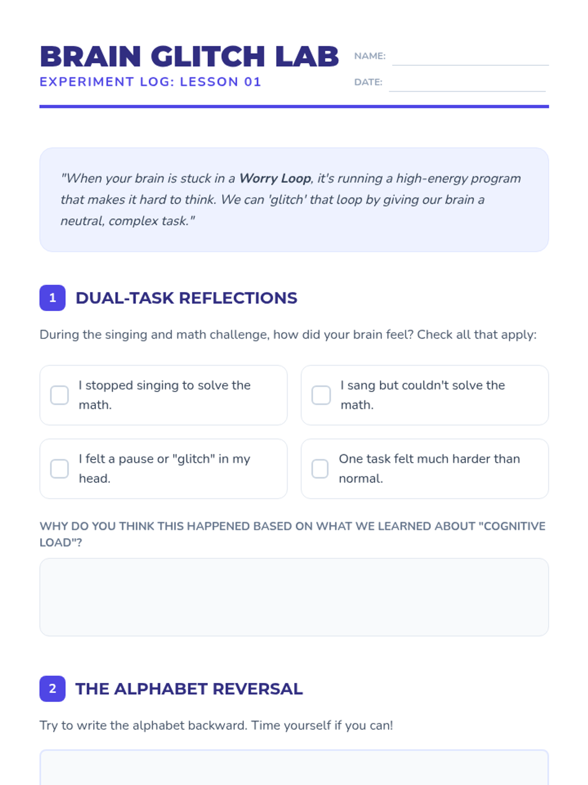 A comprehensive 6-week gamified counseling curriculum for middle schoolers. It uses a 'cyber-defense' theme to help students identify, challenge, and 'patch' cognitive distortions (brain glitches) through interactive games, scenario-based learning, and cognitive-behavioral techniques.