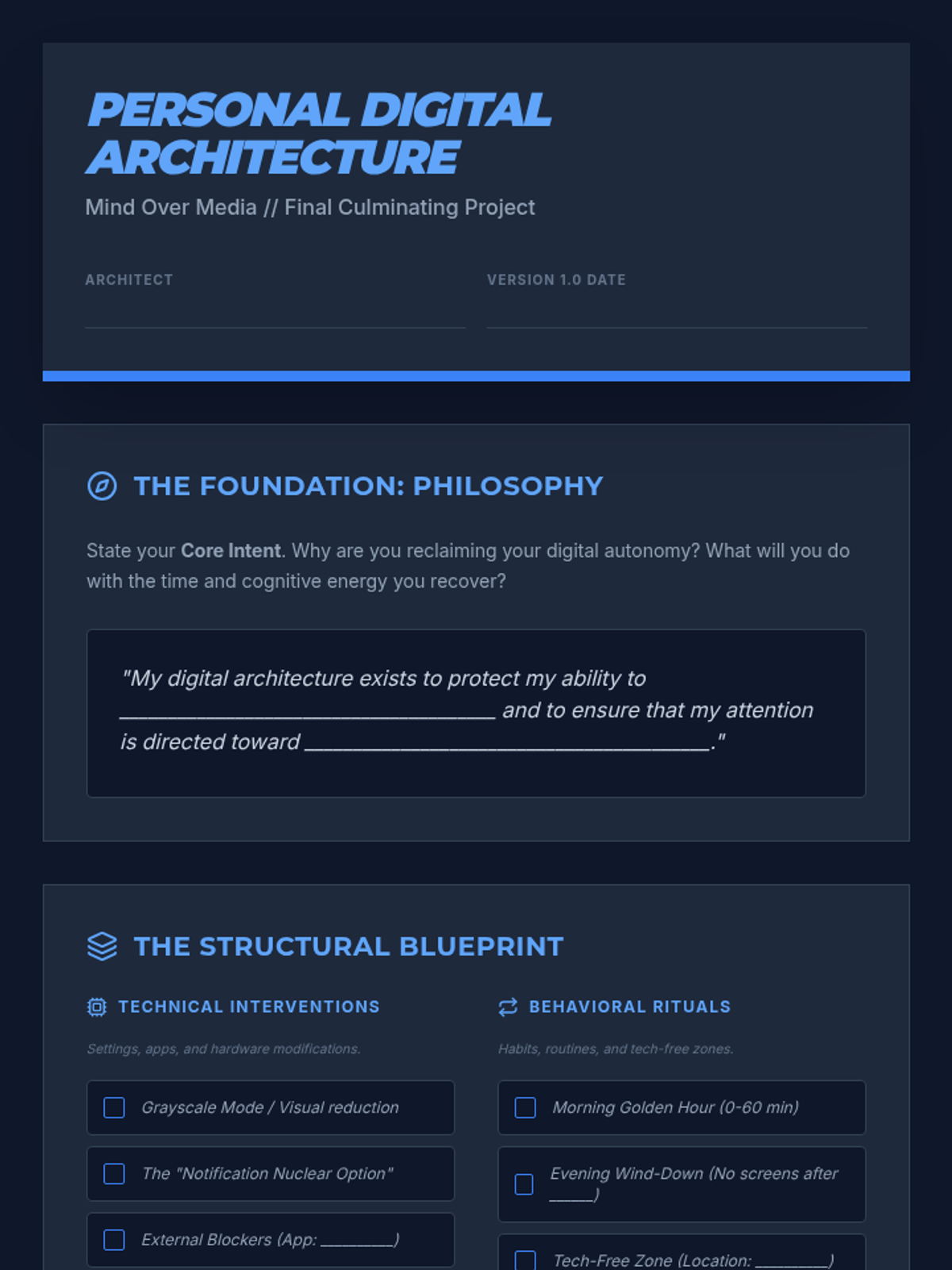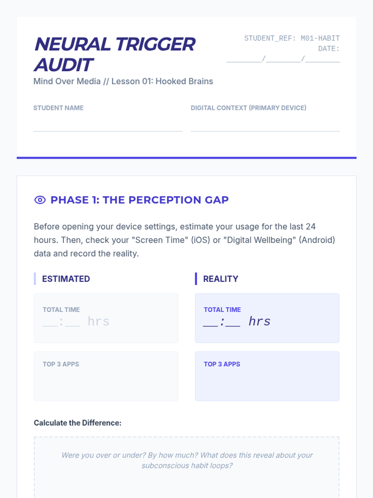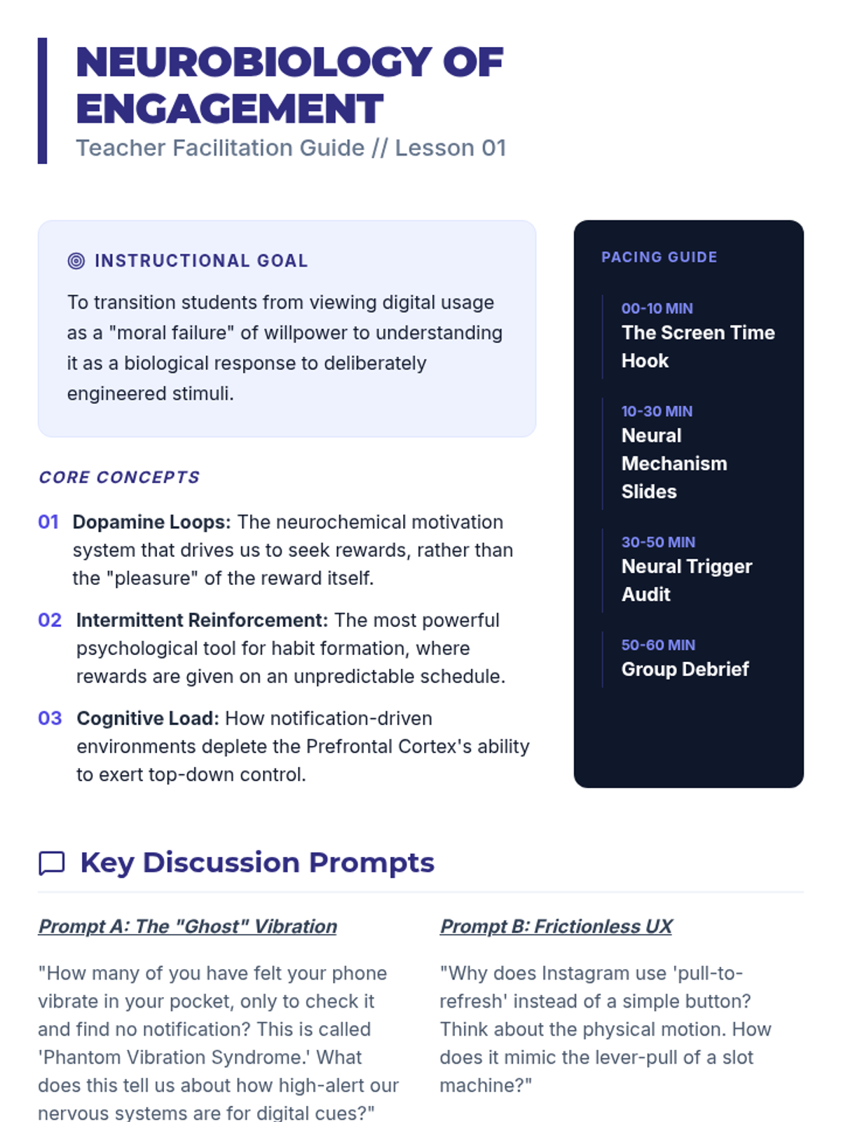 A comprehensive sequence for undergraduate students exploring the intersection of neuroscience, economics, and psychology within the digital ecosystem. Students move from understanding biological habit loops to constructing a personalized framework for digital autonomy and professional wellbeing.