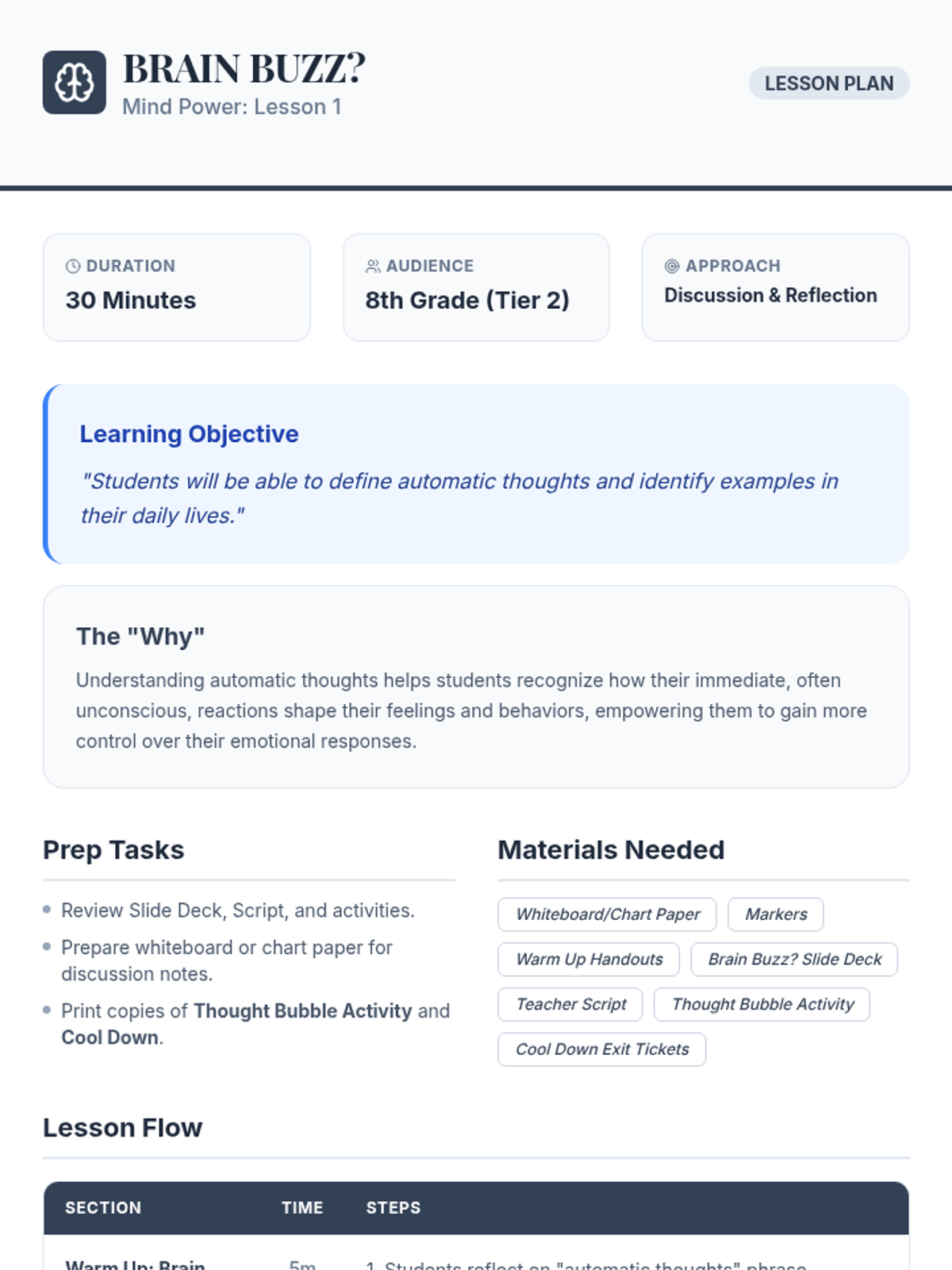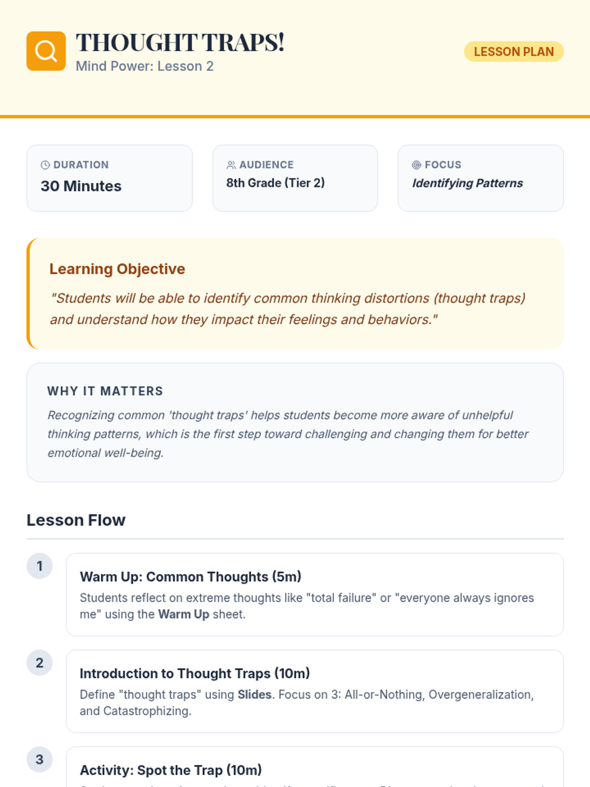 A comprehensive 9-session Tier 2 social-emotional learning curriculum for 8th graders, focusing on cognitive-behavioral strategies, emotional regulation, and interpersonal skills.