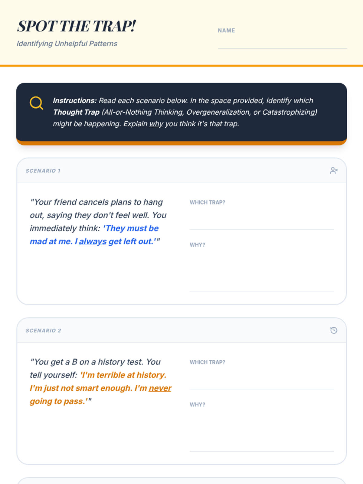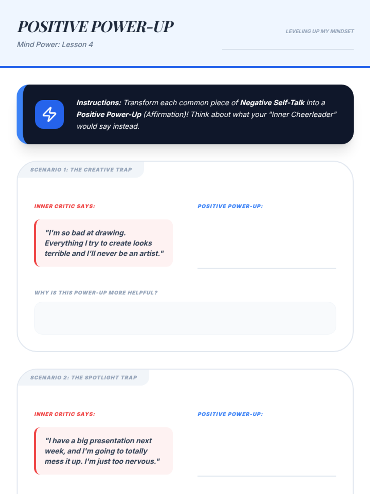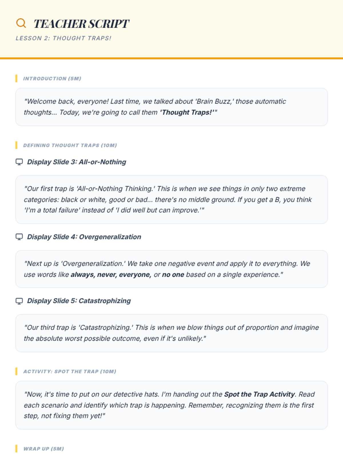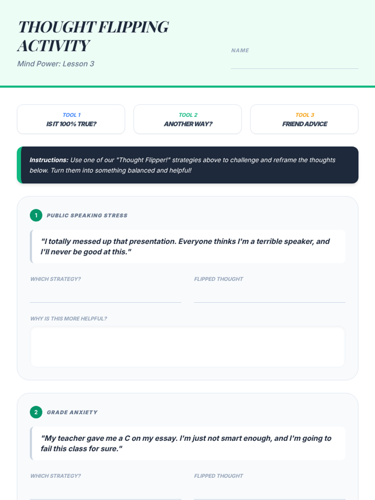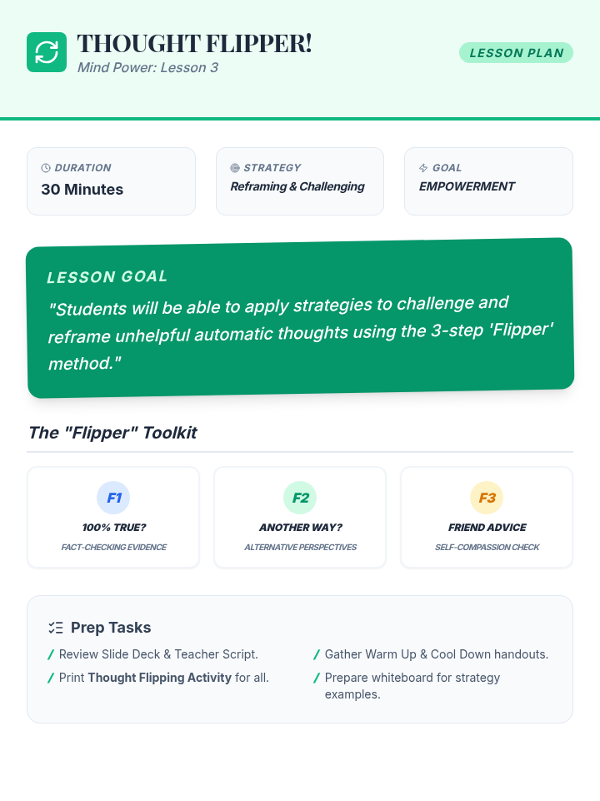 A comprehensive 6-week gamified counseling curriculum for middle schoolers. It uses a 'cyber-defense' theme to help students identify, challenge, and 'patch' cognitive distortions (brain glitches) through interactive games, scenario-based learning, and cognitive-behavioral techniques.