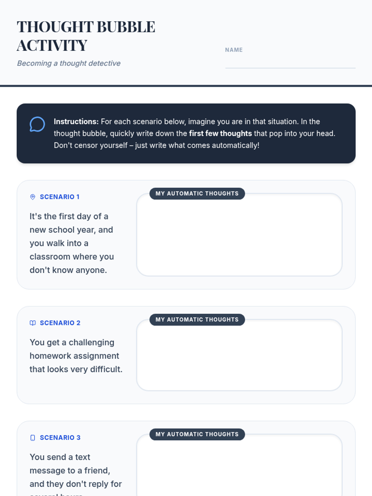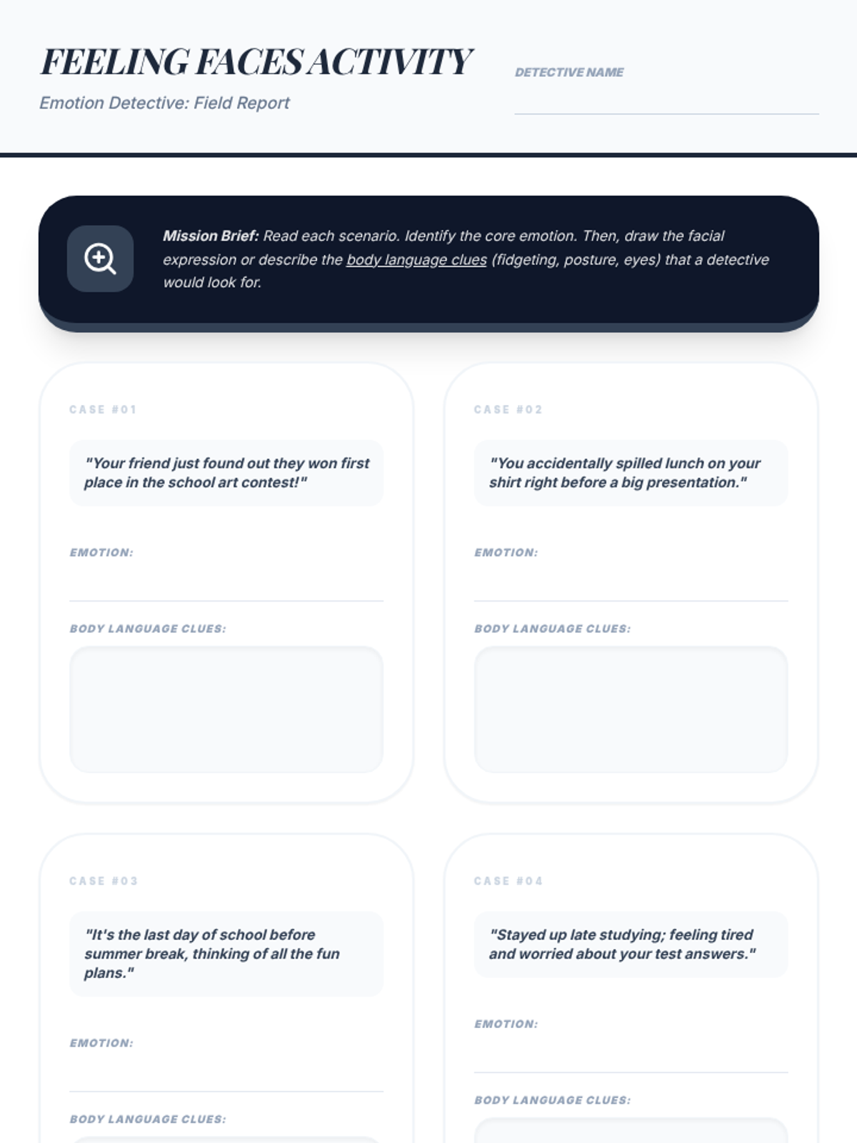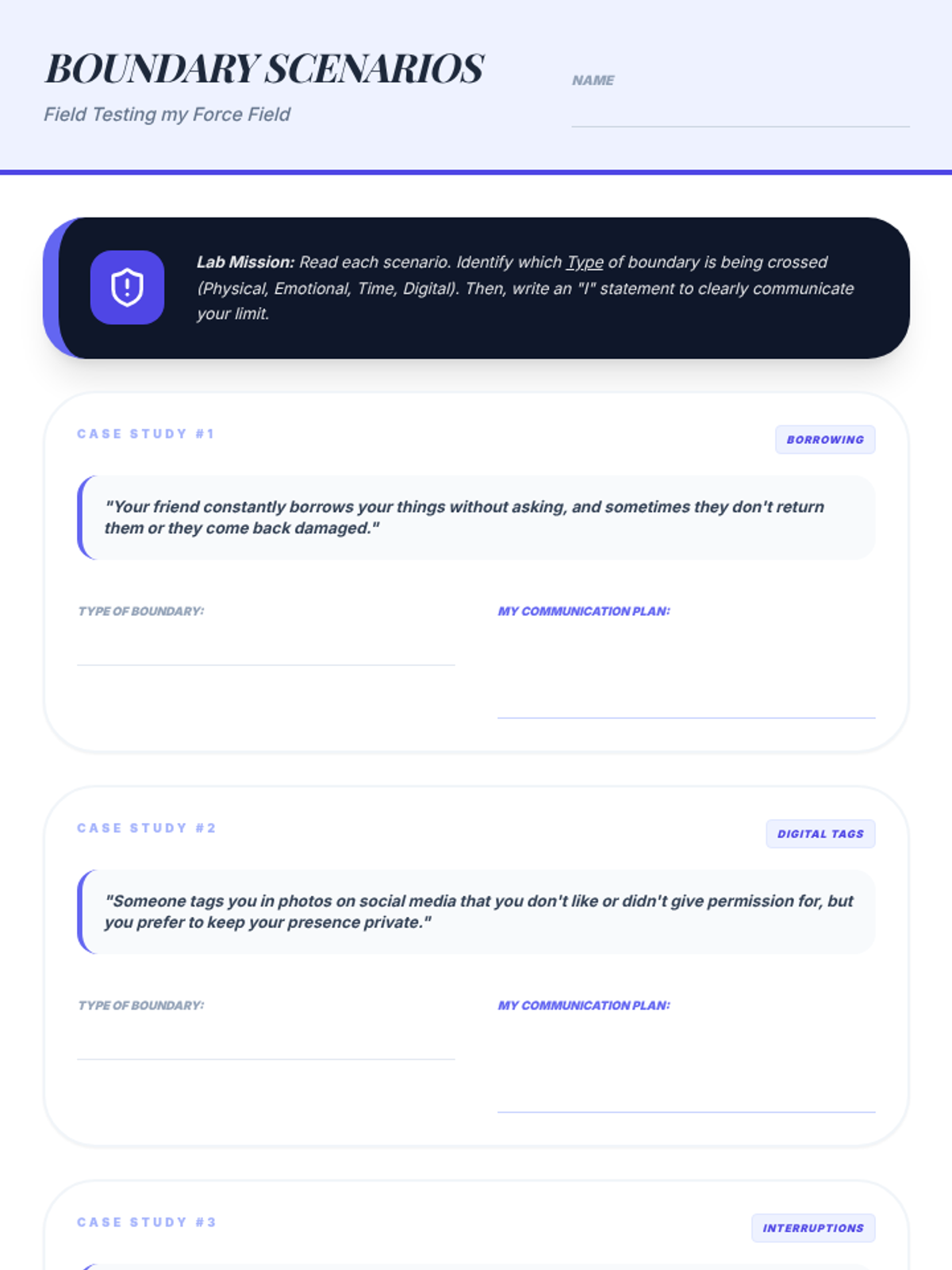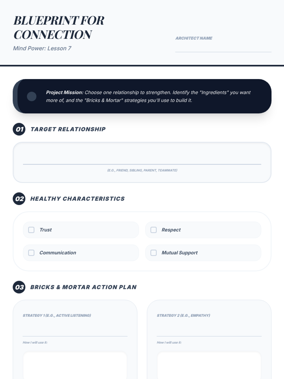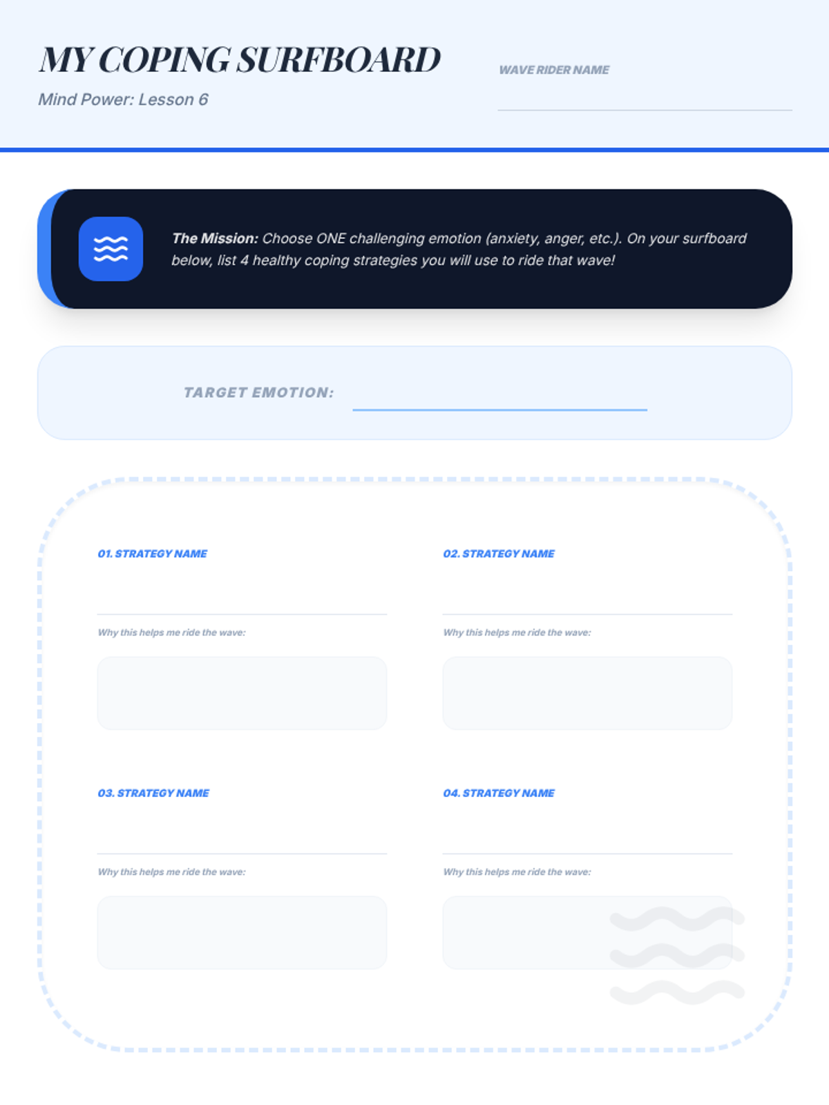 A series of three interactive counseling sessions for middle and high school students, focusing on self-discovery, emotional regulation, and future planning. Using a 'Blueprint' aesthetic, students engage in hands-on activities to map out their internal identities, manage external stressors, and construct actionable goals.