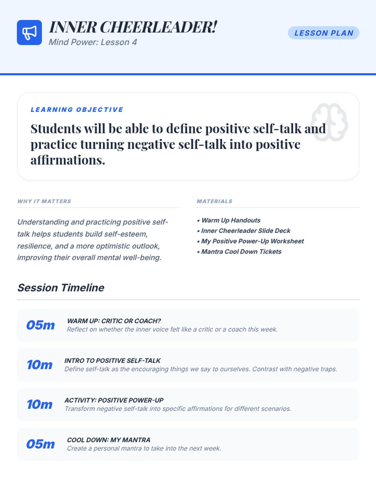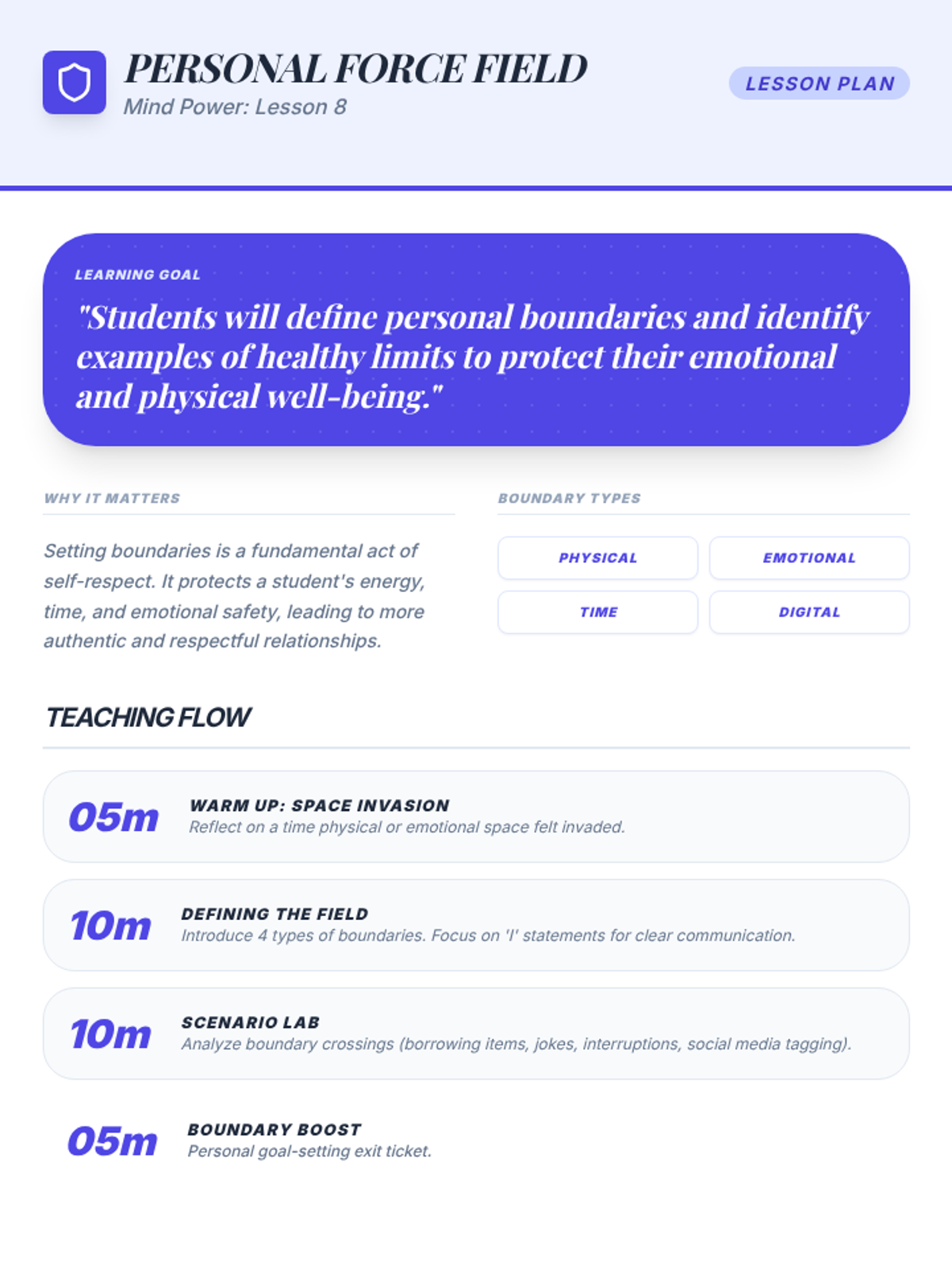 A comprehensive life-skills unit designed to help middle schoolers transition smoothly into their new academic and social environment. The sequence covers organization, self-advocacy, social dynamics, resilience, and personal responsibility.