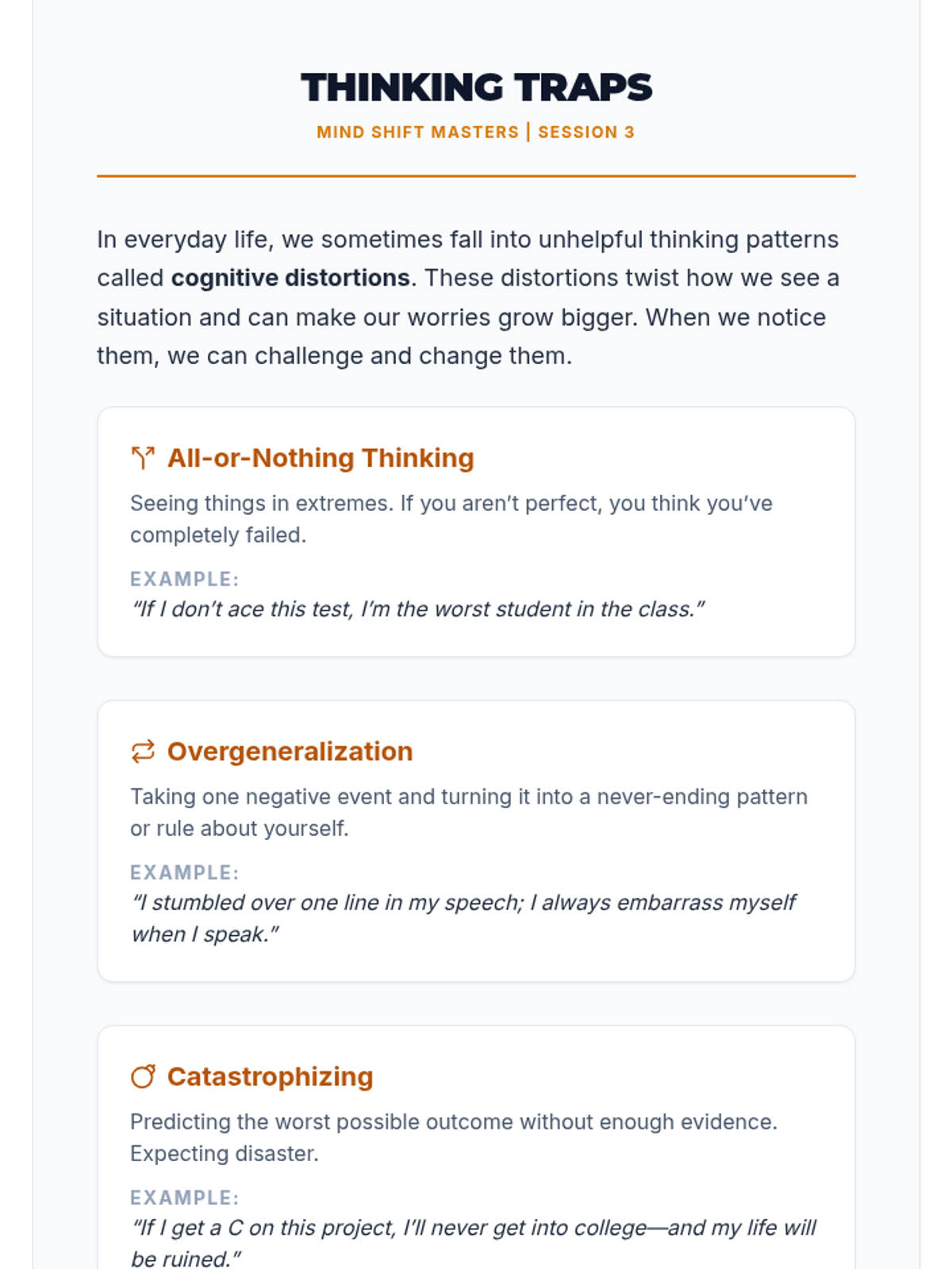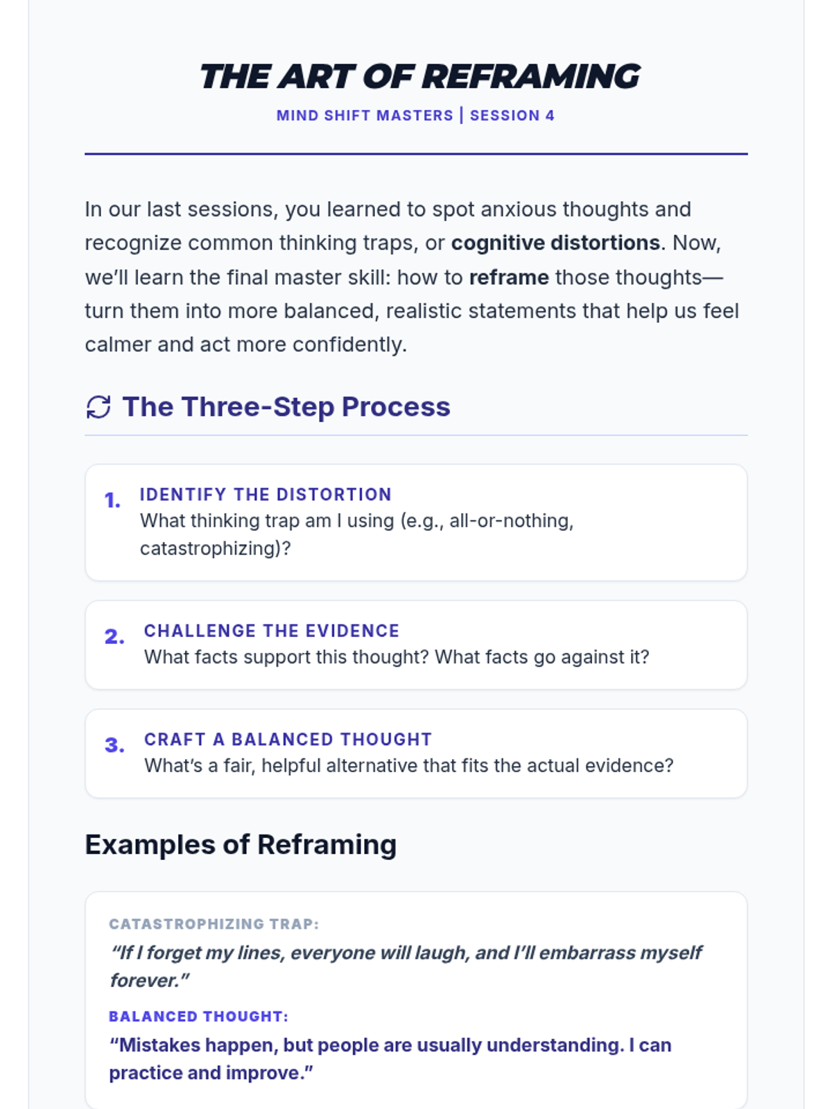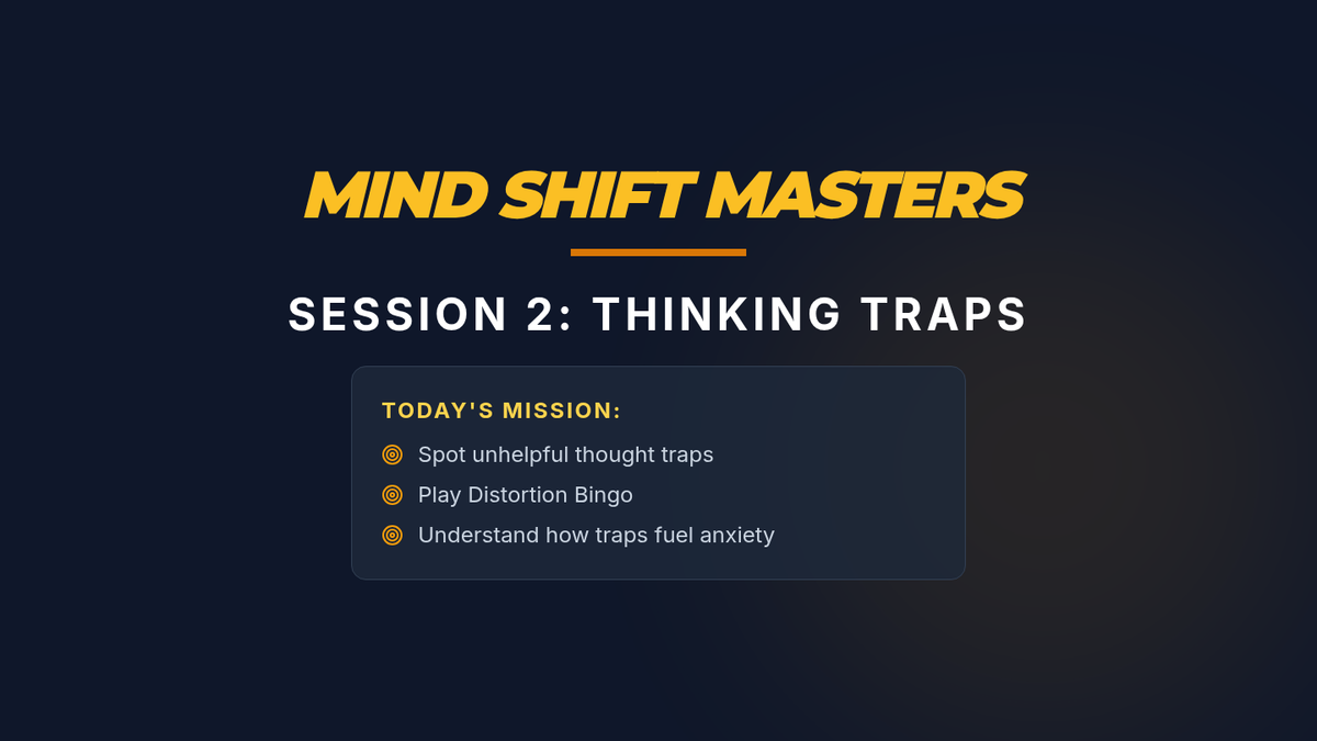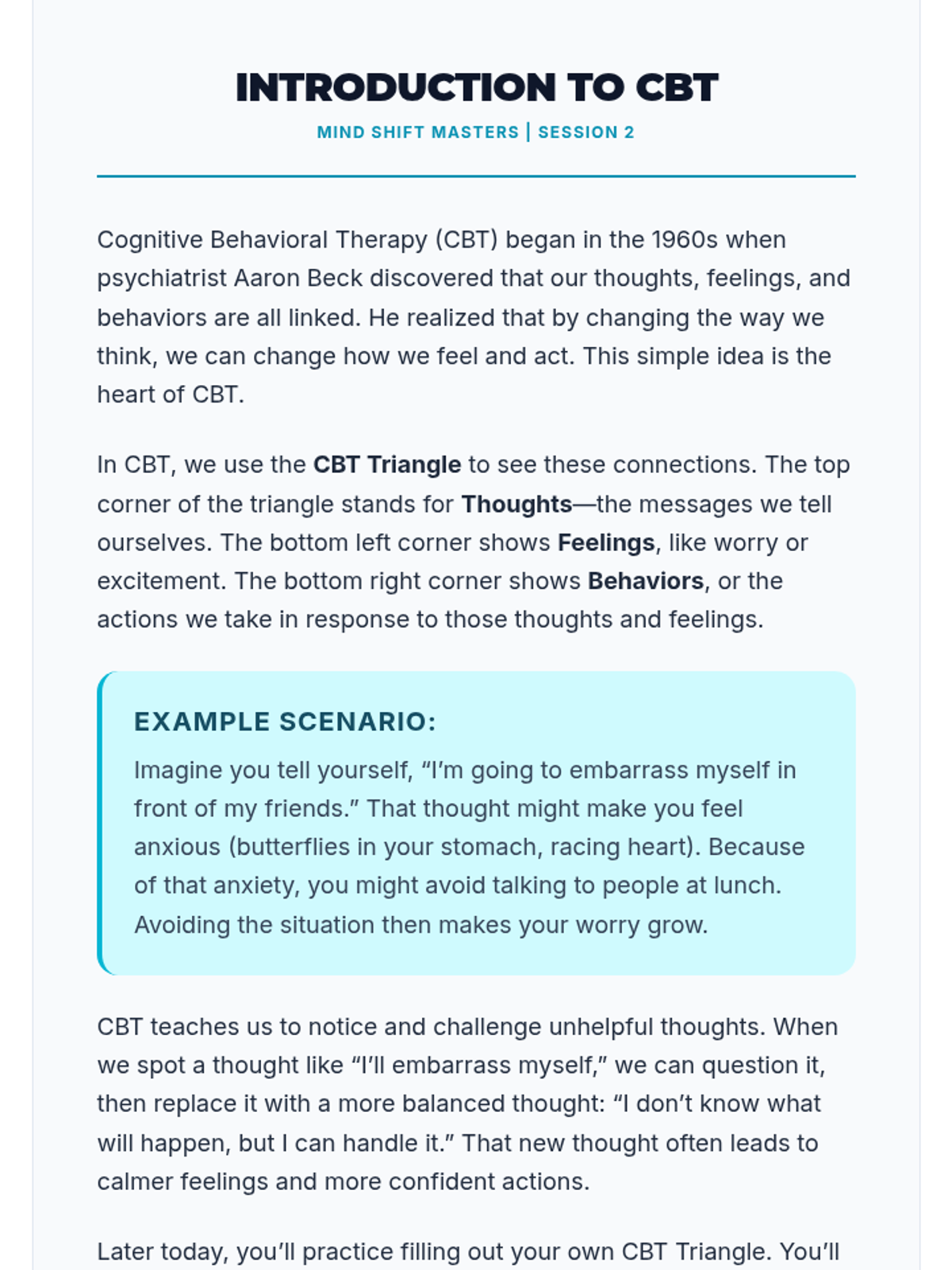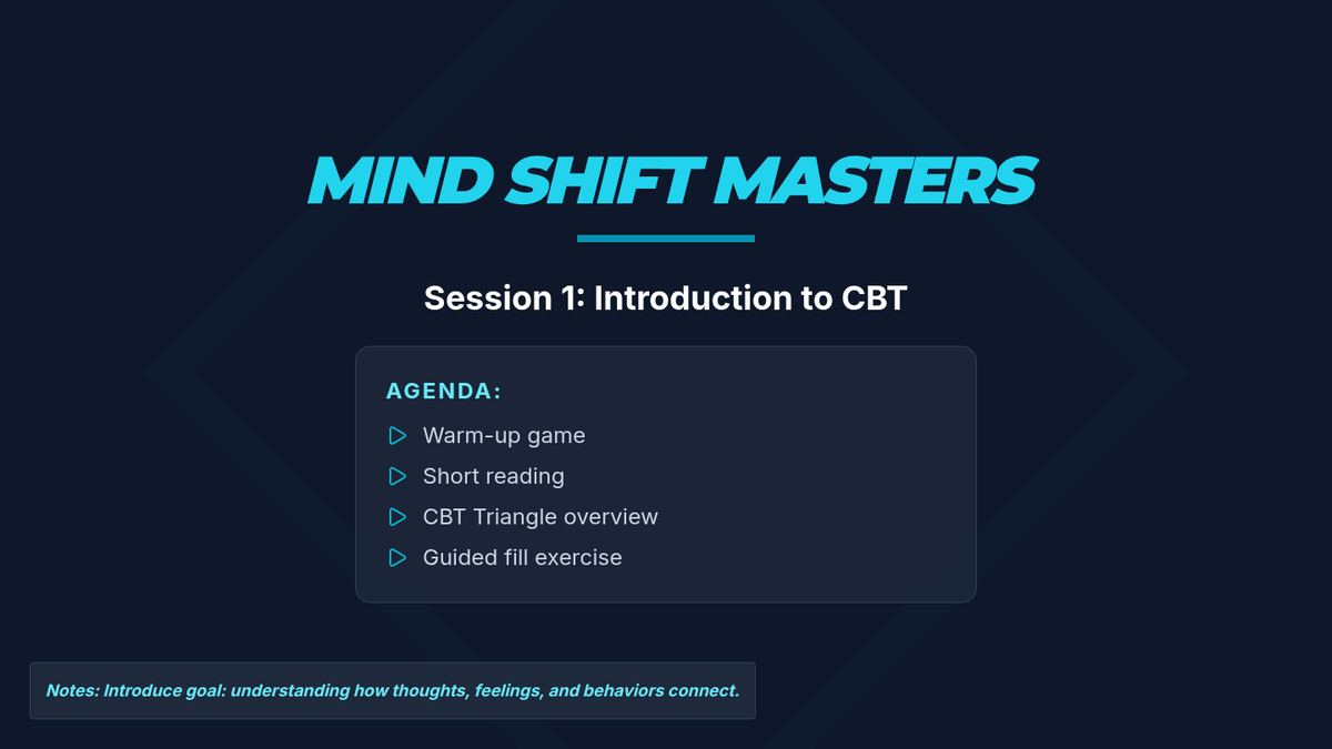 A 4-session CBT skills group for 10th graders designed to help them identify cognitive distortions, understand the CBT triangle, and practice thought reframing to manage anxiety.