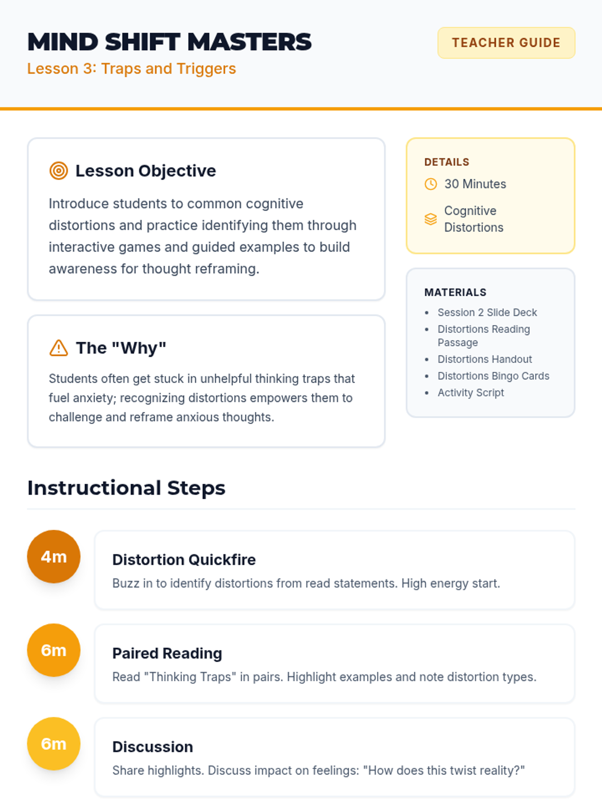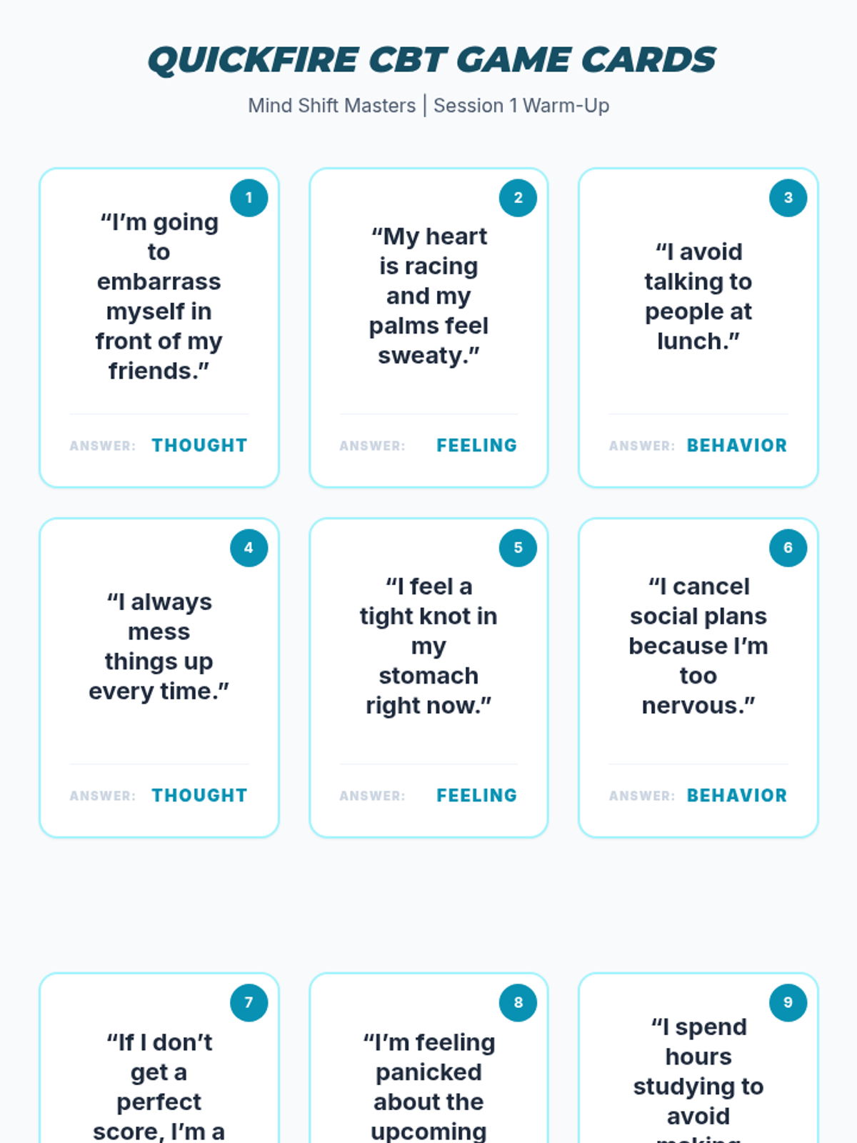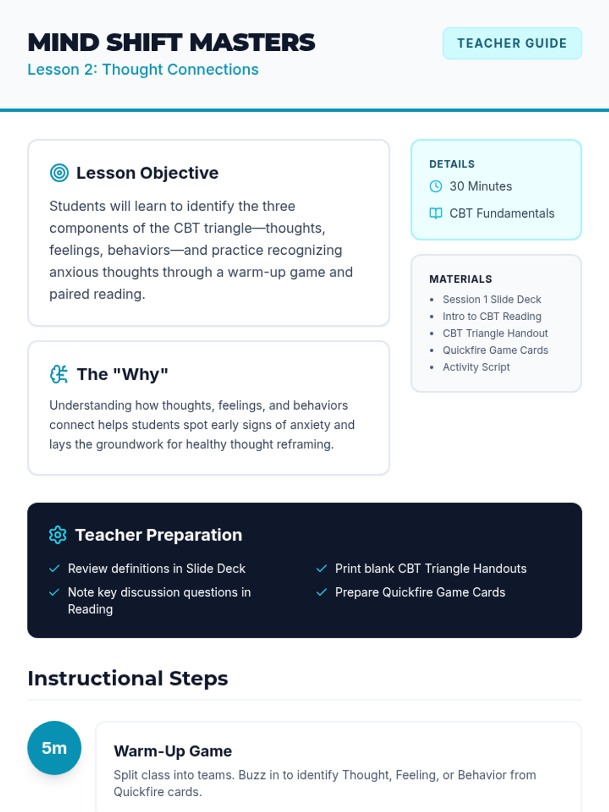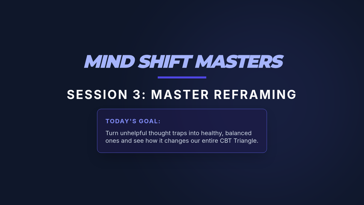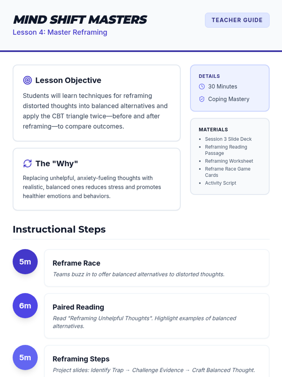 A 4-session CBT skills group for 10th graders designed to help them identify cognitive distortions, understand the CBT triangle, and practice thought reframing to manage anxiety.