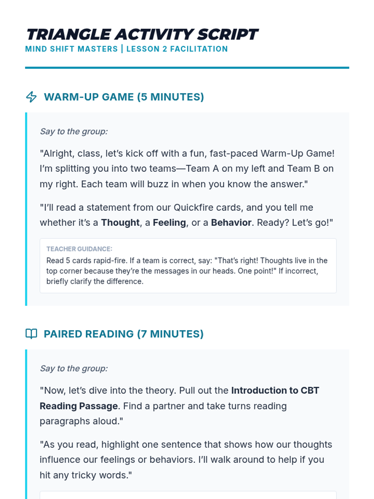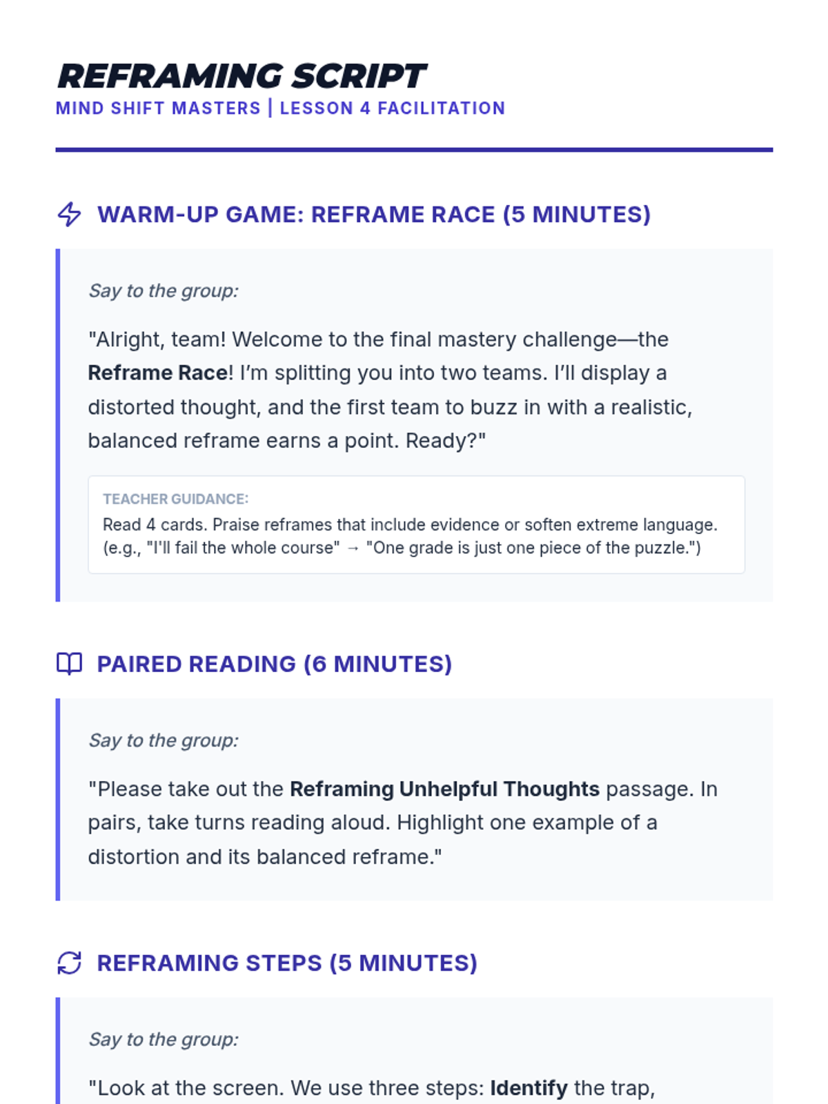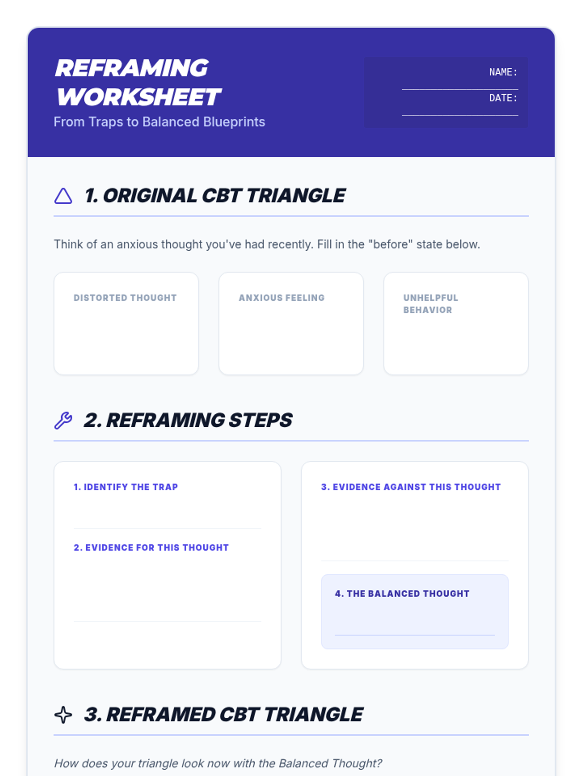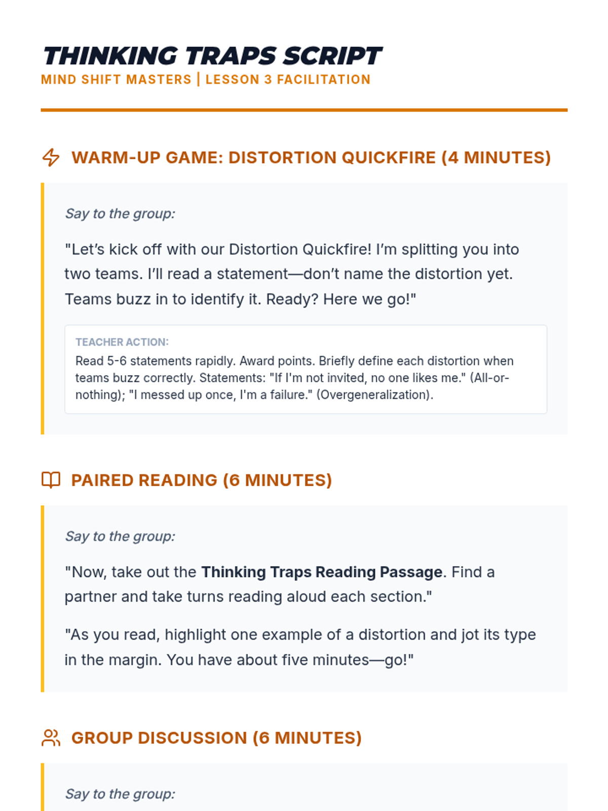 A 4-session CBT skills group for 10th graders designed to help them identify cognitive distortions, understand the CBT triangle, and practice thought reframing to manage anxiety.