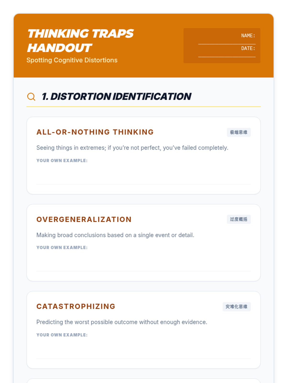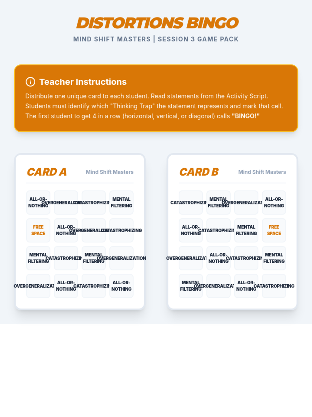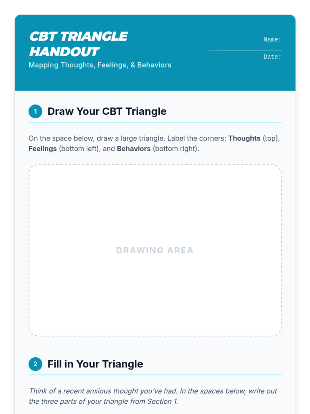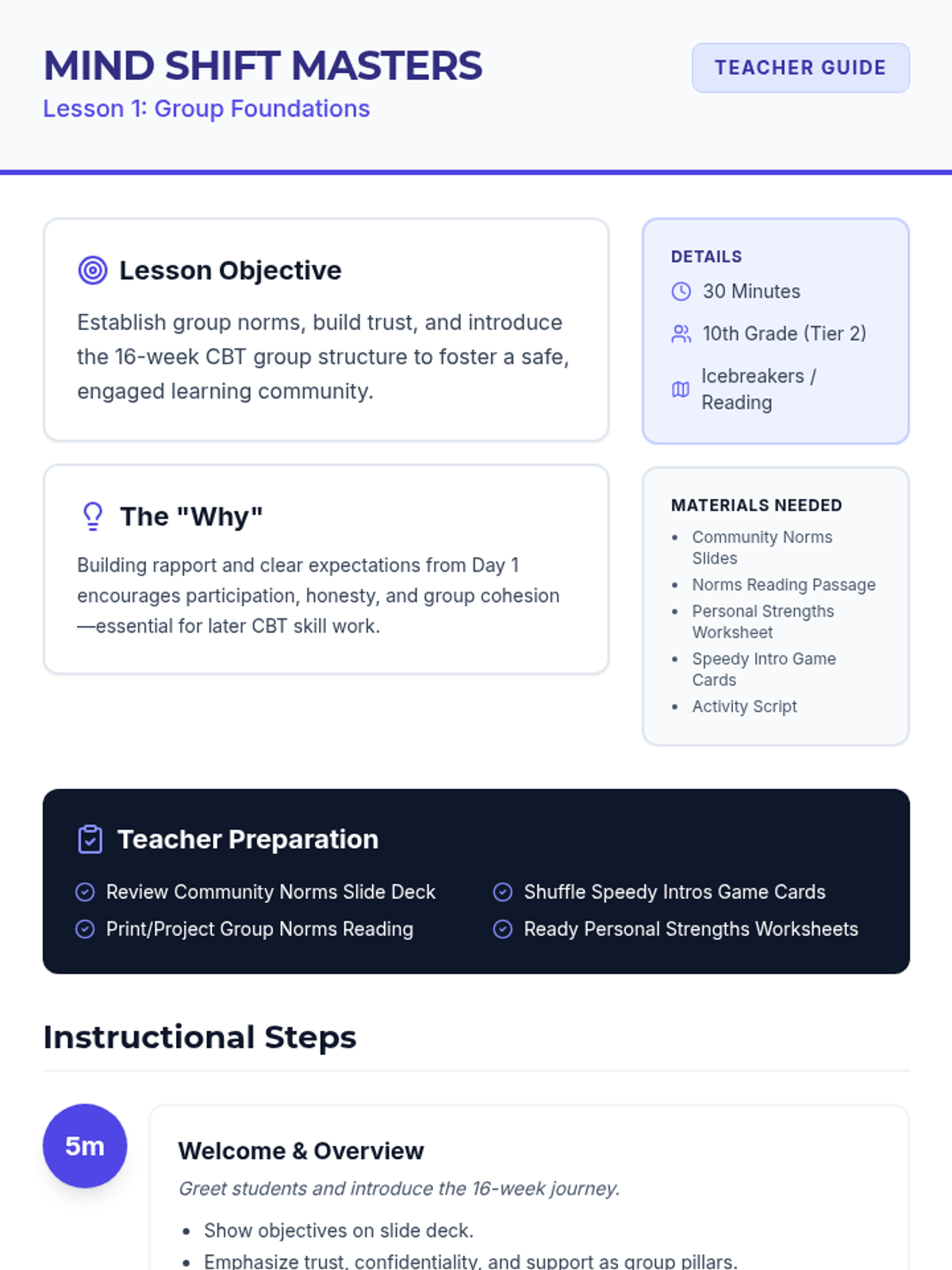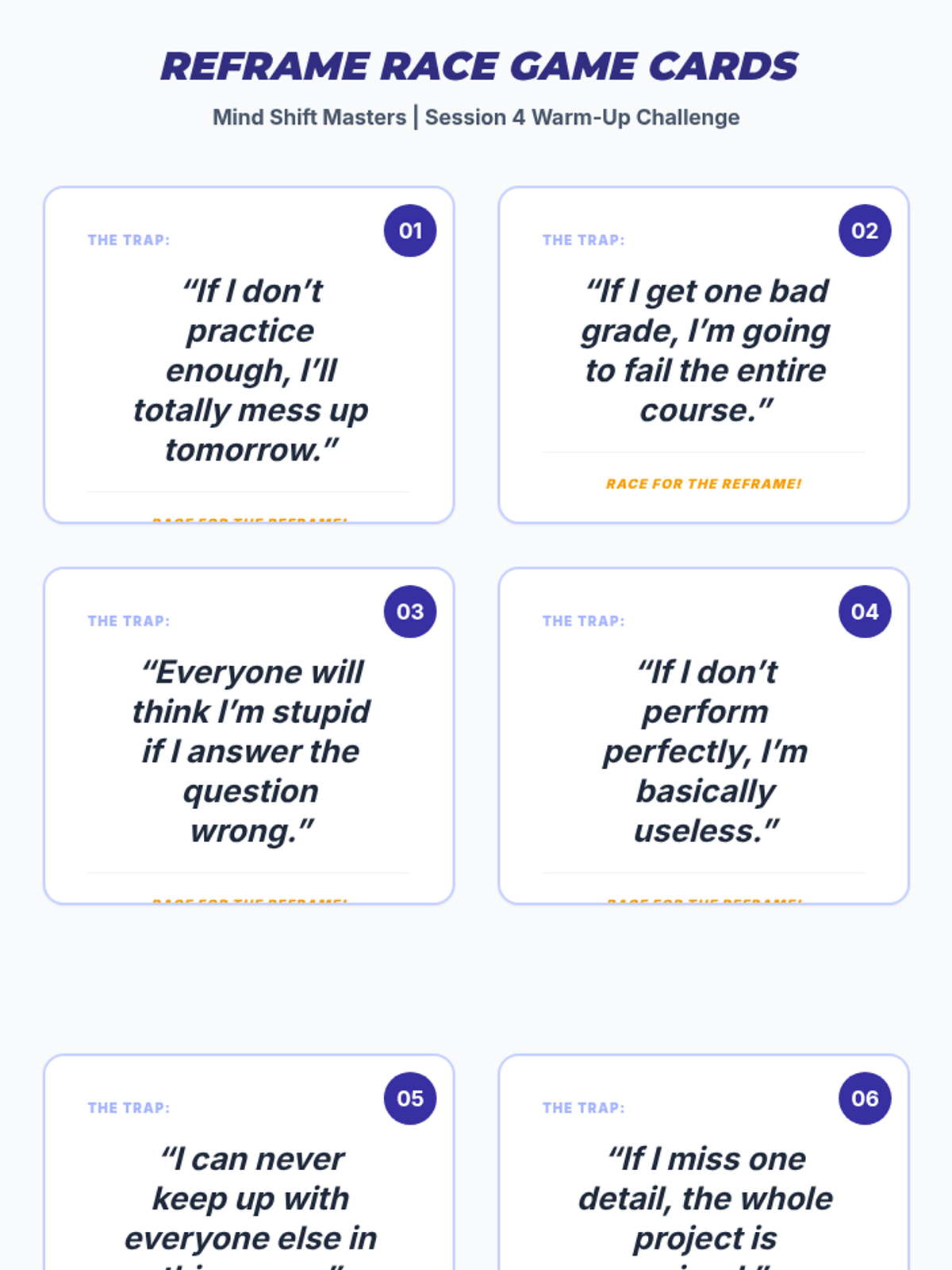 A 4-session CBT skills group for 10th graders designed to help them identify cognitive distortions, understand the CBT triangle, and practice thought reframing to manage anxiety.