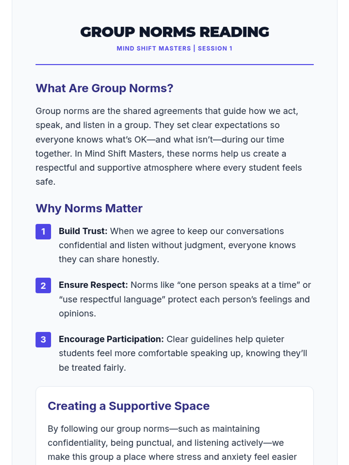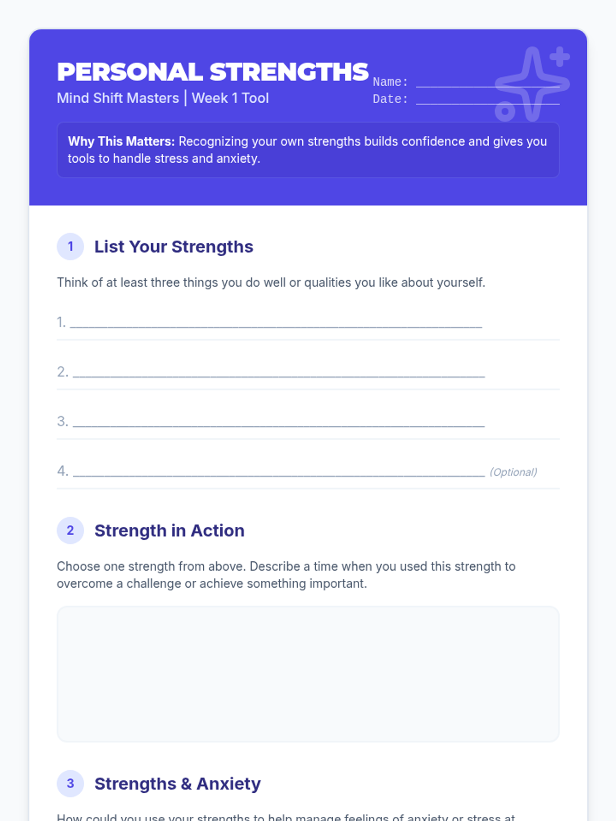 A 4-session small group counseling program for high school girls focused on identifying anxiety triggers, practicing mindfulness, and developing a personalized toolkit of coping strategies. The sequence emphasizes peer support, empowerment, and practical application within the school environment.