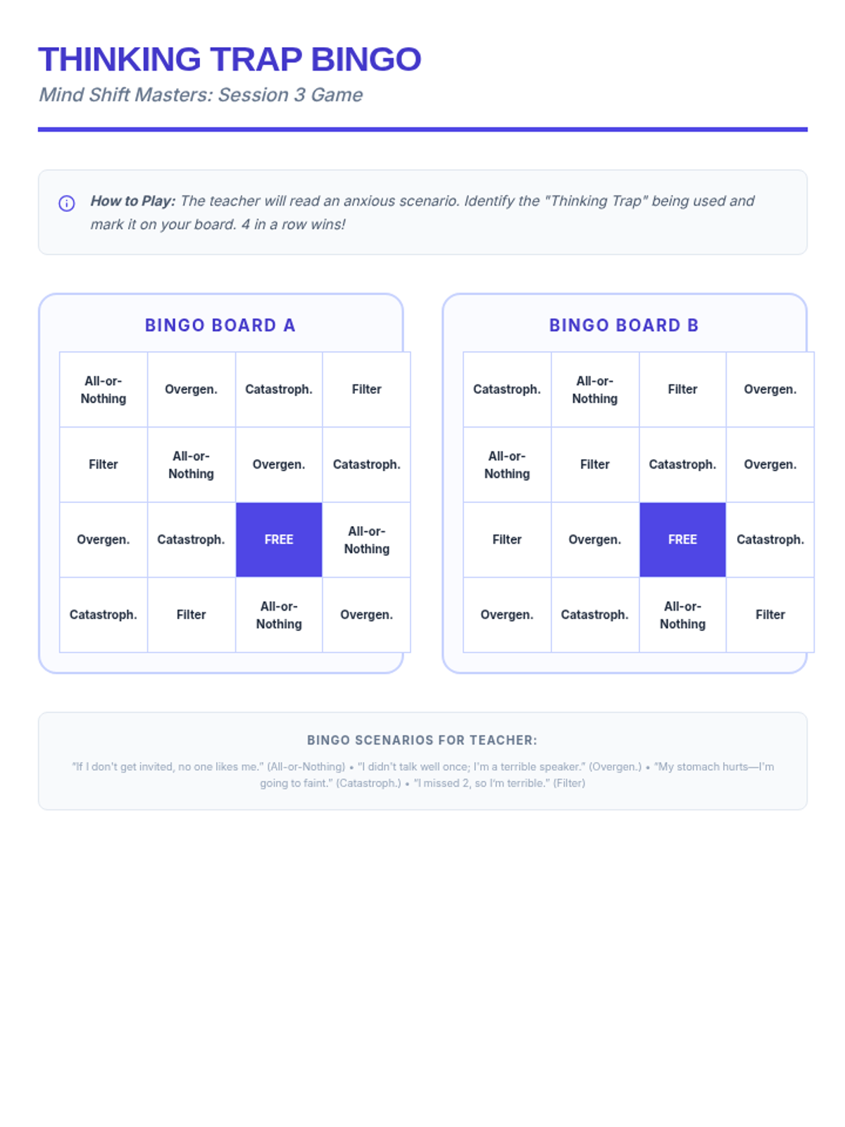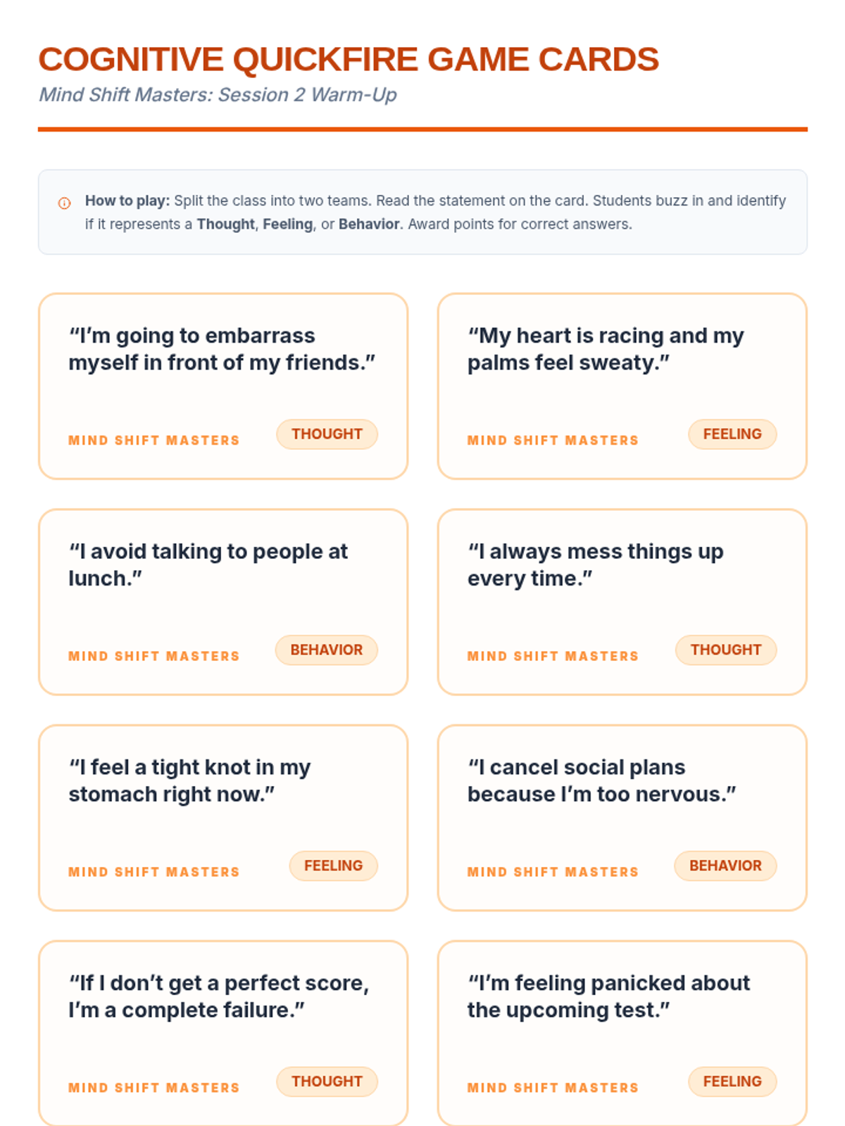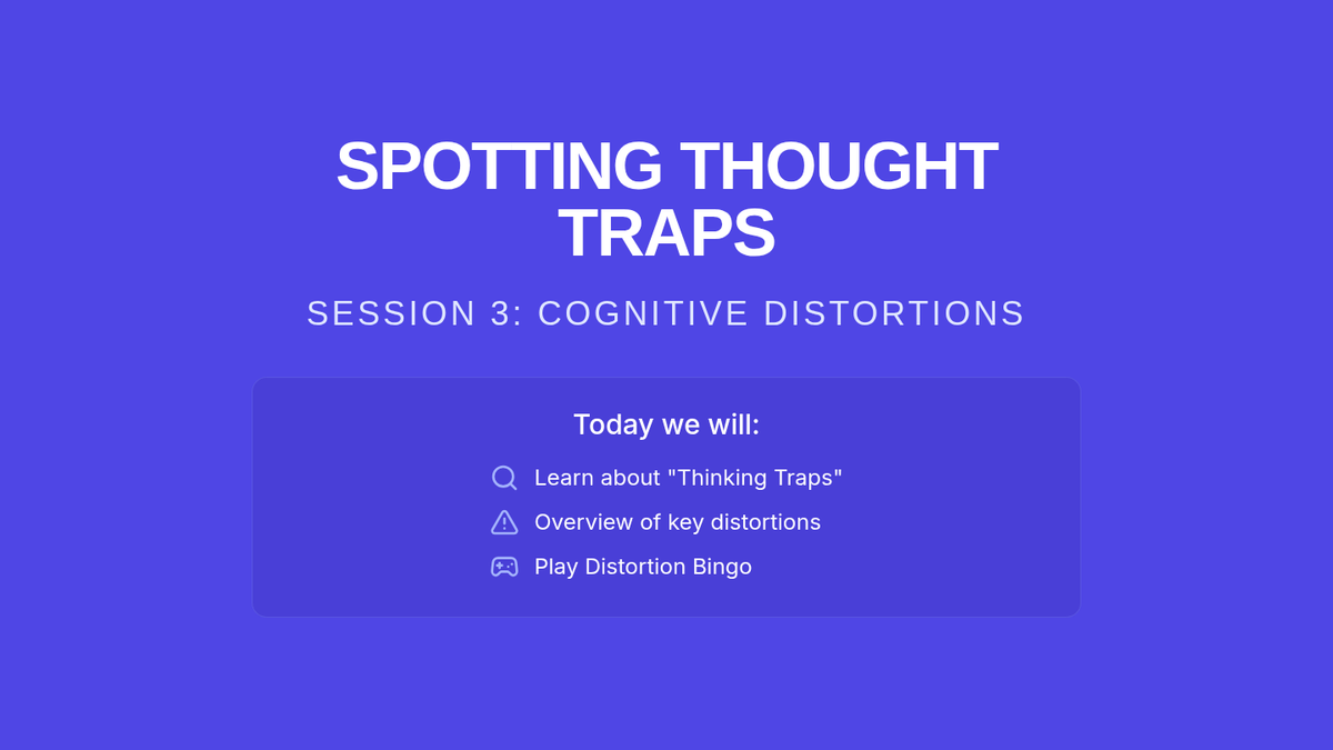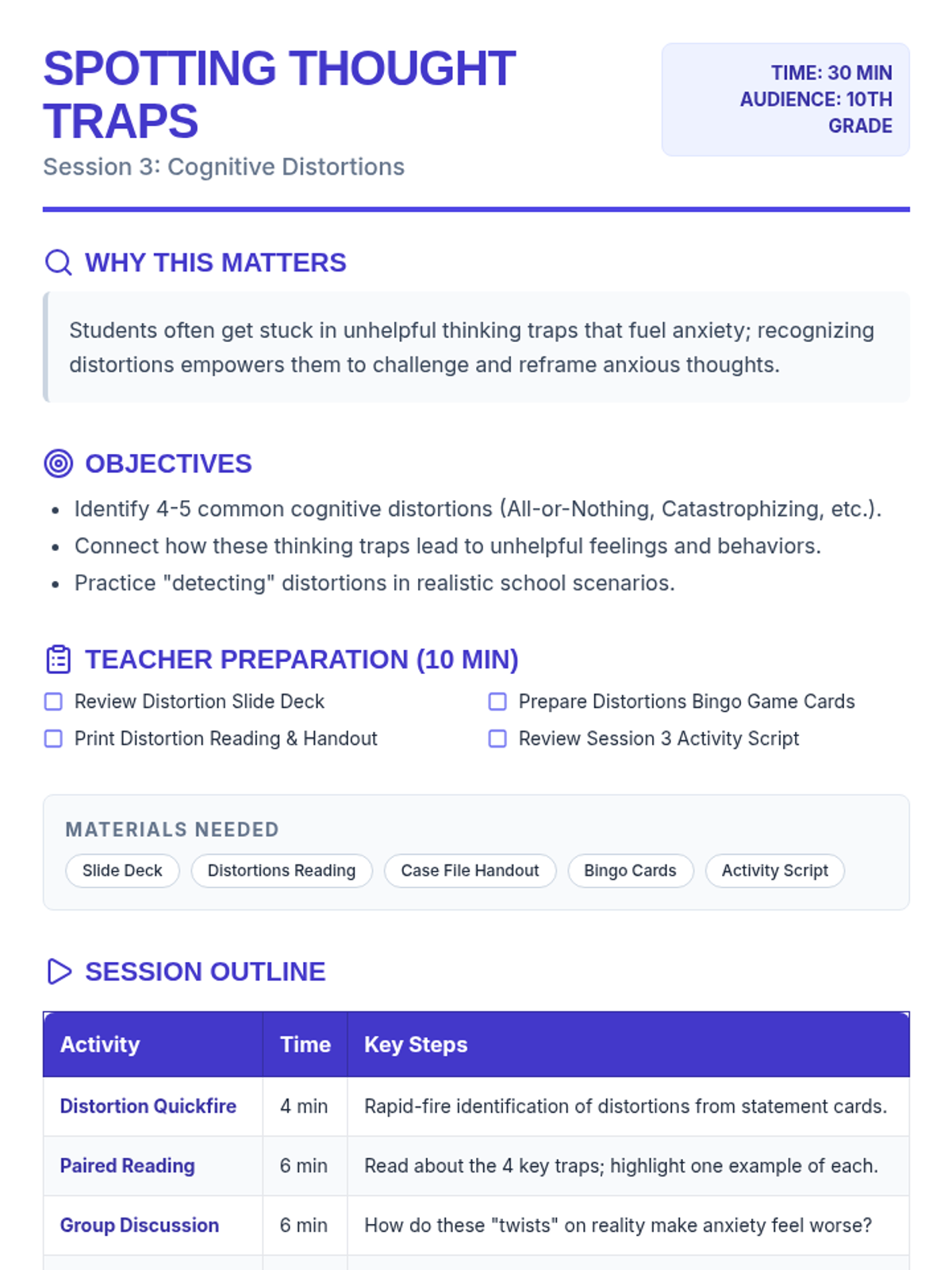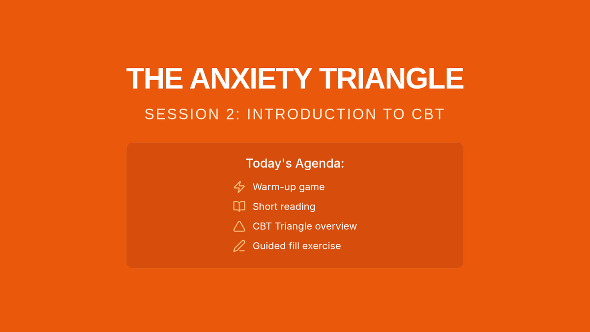 A comprehensive 4-session CBT skills group for 10th-grade students dealing with anxiety. This Tier 2 intervention covers community building, the CBT triangle, identifying cognitive distortions, and cognitive reframing techniques through interactive games and guided practice.