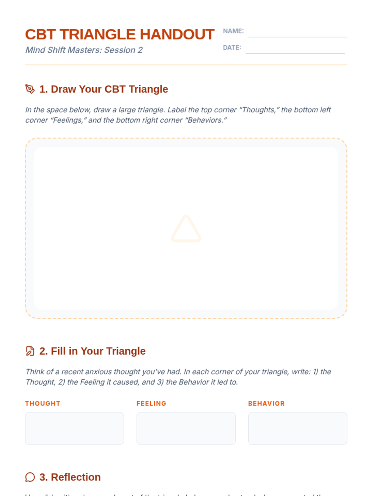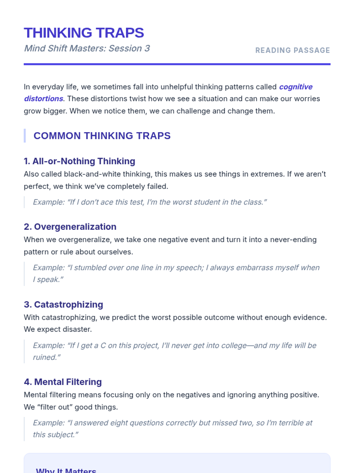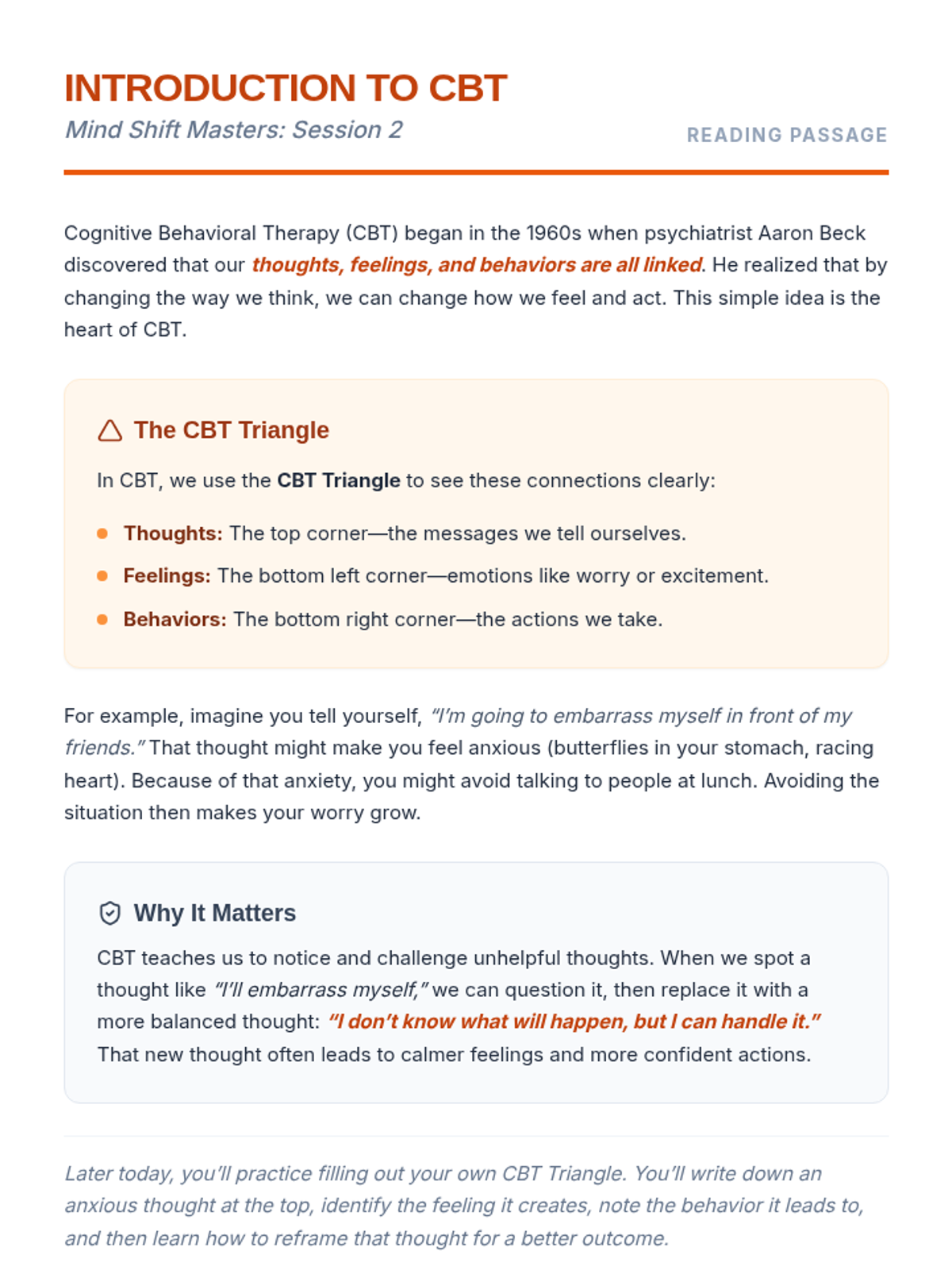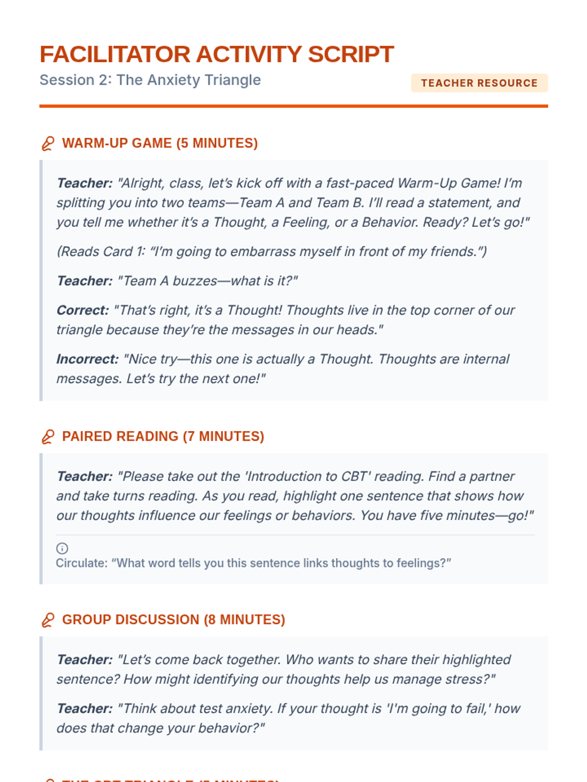 A comprehensive 4-session CBT skills group for 10th-grade students dealing with anxiety. This Tier 2 intervention covers community building, the CBT triangle, identifying cognitive distortions, and cognitive reframing techniques through interactive games and guided practice.
