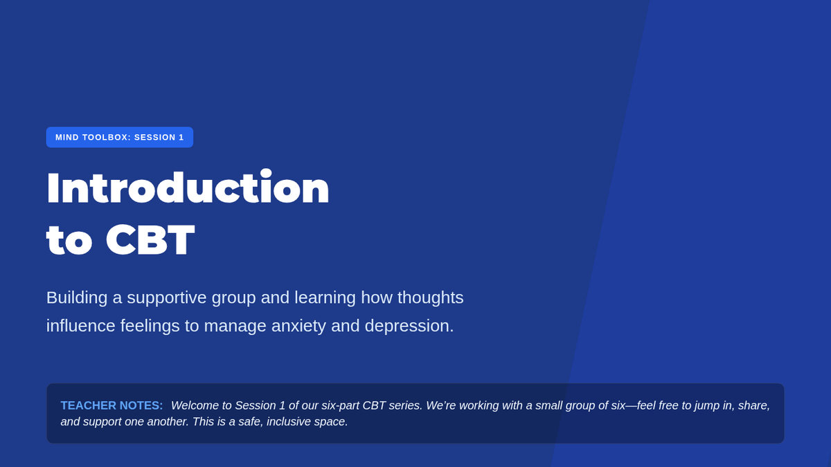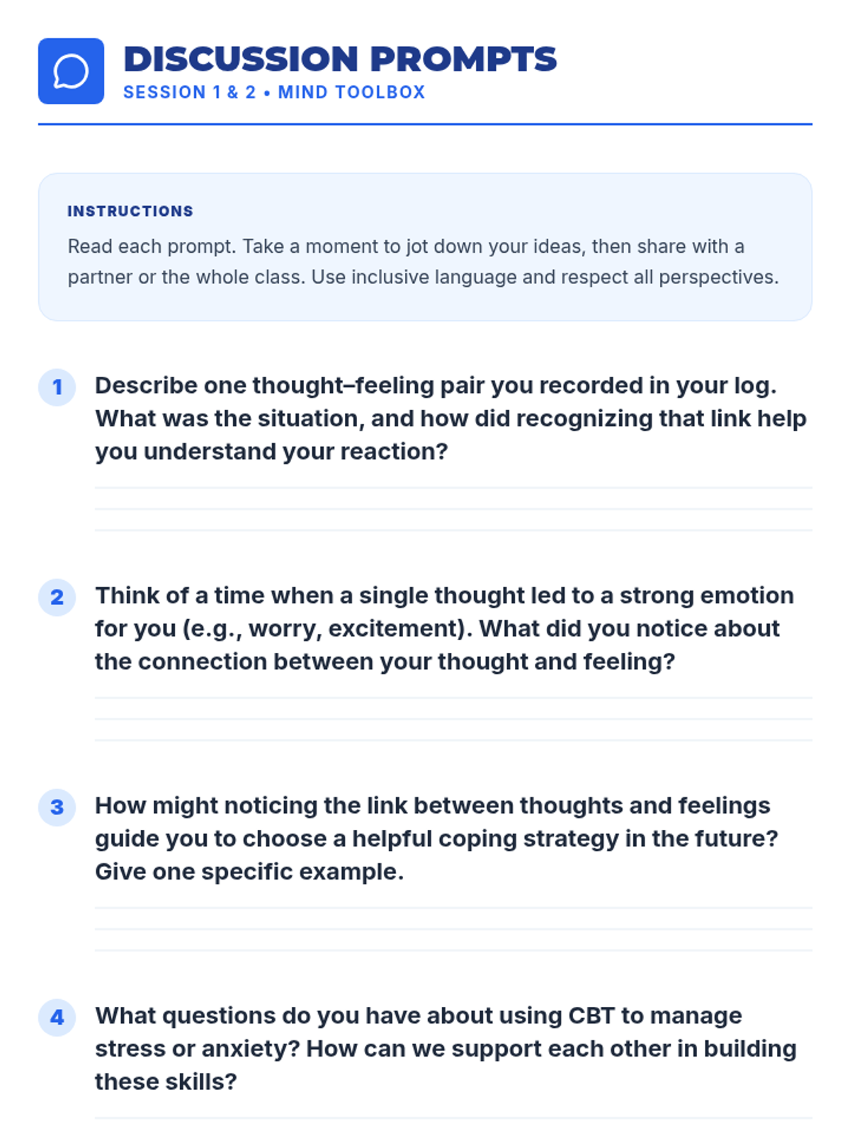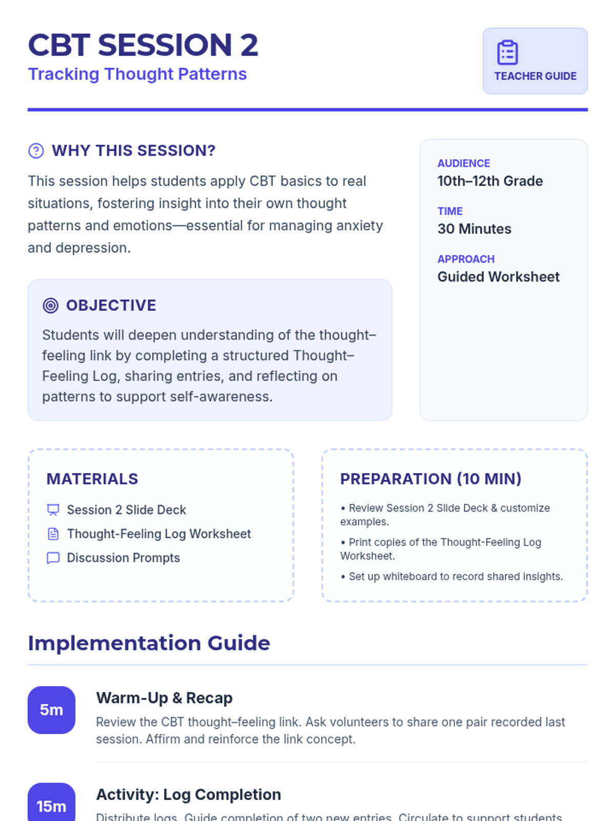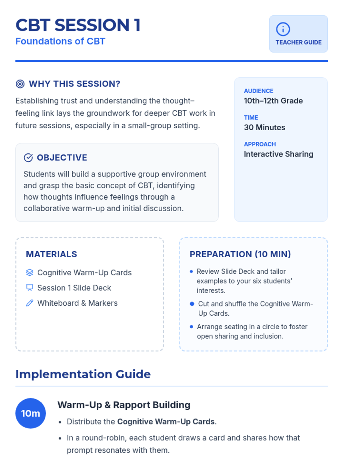 A 6-session cognitive behavioral therapy series designed for 10th–12th graders to manage anxiety and depression through evidence-based strategies, interactive activities, and hands-on toolkits.