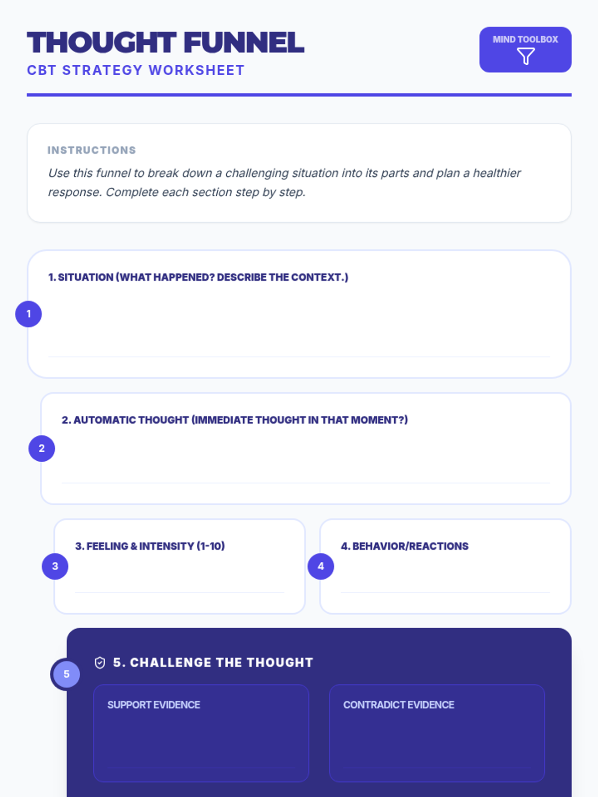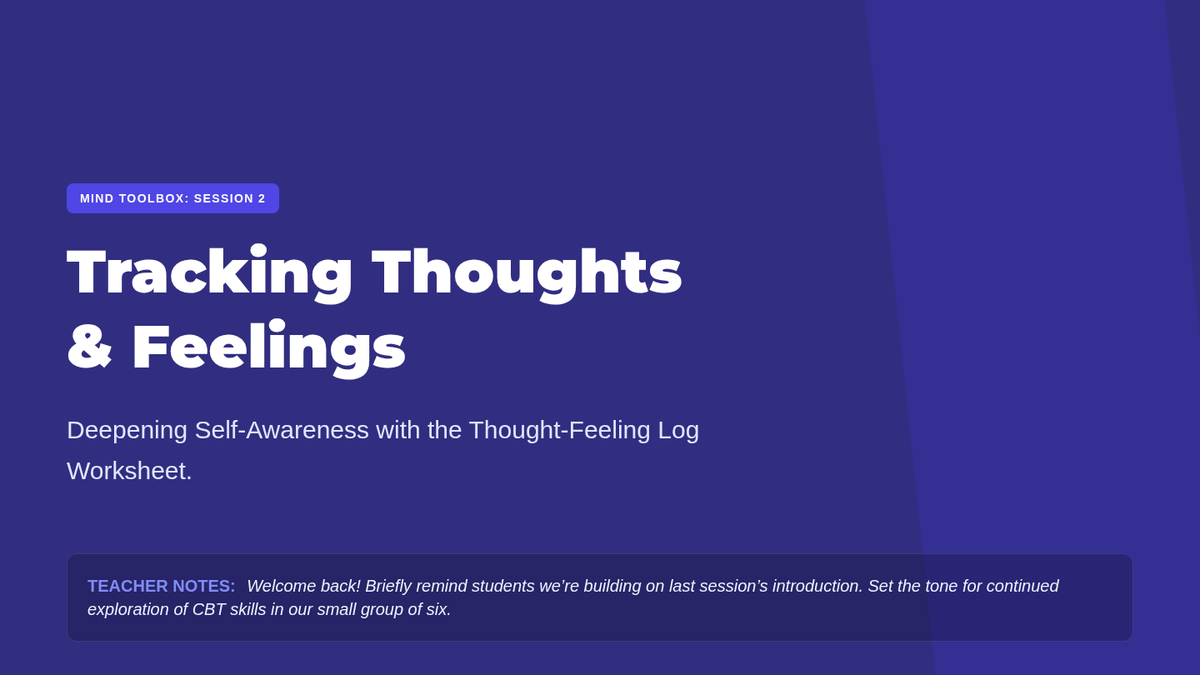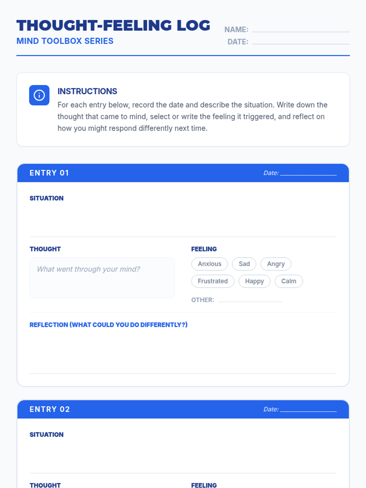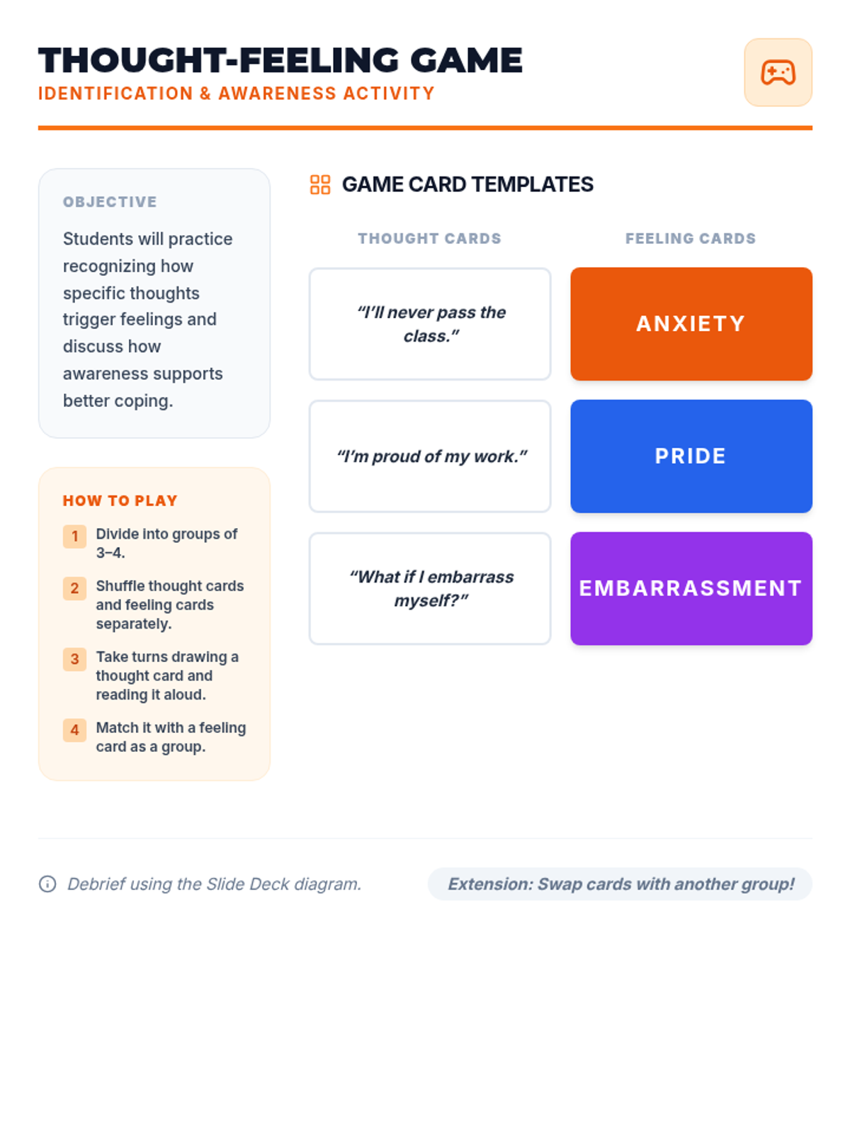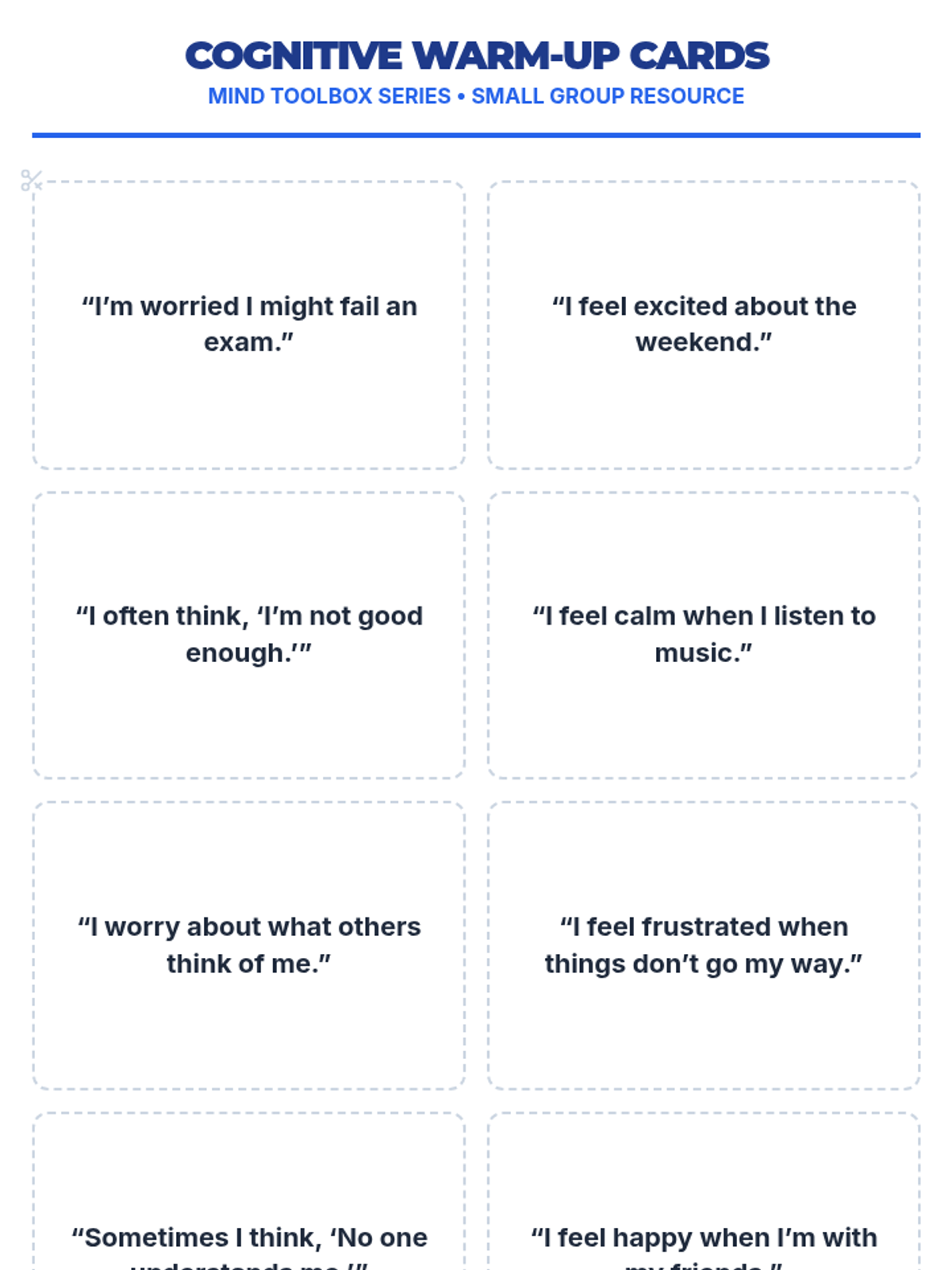 A 6-session cognitive behavioral therapy series designed for 10th–12th graders to manage anxiety and depression through evidence-based strategies, interactive activities, and hands-on toolkits.