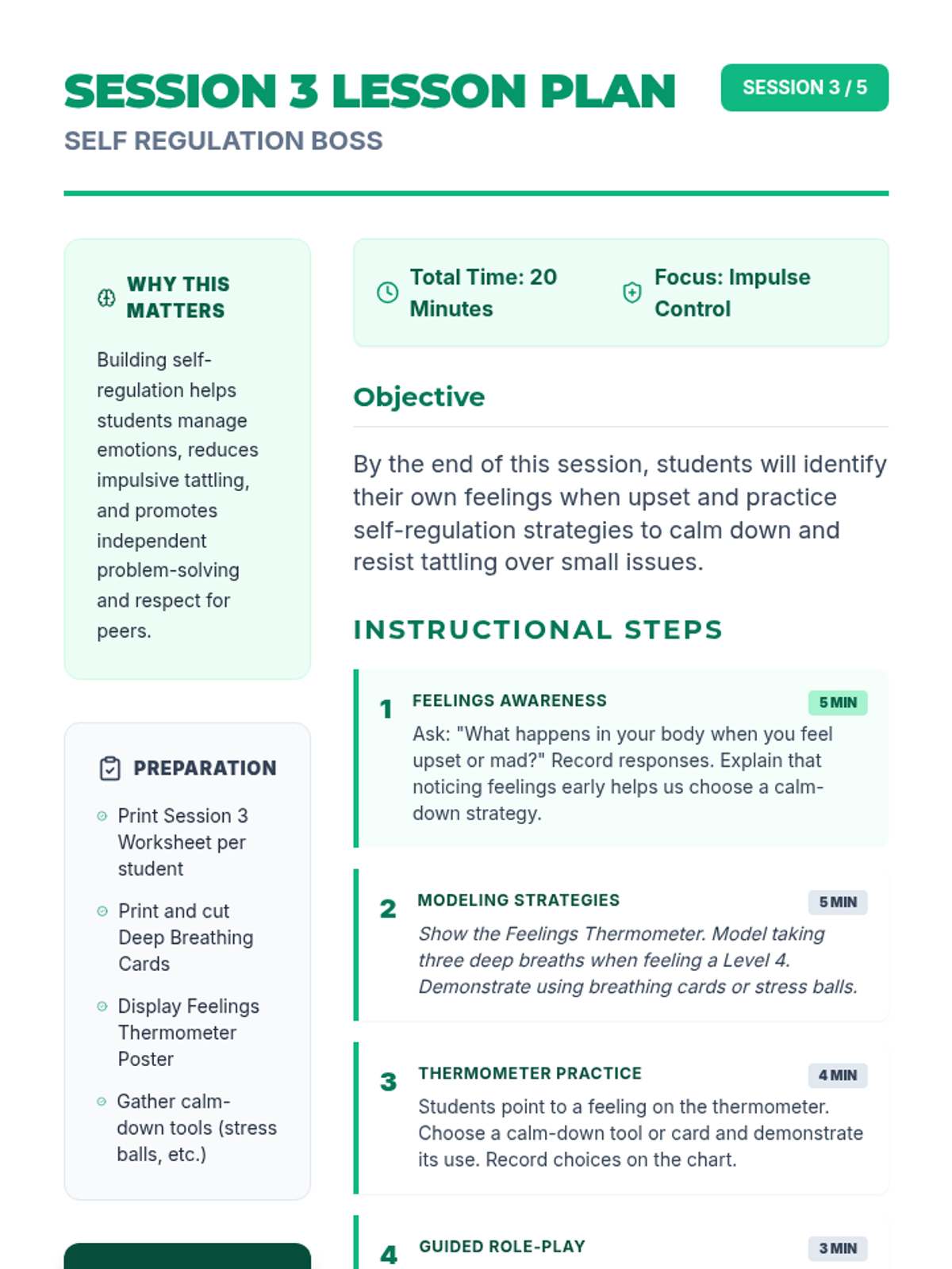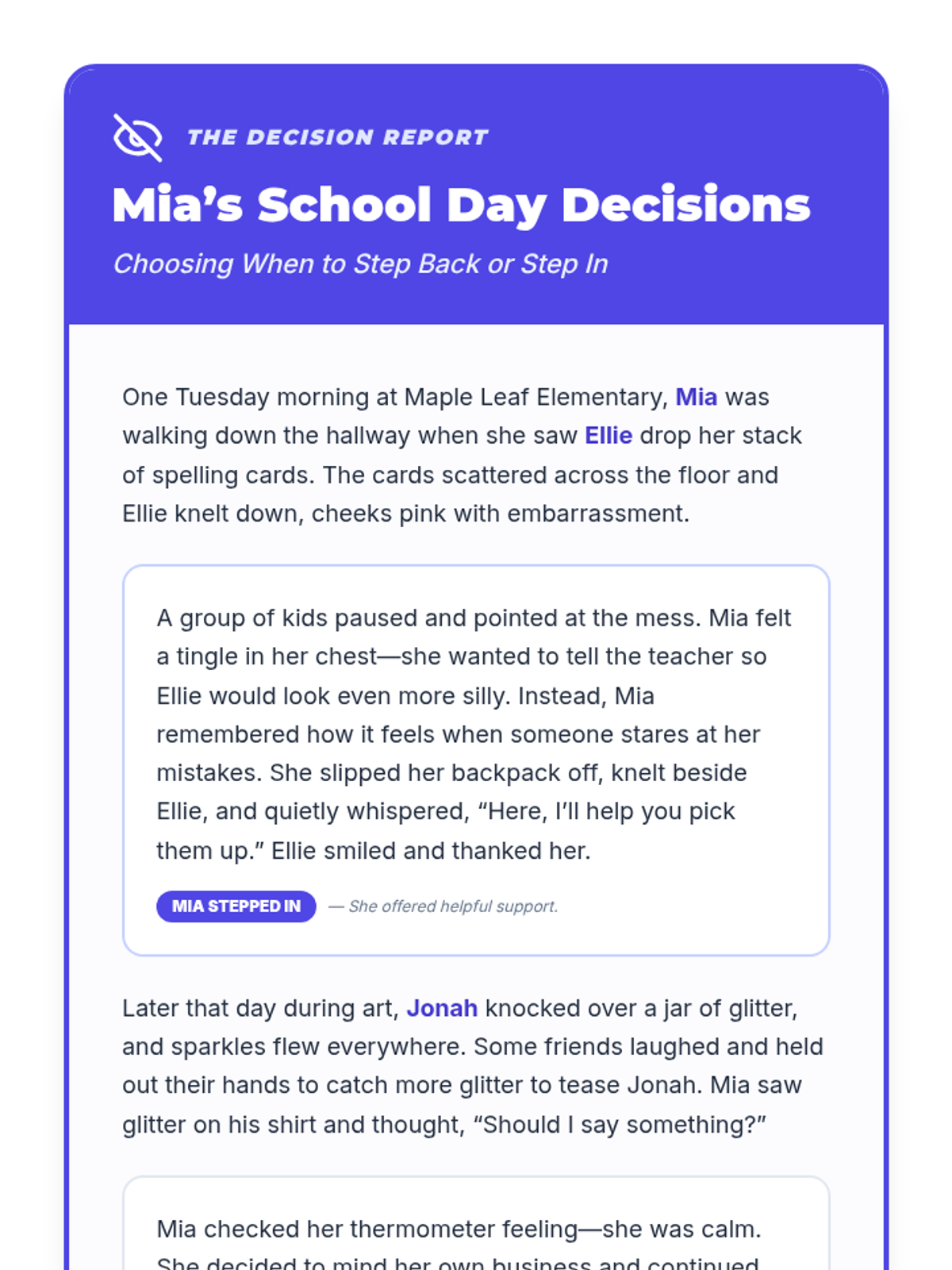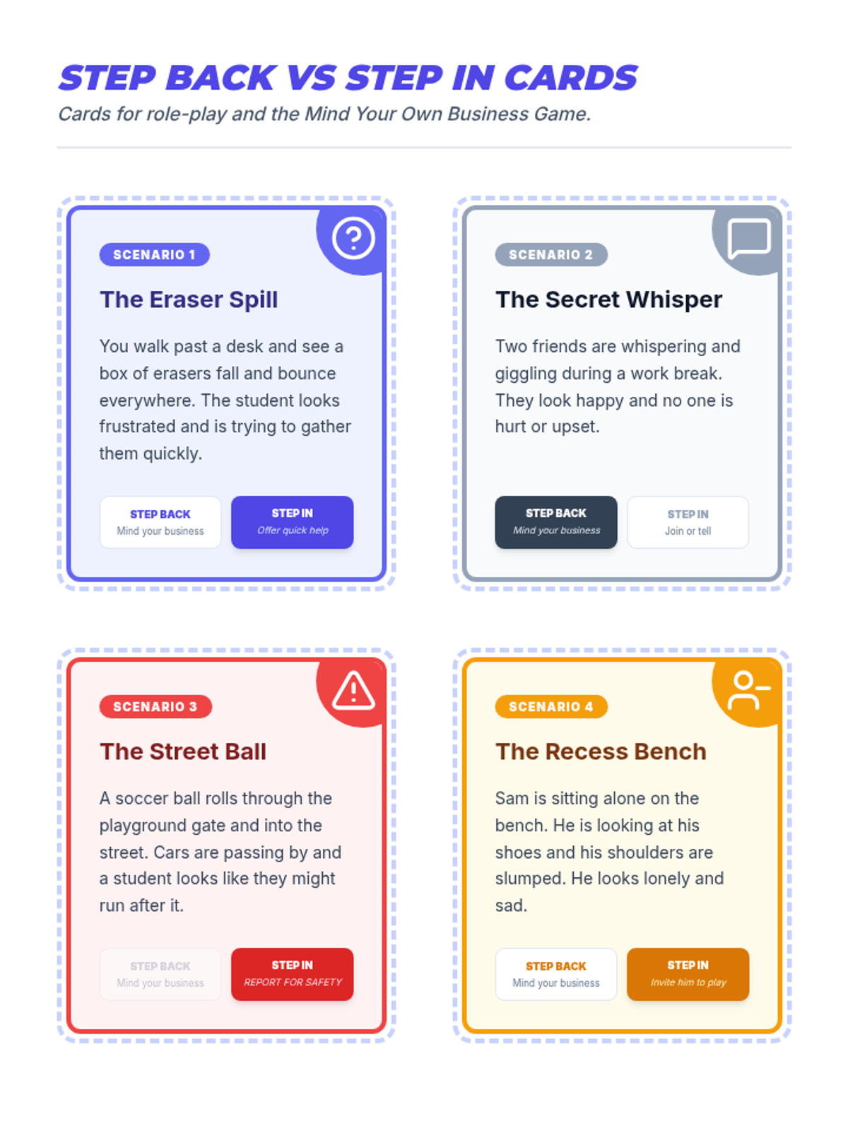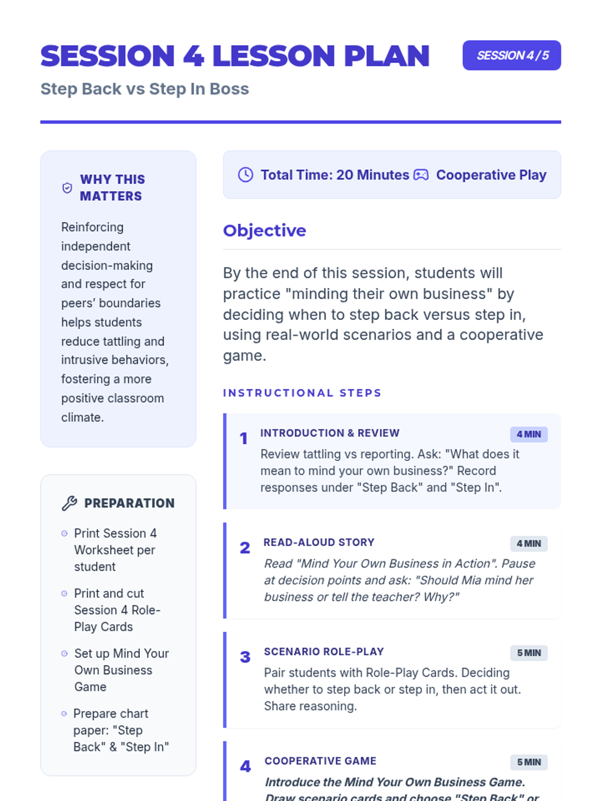 A 5-session individual intervention designed for students to develop self-regulation, distinguish between tattling and reporting, and respect peer boundaries. Students learn to 'mind their own business' through interactive stories, role-plays, and self-regulation tools.
