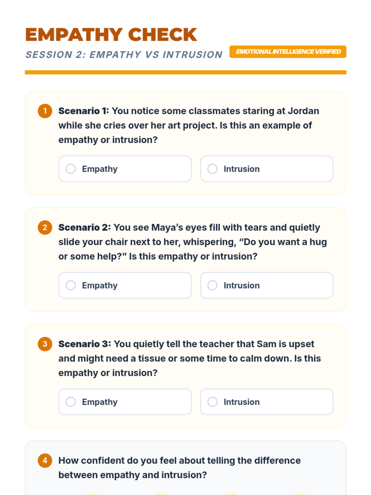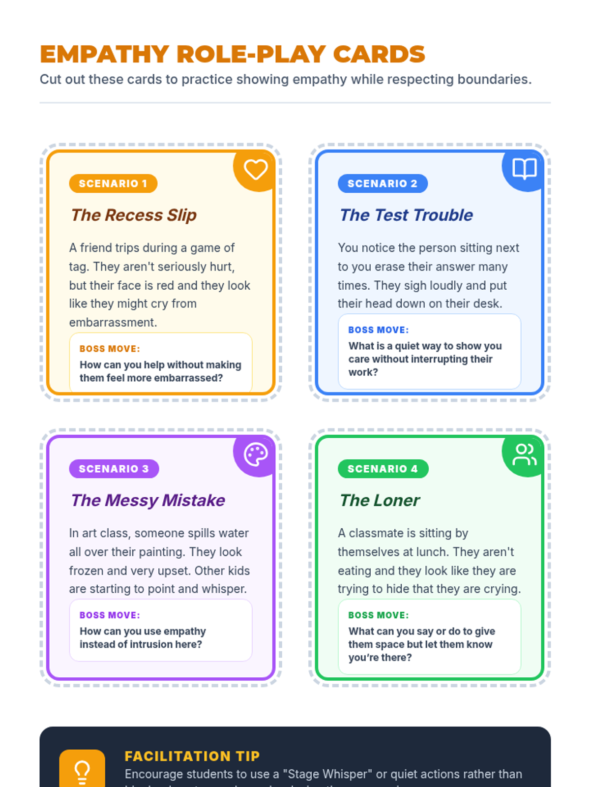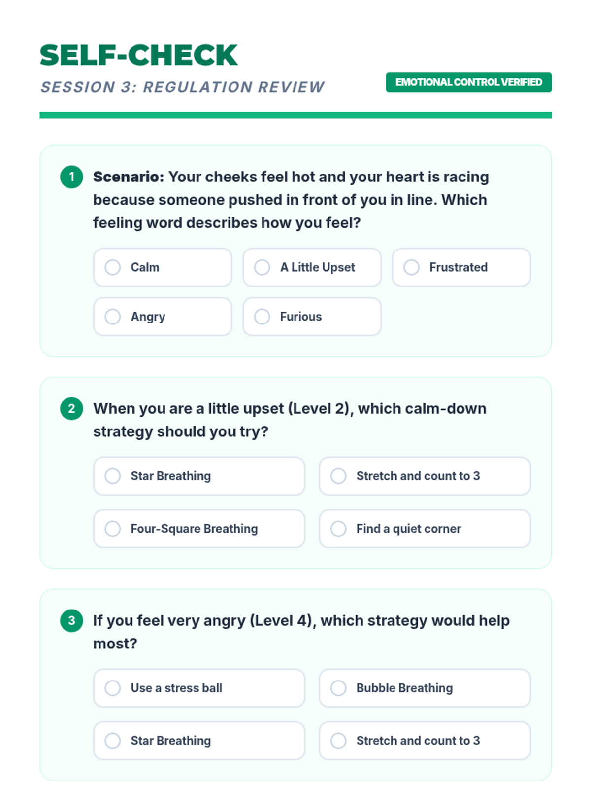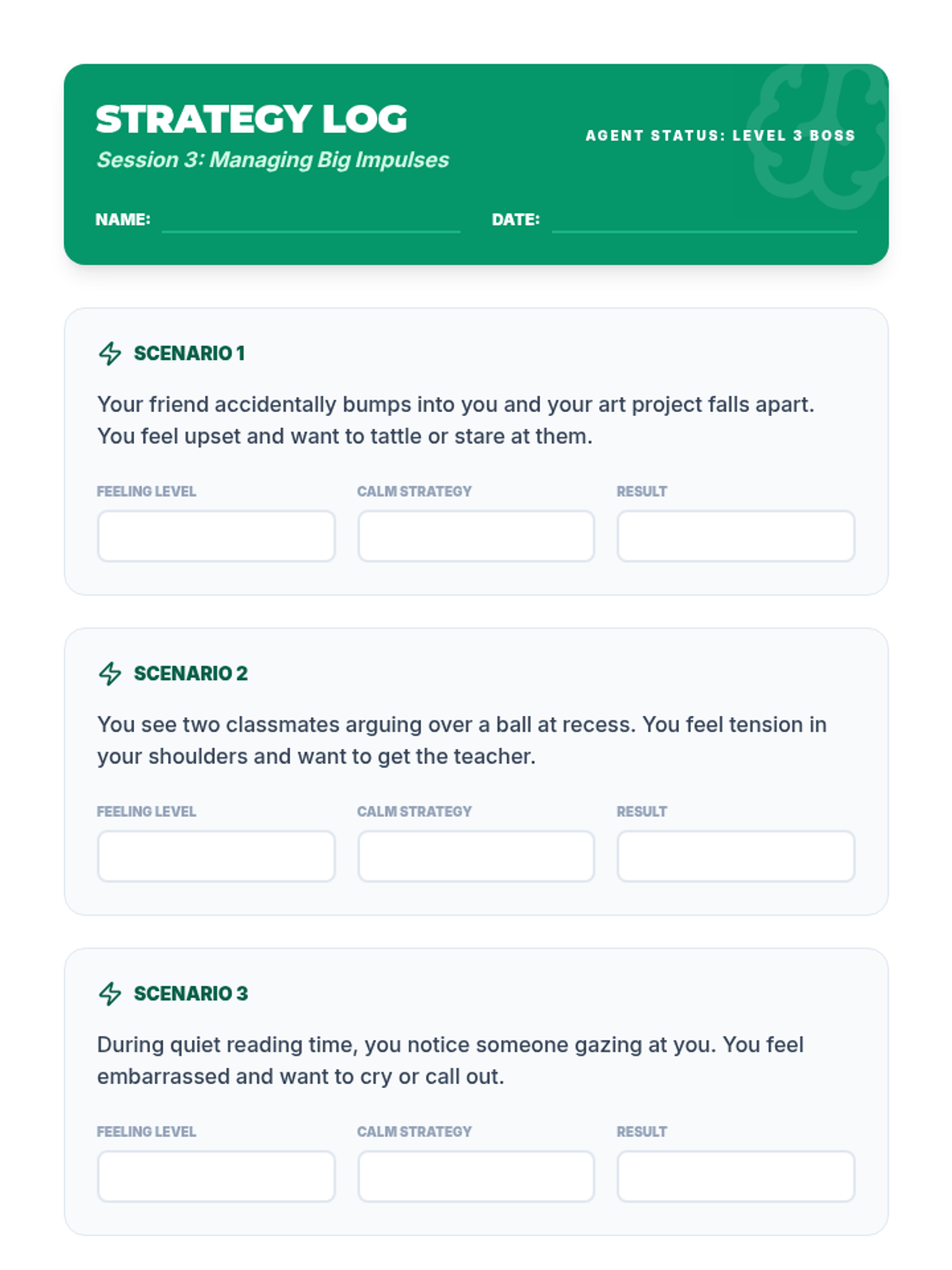 A 5-session individual intervention designed for students to develop self-regulation, distinguish between tattling and reporting, and respect peer boundaries. Students learn to 'mind their own business' through interactive stories, role-plays, and self-regulation tools.