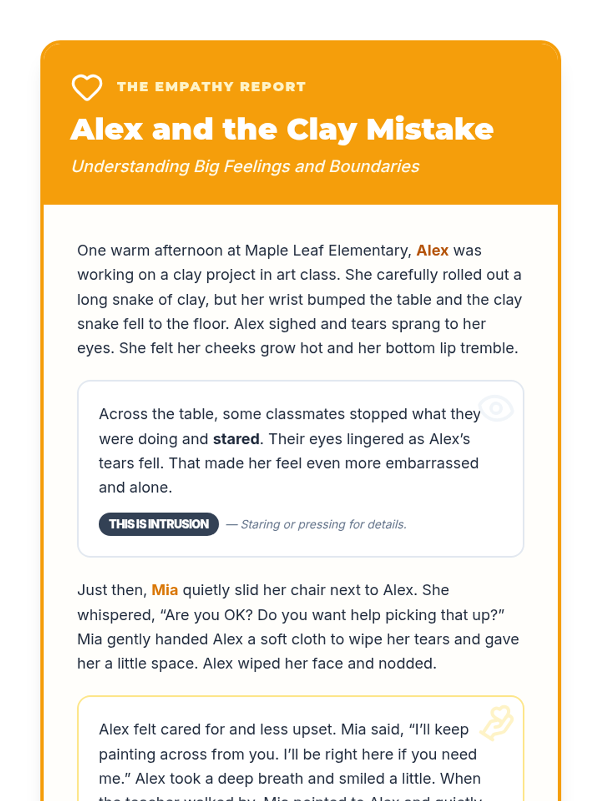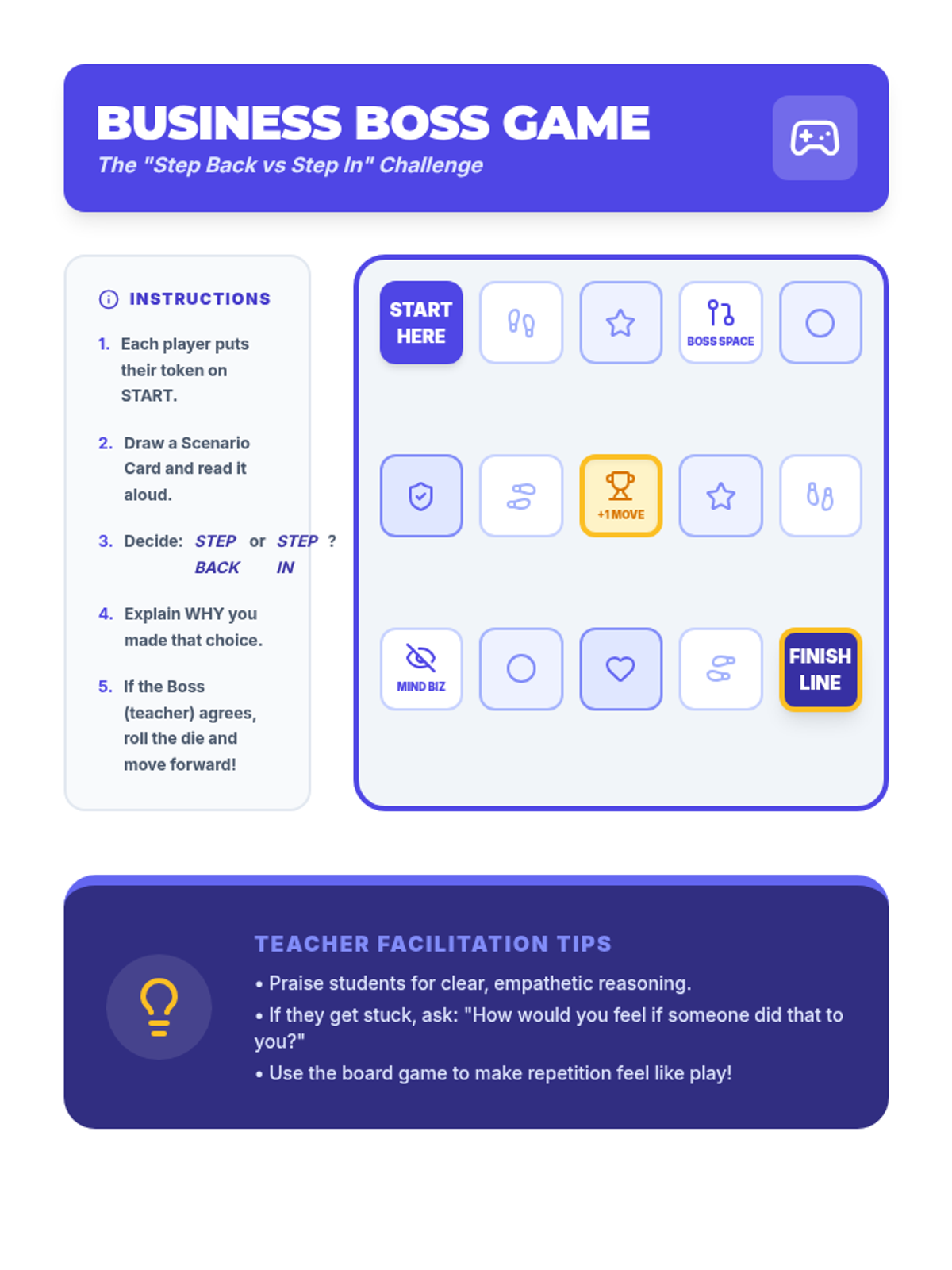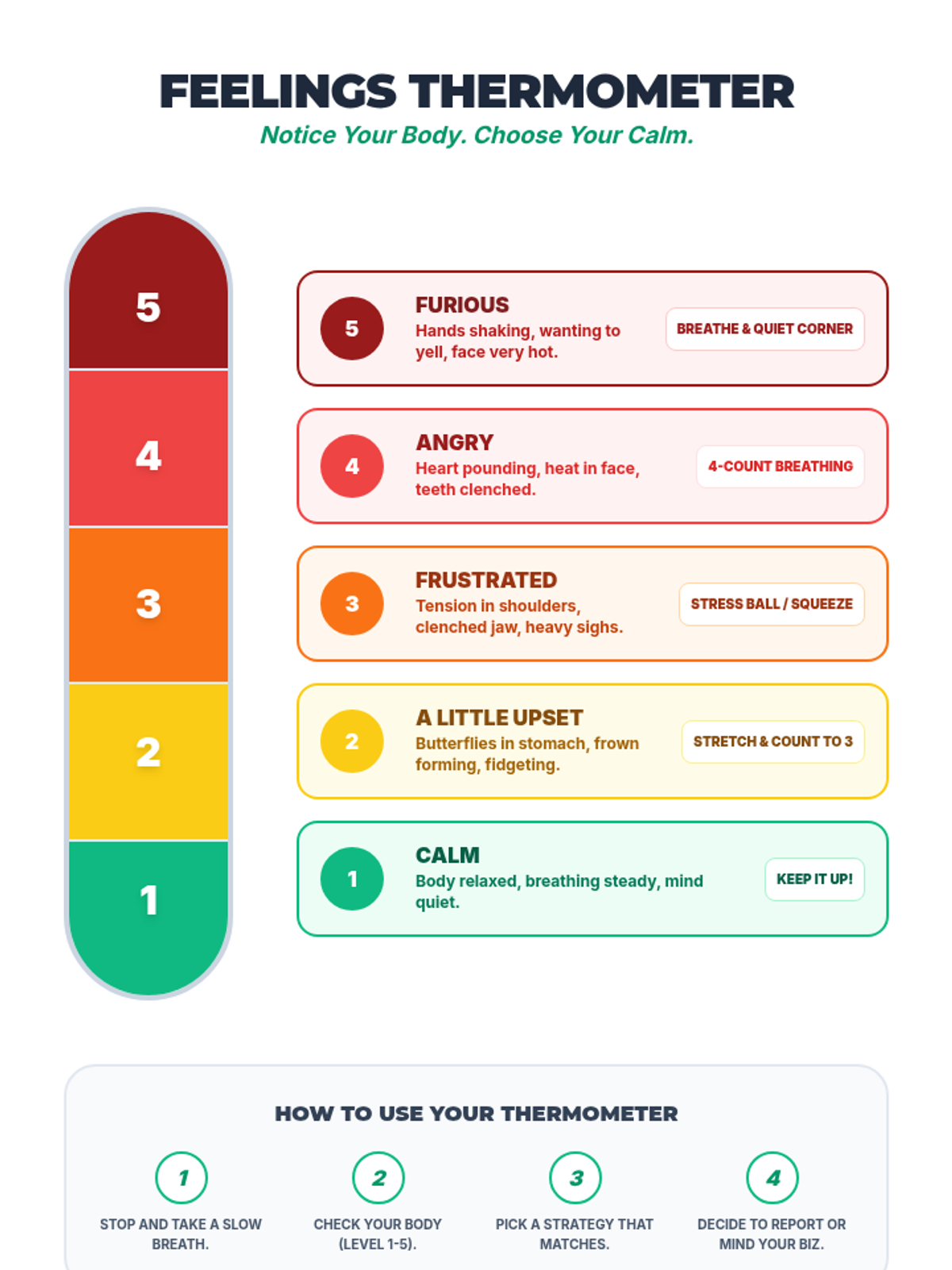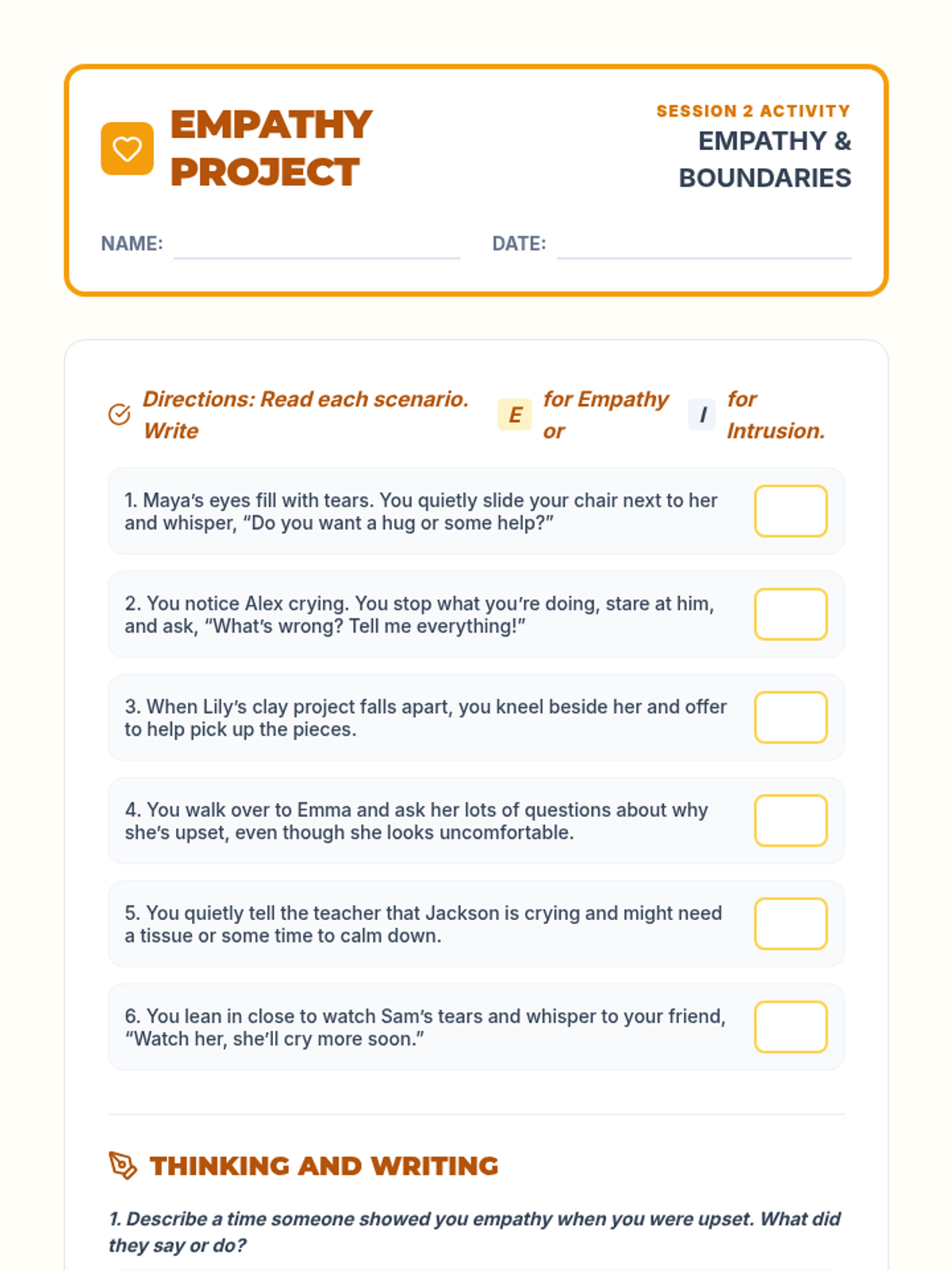 A 5-session individual intervention designed for students to develop self-regulation, distinguish between tattling and reporting, and respect peer boundaries. Students learn to 'mind their own business' through interactive stories, role-plays, and self-regulation tools.