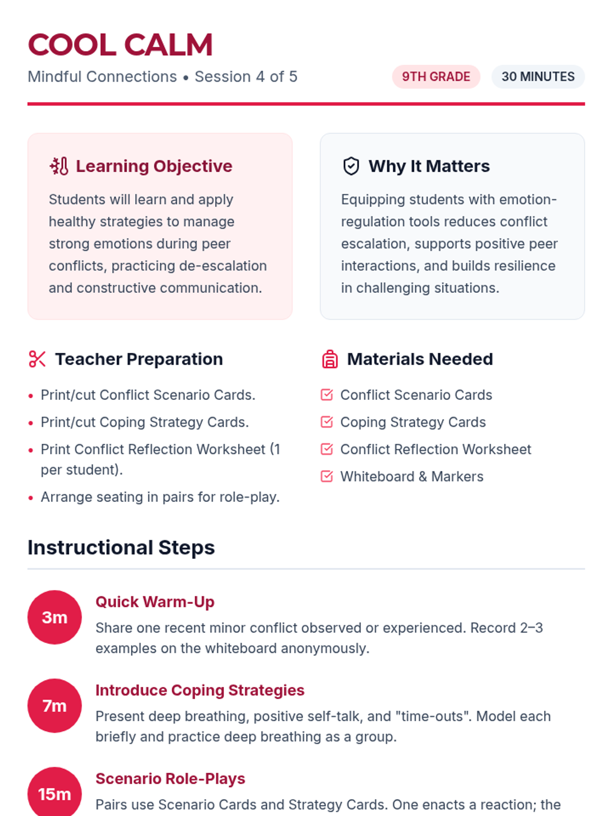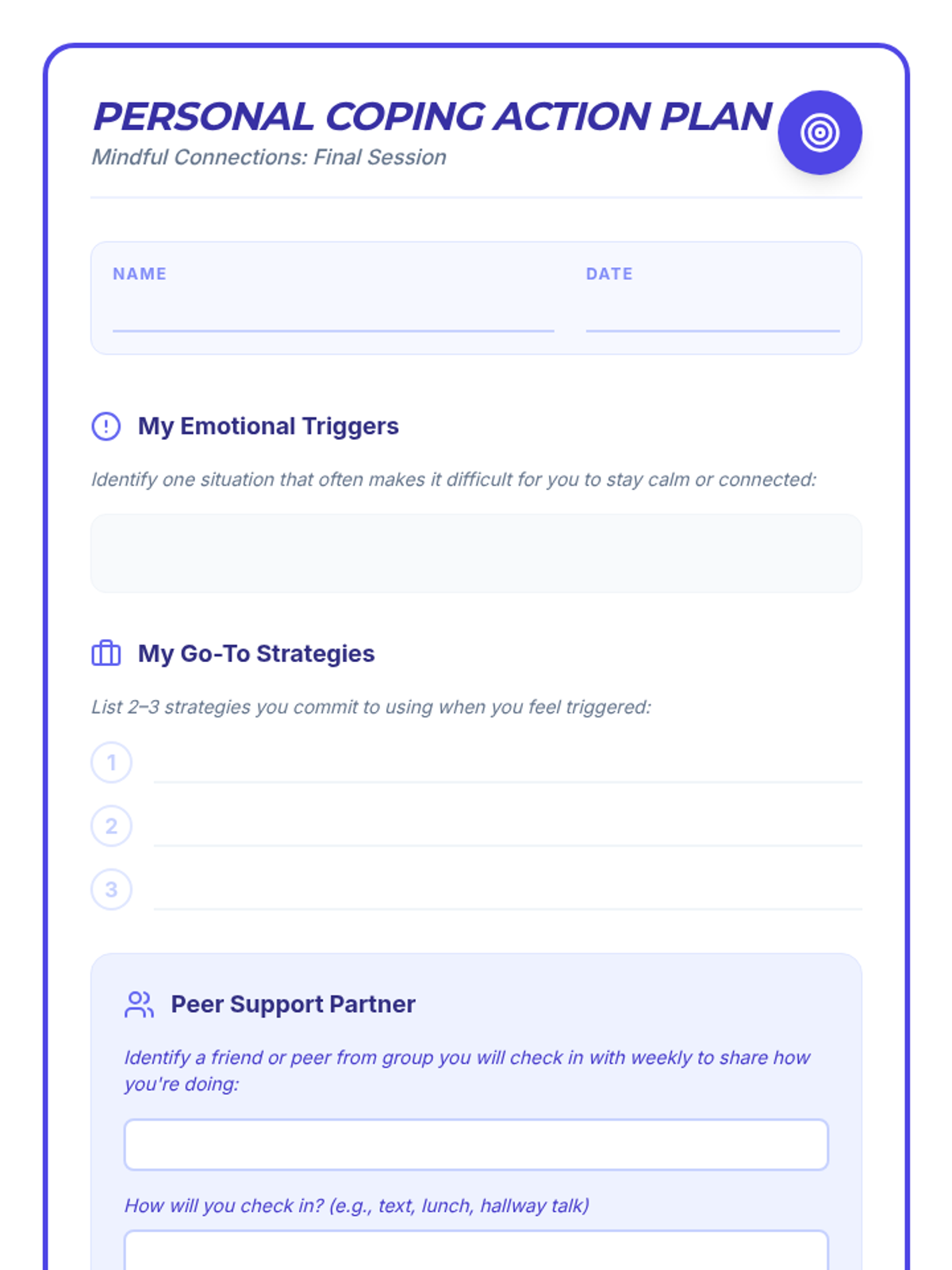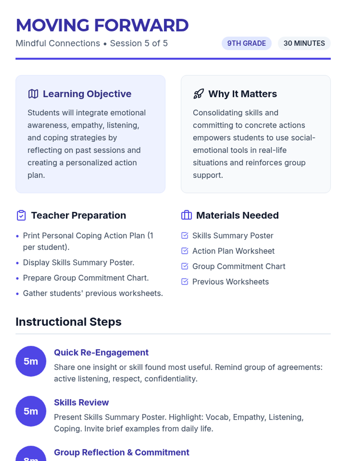A 5-session small-group program for 9th graders to develop social skills, emotional awareness, and healthy coping strategies.